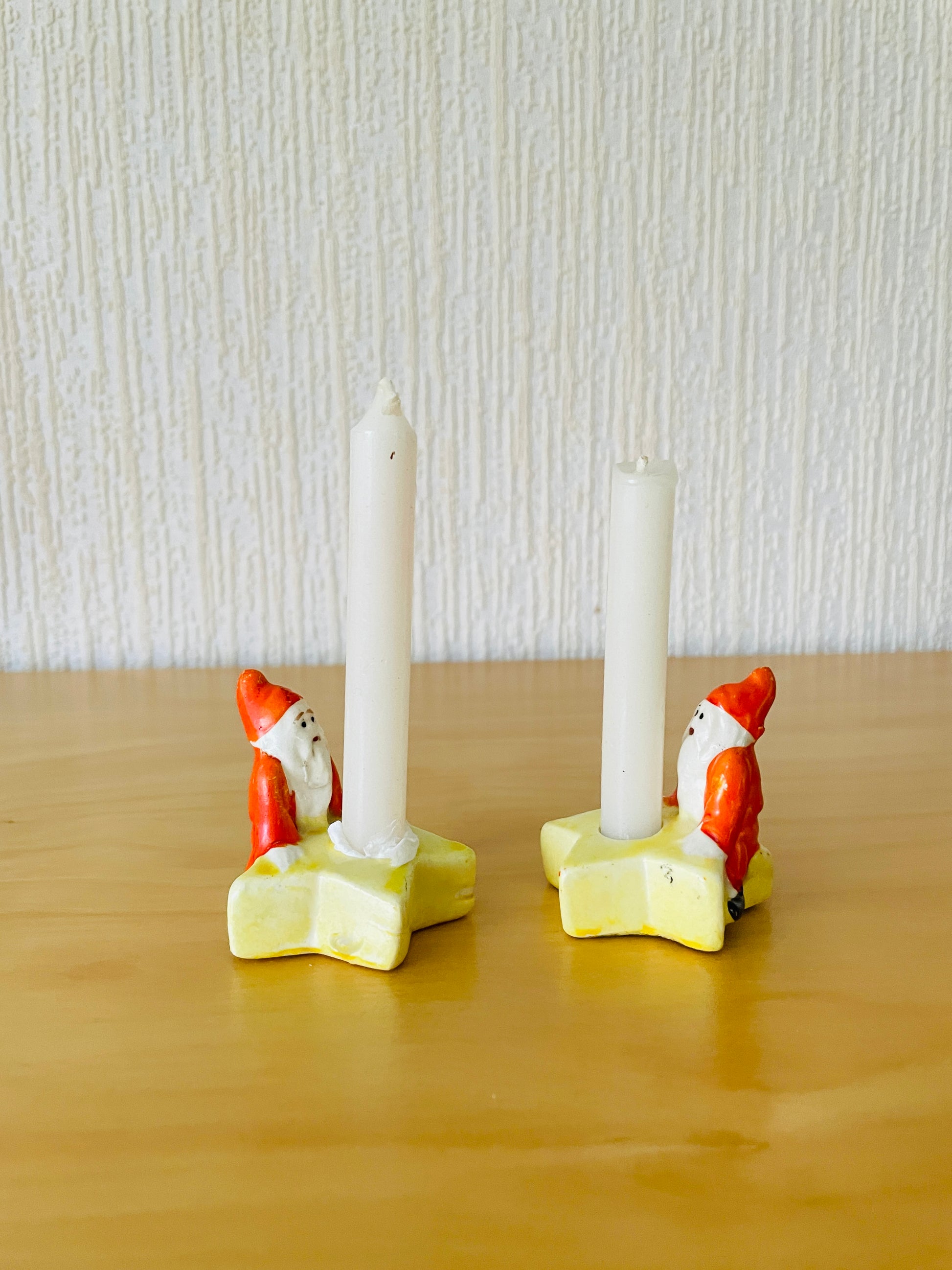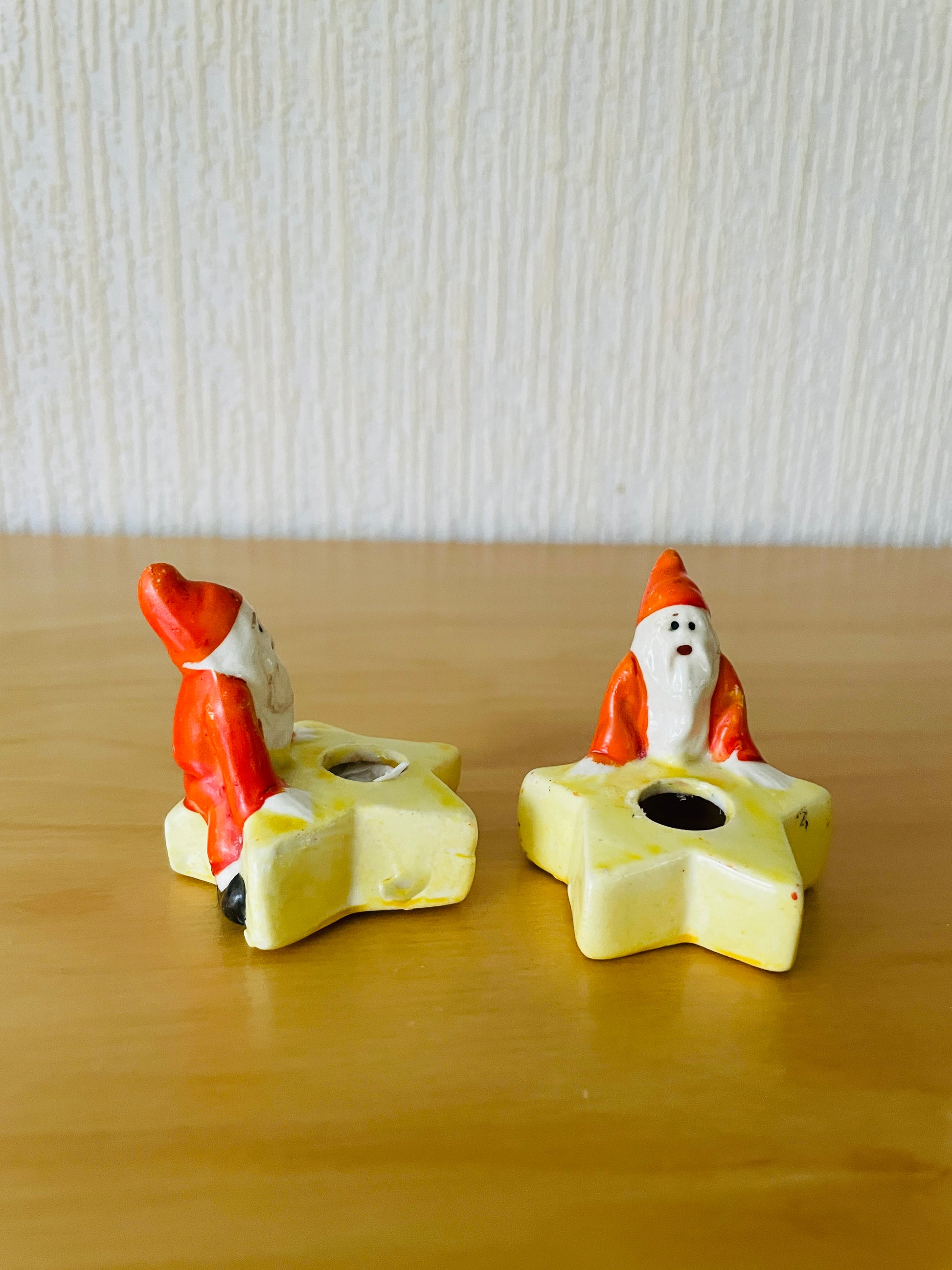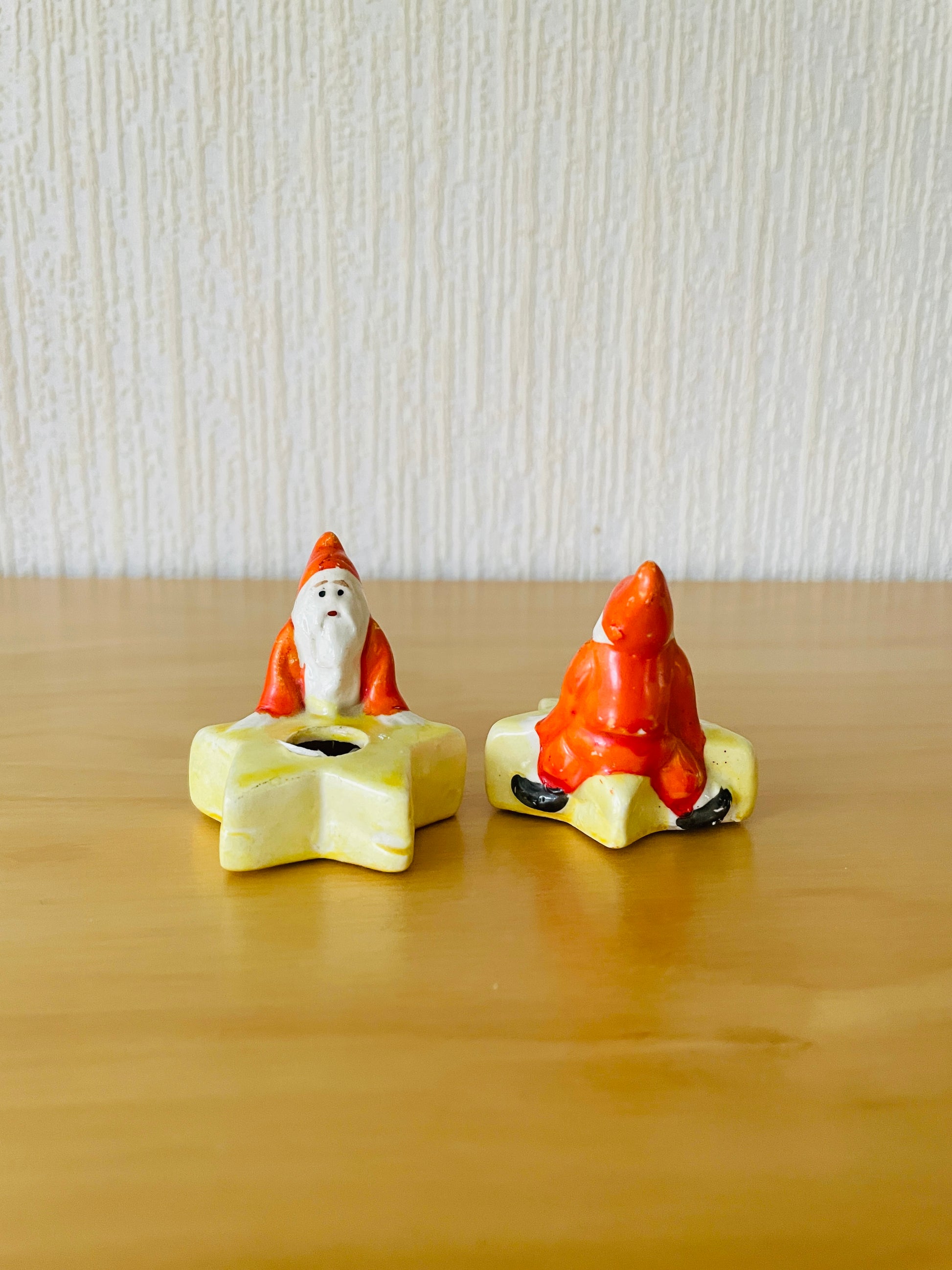 ミニキャンドルシリーズでサンタさんがお星様にまたガッている、とてもユーモラスなキャンドルスタンドです。後ろ姿がなんともキュートです。今回、色々なミニキャンドルスタンドをご紹介していますが、どちらも1900年代初期に日本より輸出されたハンドペイントのキャンドルスタンドです。当時は日本のハンドペイントのカップ&ソーサーやクリスマスに向けた飾り物などがとてもヨーロッパやスウエーデンの人たちに好まれていたようです。日本では売られていない物なので、とても希少なものになります。こちらに合うキャンドルをおつけします。2個の在庫があります。