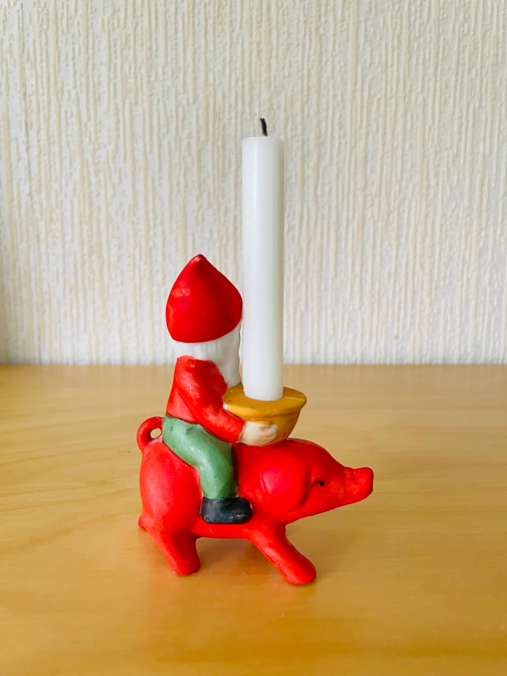 可愛いトムテさんが赤いブタに乗っている、セラミック製のキャンドルスタンドのご紹介です。北欧のクリスマスにはブタさんも欠かせない動物です。そのブタさんにまたがってキャンドルを抱えている可愛らしいキャンドルスタンです。こちらに合うキャンドルをおつけします。