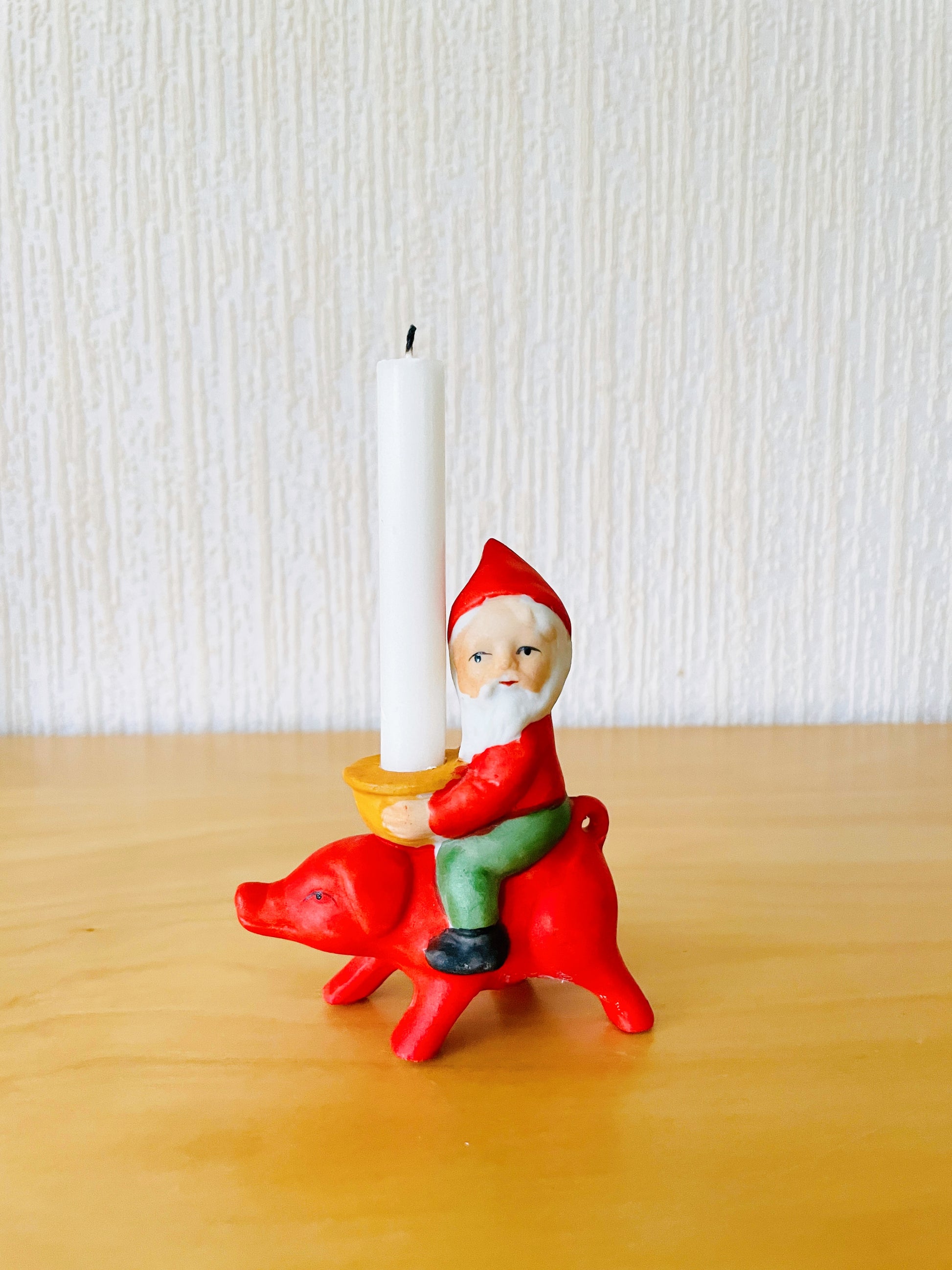 北欧のクリスマス/キャンドルスタンド/赤いブタさんに乗ったトムテ