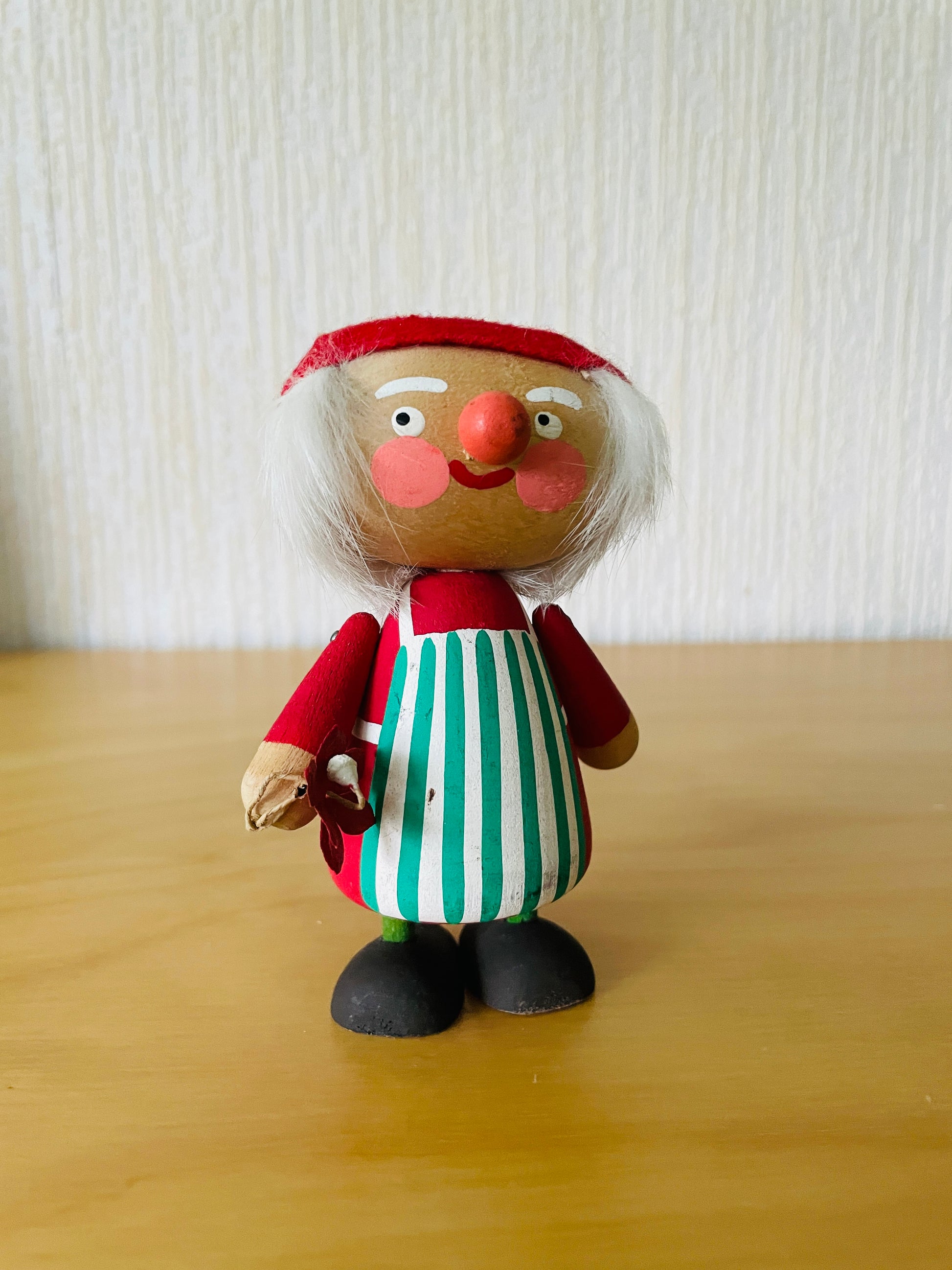ハンドメイドの木製で出来た、トムテのお母さん人形です。手が動くようになっていて、赤いお花を片手に持っています。緑の盾のストライプ柄のエプロンがとても似合っているトムテの母さんです。