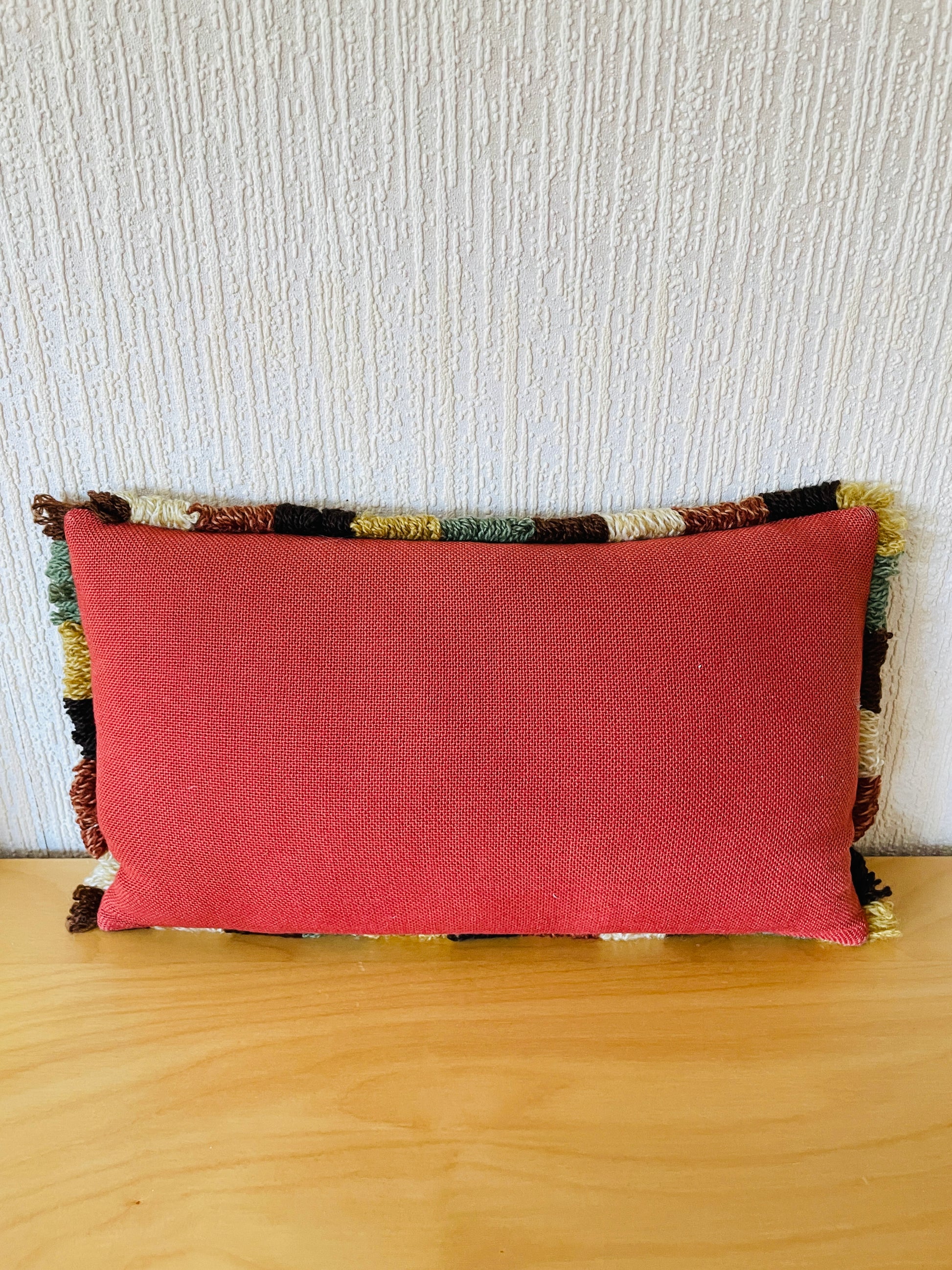 色合いもミントグリーンと淡いレンガ色が落ち着いていて、とても素敵です。横長タイプのクッションはおすわりになる時、ちょうど腰の窪みの部分に当てると、とても楽です。フリンジがループ状でダブルになっています。