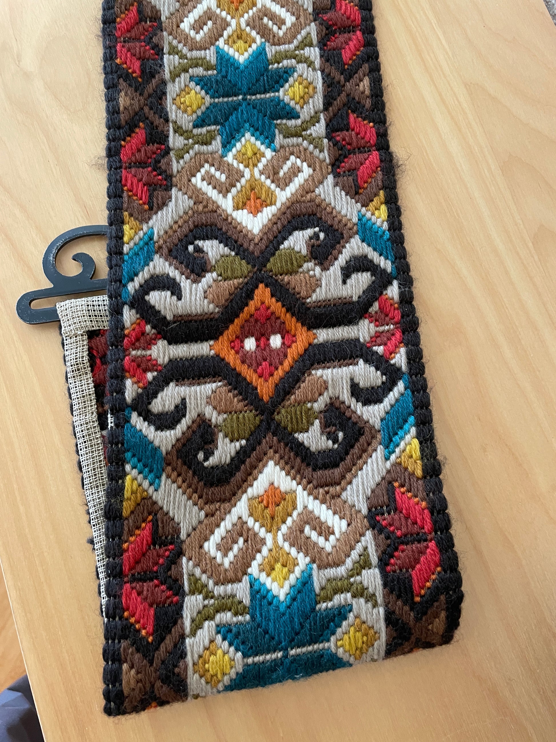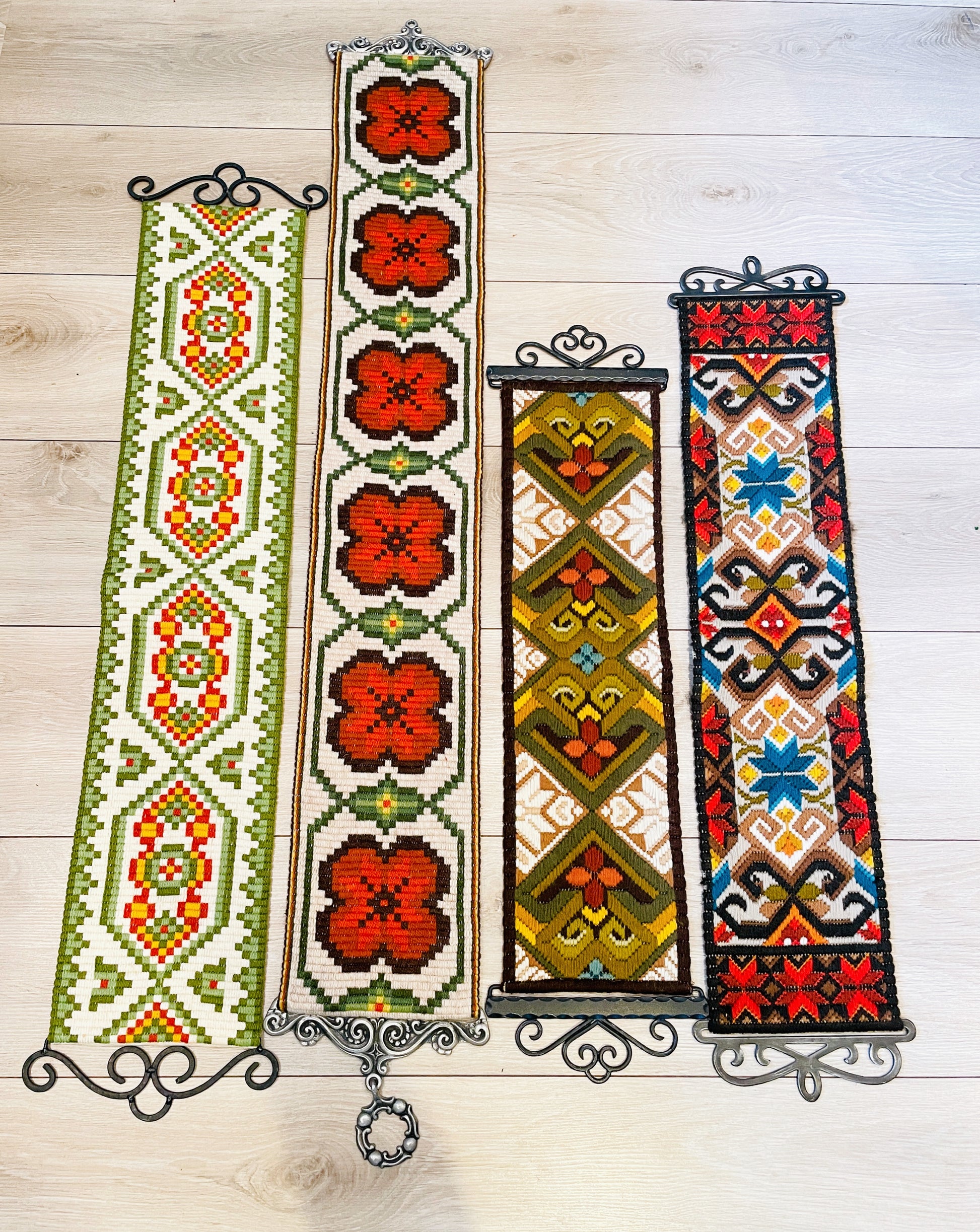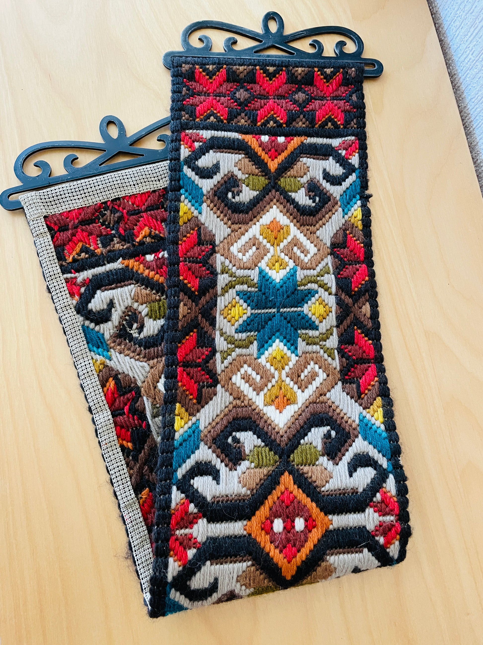 スゥエーデンの伝統手工芸品でAlmoge/アルモーゲーというスウエーデン伝統古典柄をウールの糸で刺繍をしたタペストリーのご紹介です。Plattsöm/プラットスムという技法で丁寧にぎっしりと刺繍されています。金具もとてもデザインの込んでいる真鍮で作られている物です。