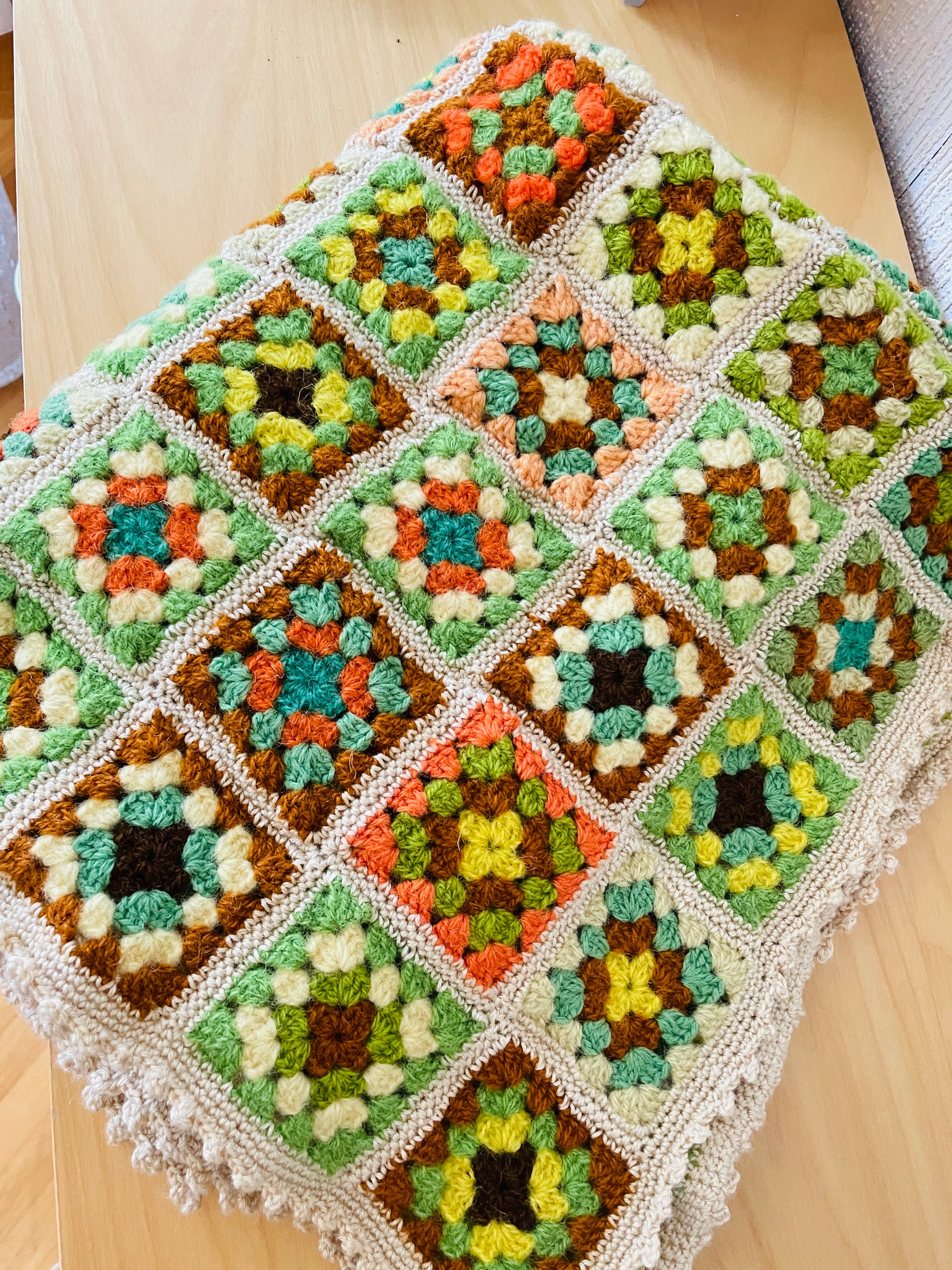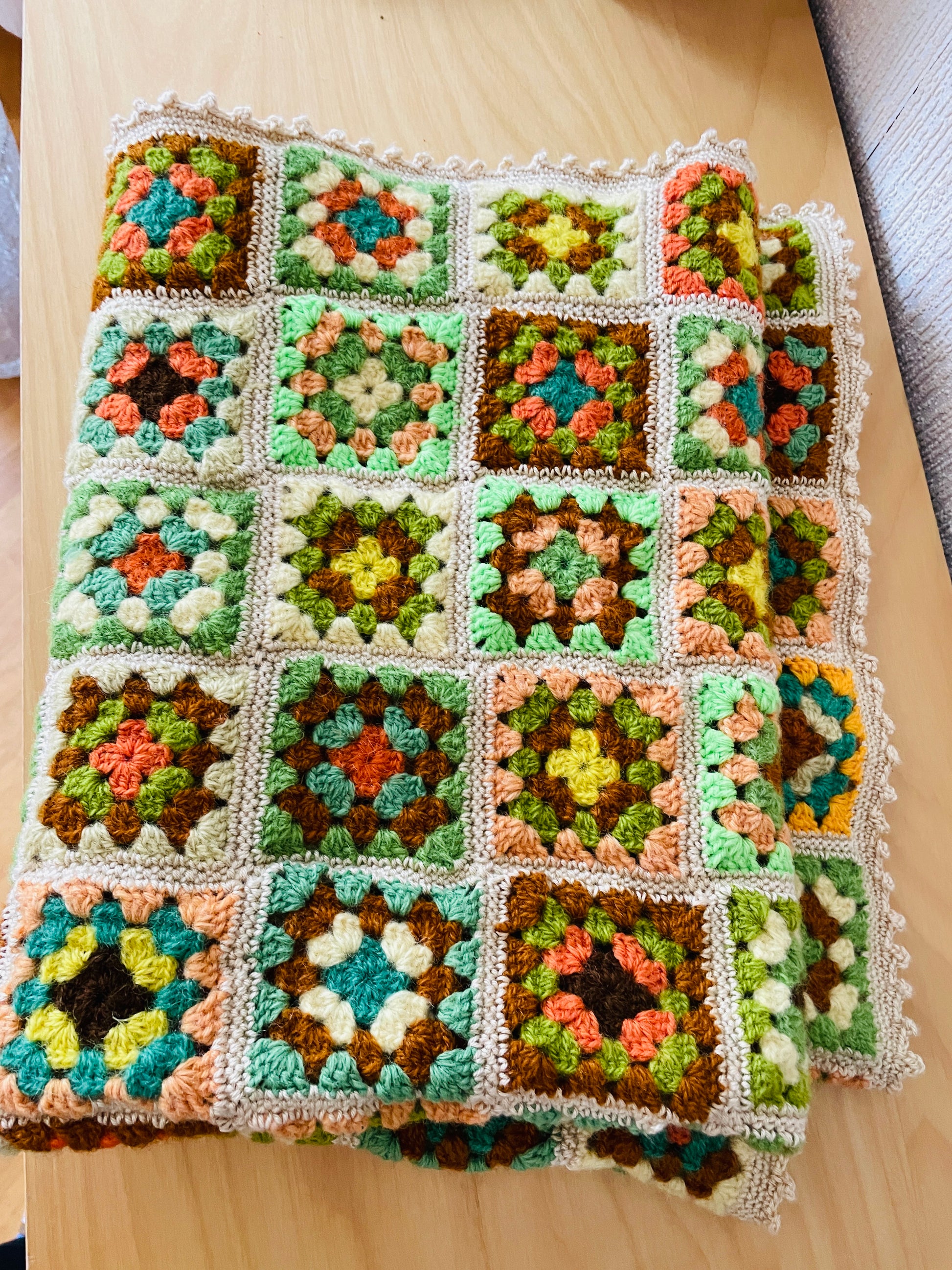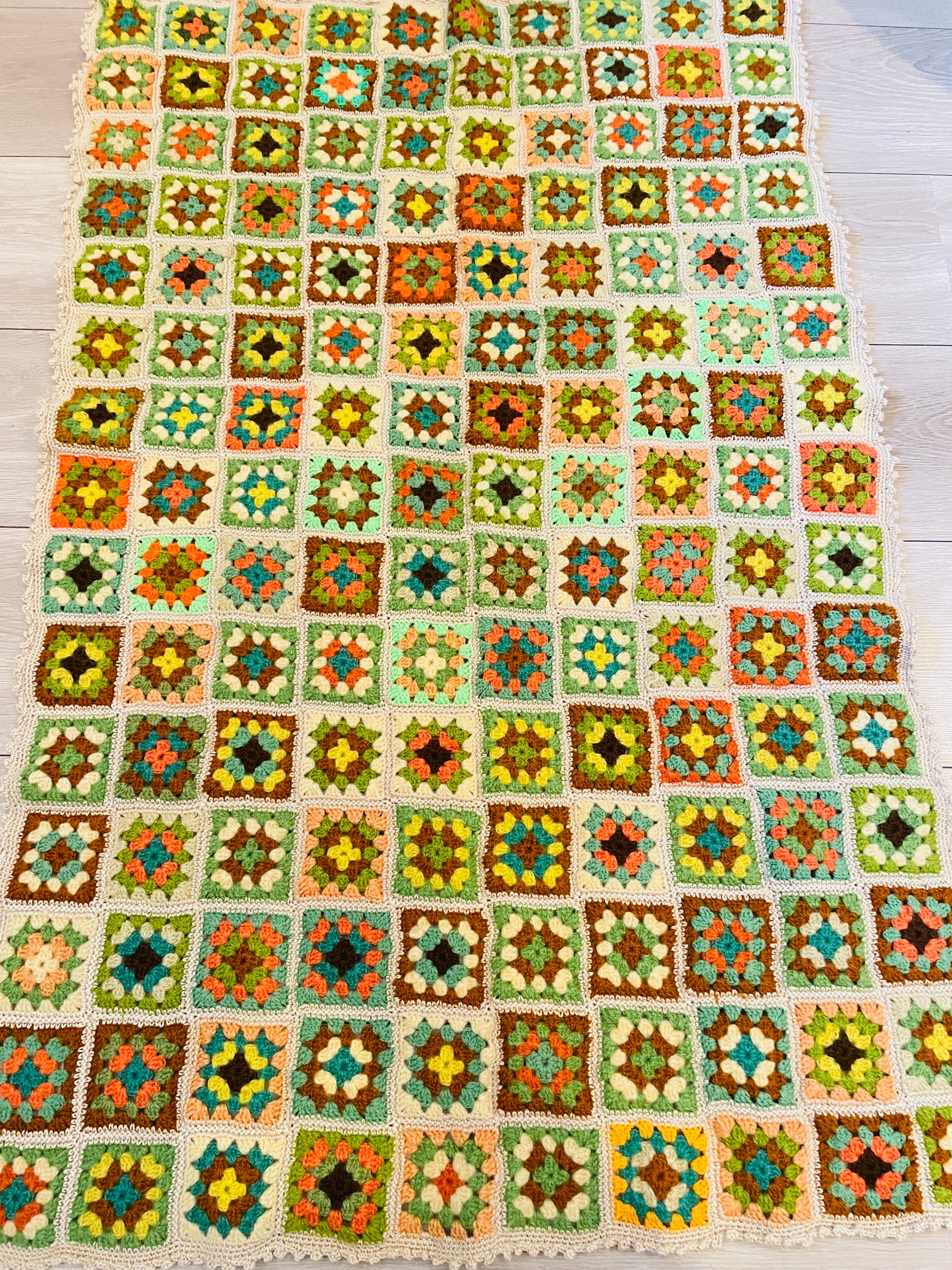 北欧手工芸/Mormors Rutor/手編みの膝掛け/パッチワーク/174cm x 74cm