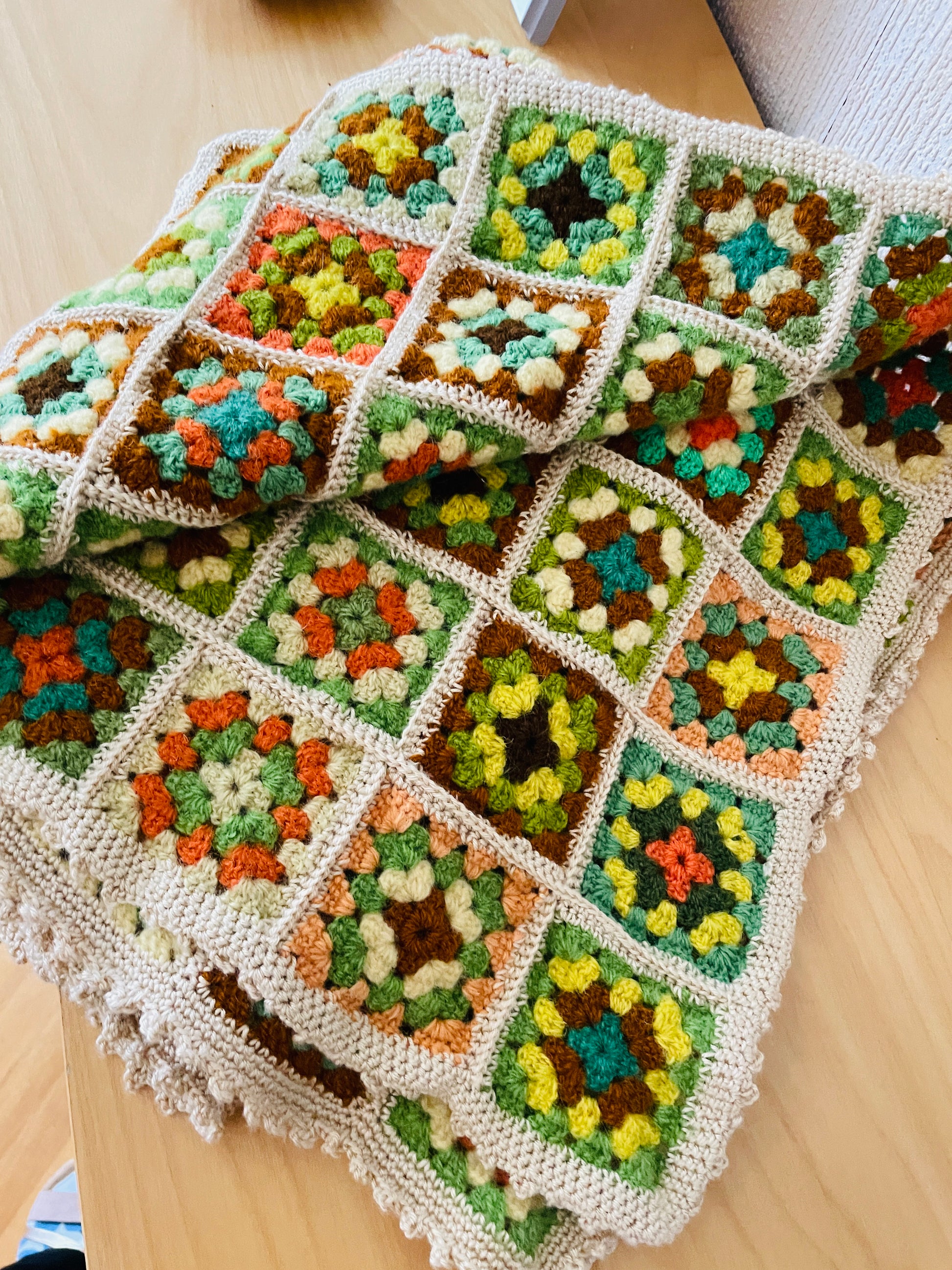 Mormors Rutor/こちらではスウエーデン語でおばあちゃんのボックスと言う呼び名がついた、鍵編みのパッチワークで繋げて完成した膝掛け又はブランケットのご紹介です。ベージュの意図で繋げていった、落ち着きのある色合いが素敵です。ソファでまたはお子様のベットカバーとしても、お使いになれます。