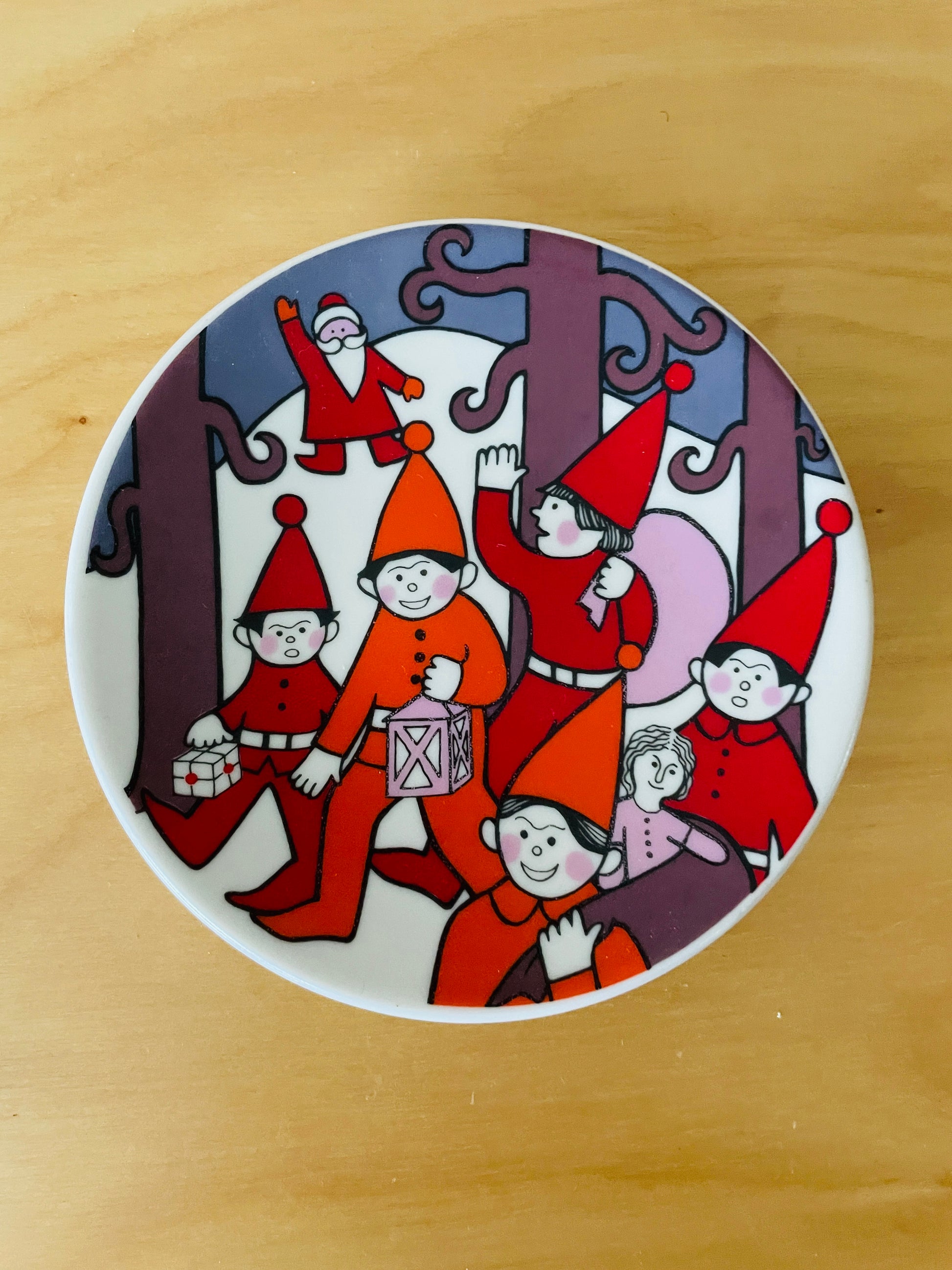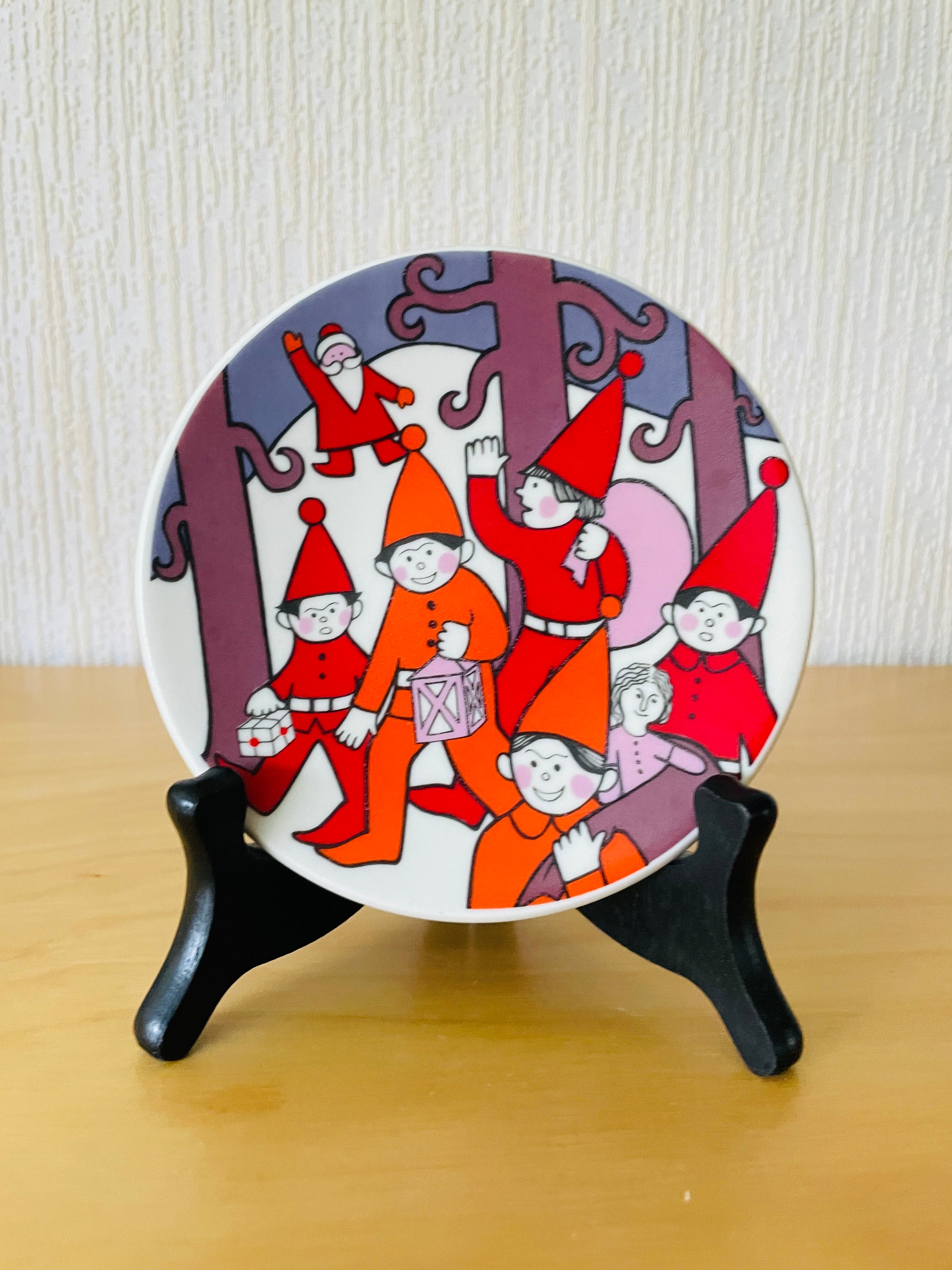 Arabia/アラビアより壁に飾れる様になっているクリスマスミニプレートのご紹介です。こちらはクリスマスカードとして販売された陶器の可愛らしいクリスマスモーチーフのミニプレートです。デザインはライヤウオシッキネンです。フインランドのクリスマスの生活や子供たちの可愛らしいデザインが魅力です。