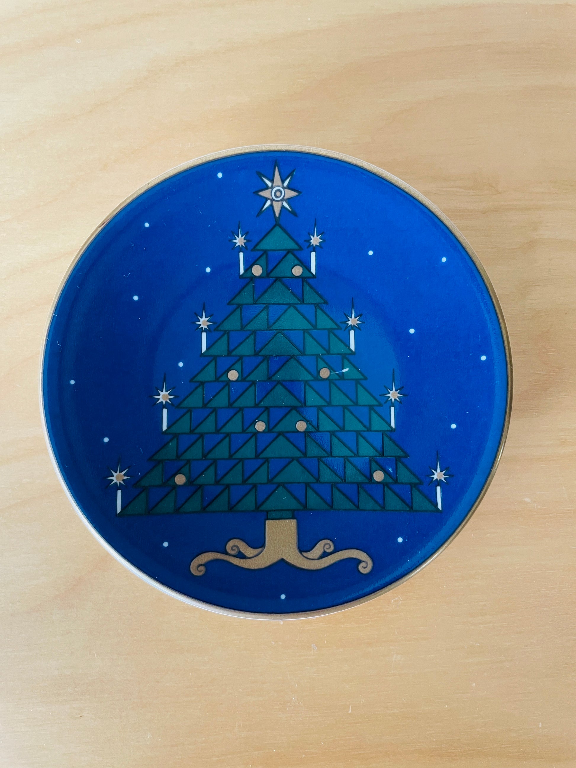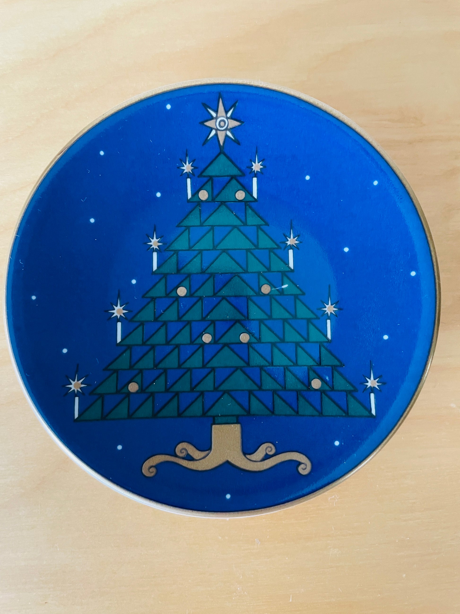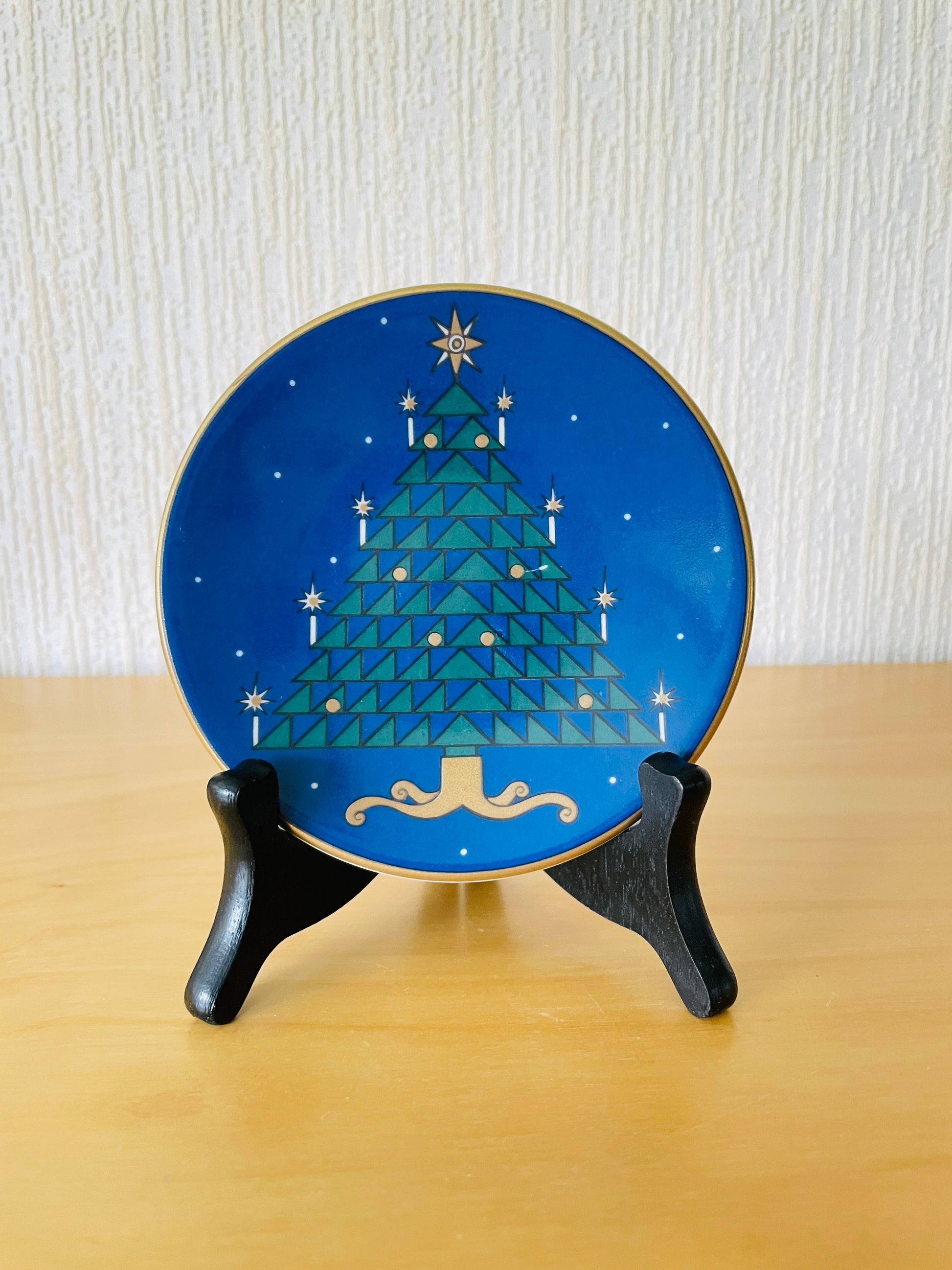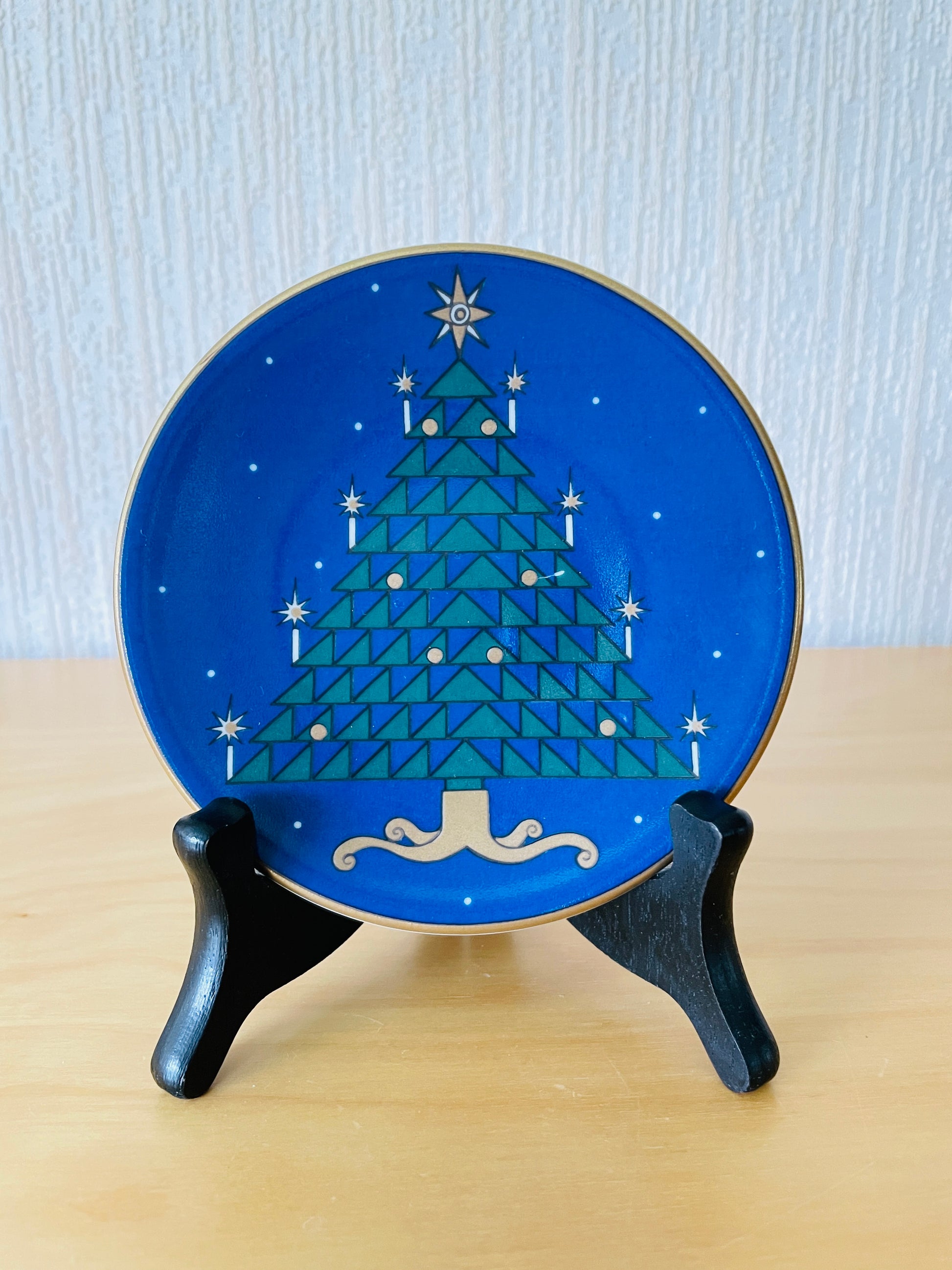 Arabia/アラビアより壁に飾れる様になっているクリスマスミニプレートのご紹介です。ミッドナイトブルーに周りにはお星様がキラキラ、大きなクリスマスツリーがデザインされている素敵なミニプレートです。