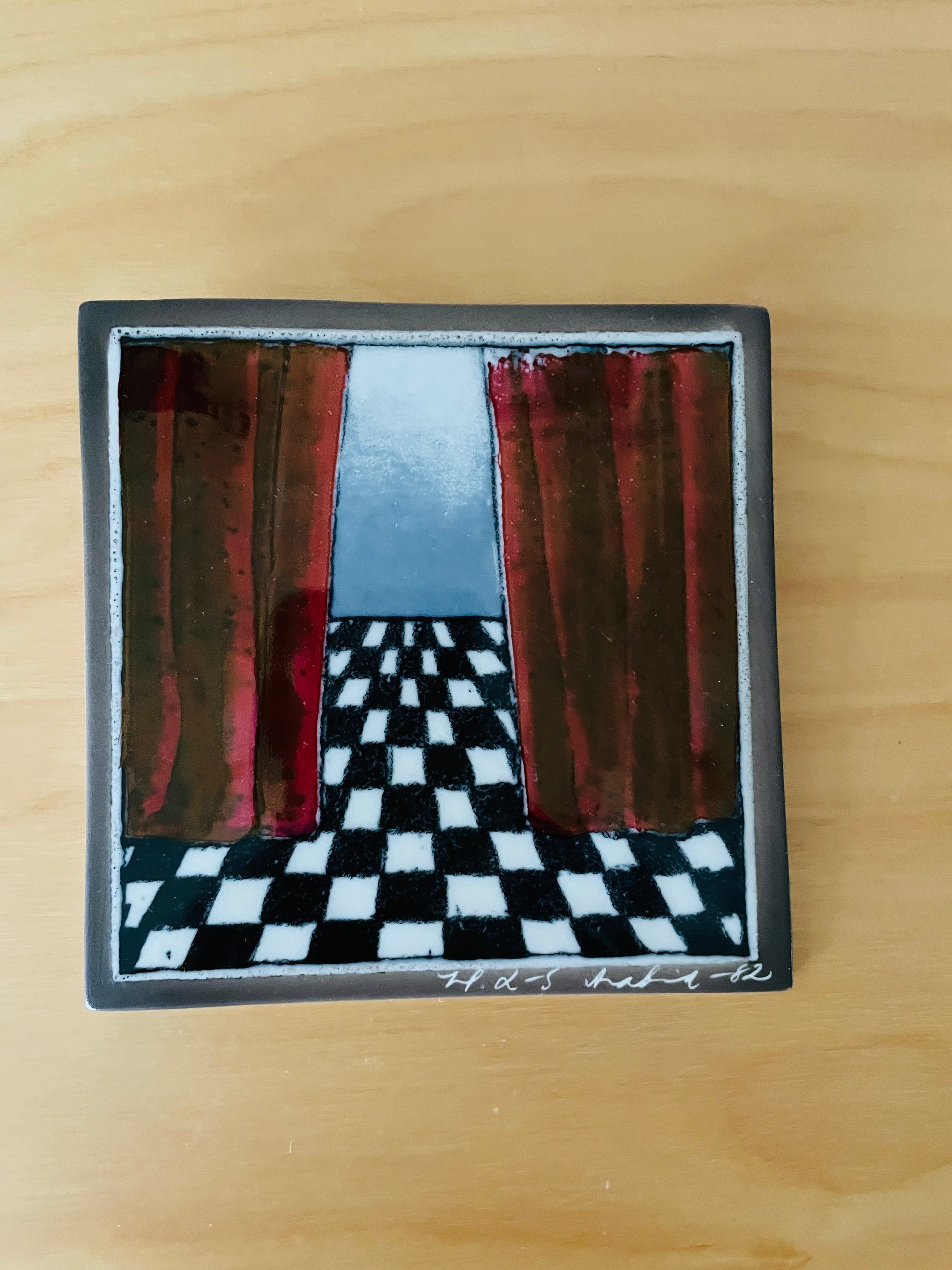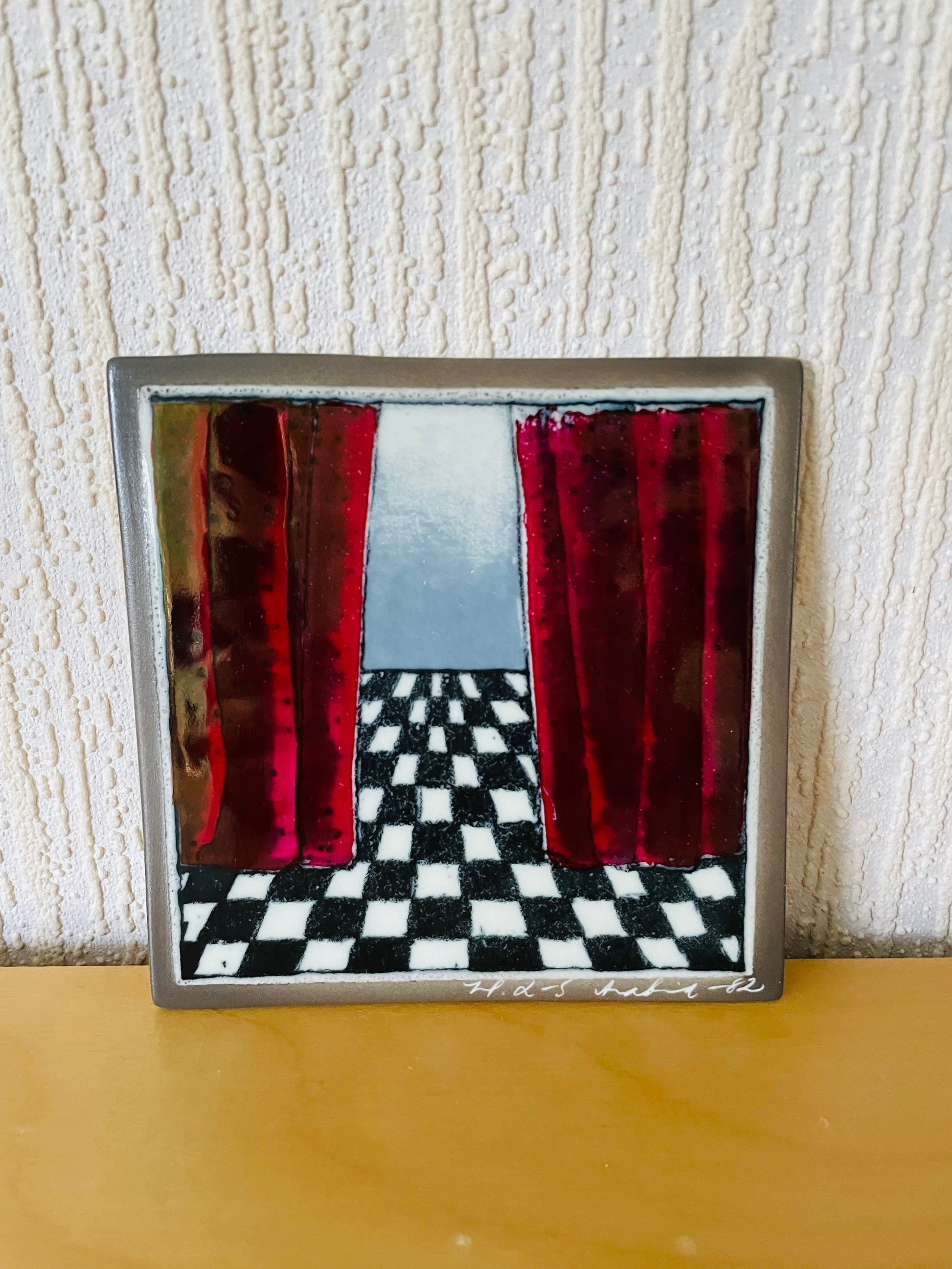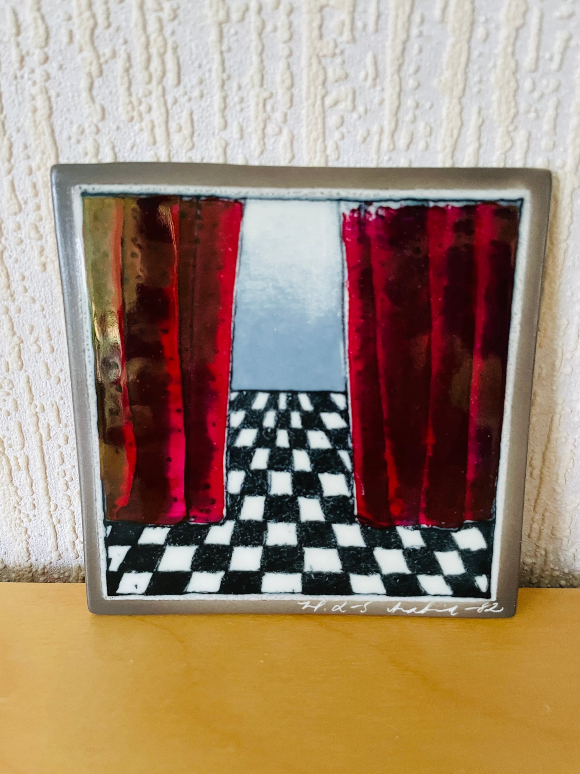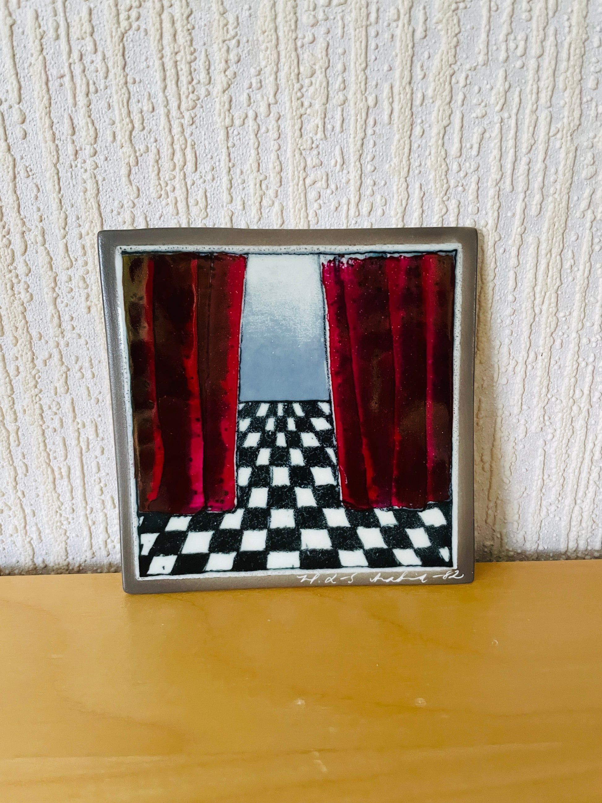 こちらはアトリエでの製作で、ハッとするような真紅の長いカーテンが白黒のモザイクの床に降りて、何かステージがこれから始まるような情感のある、色合いも北欧らしい、とても素敵な陶板です。