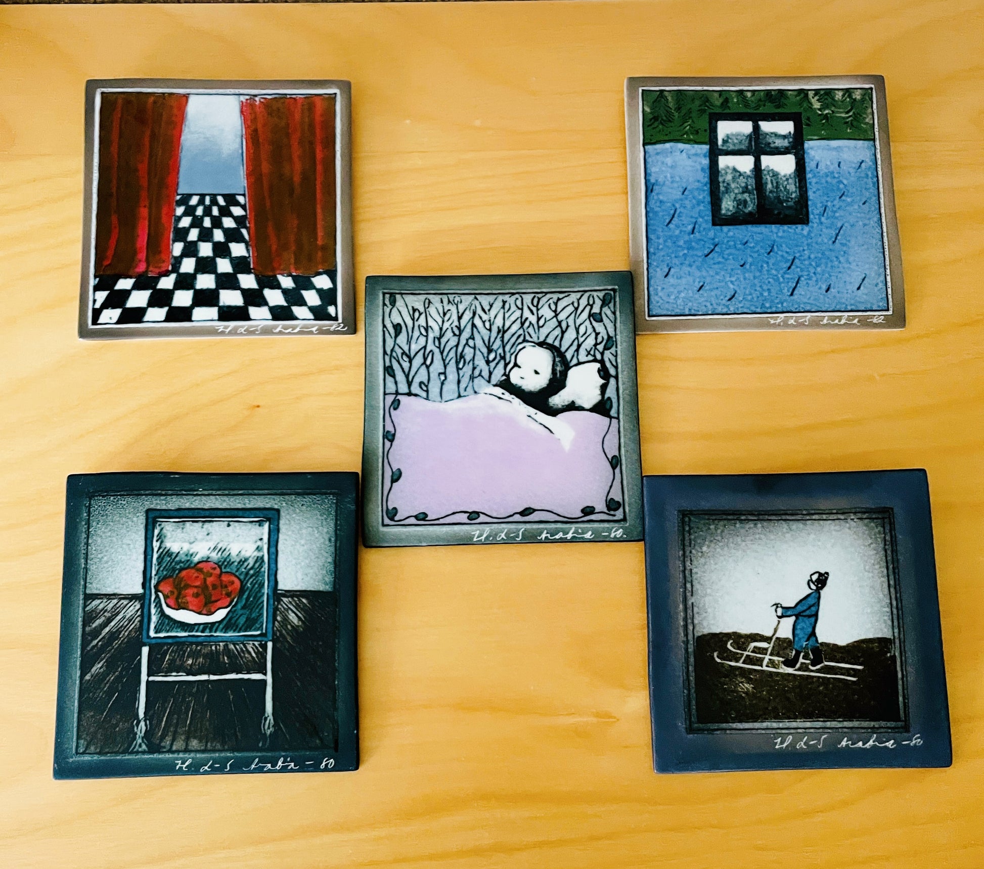 彼女は1962年にアラビア社に入社し、1967年にアート部門に移動したくさんの陶板を制作しました。2000年ごろまでに200種類近くもの作品を生み出しました。