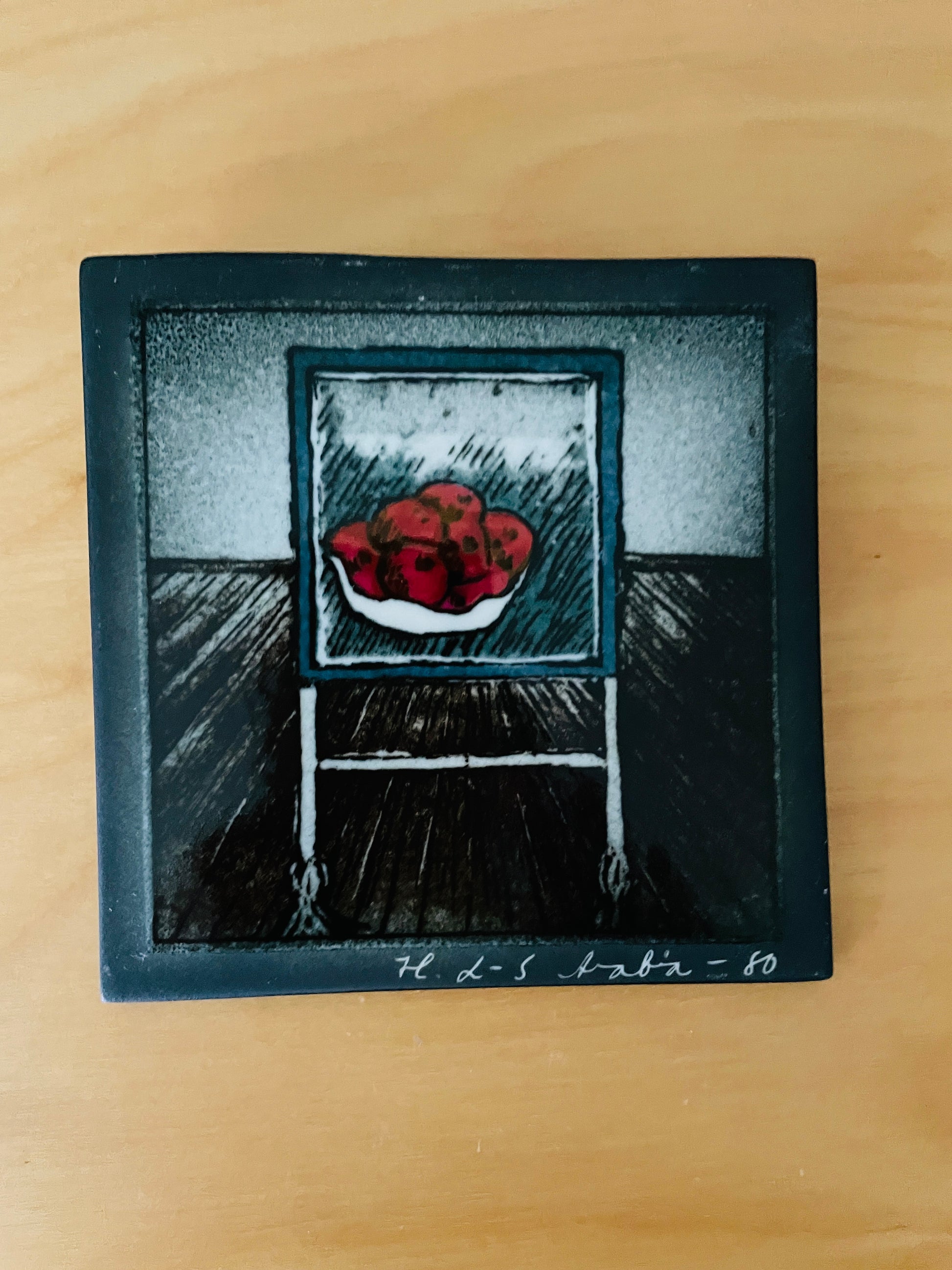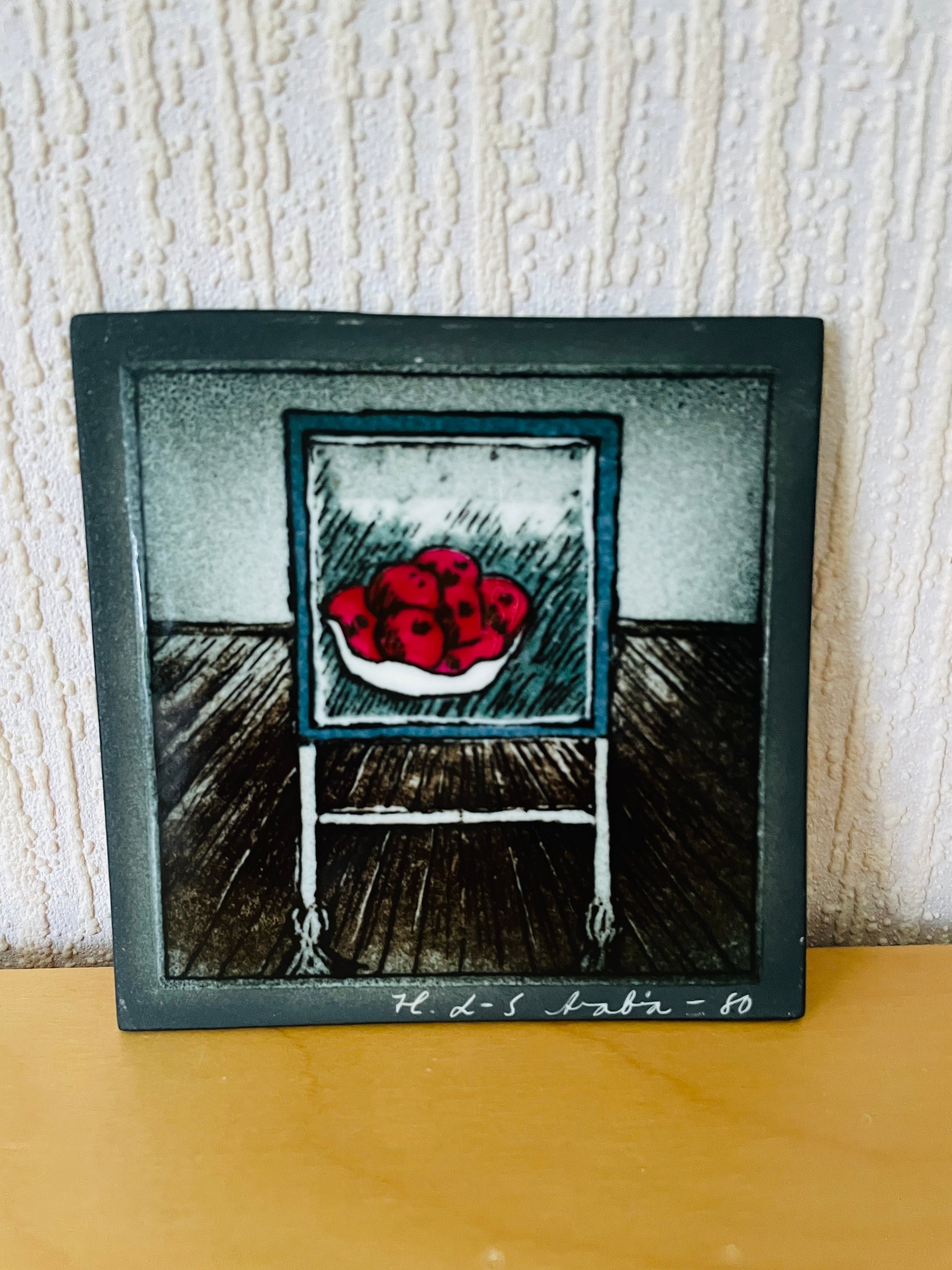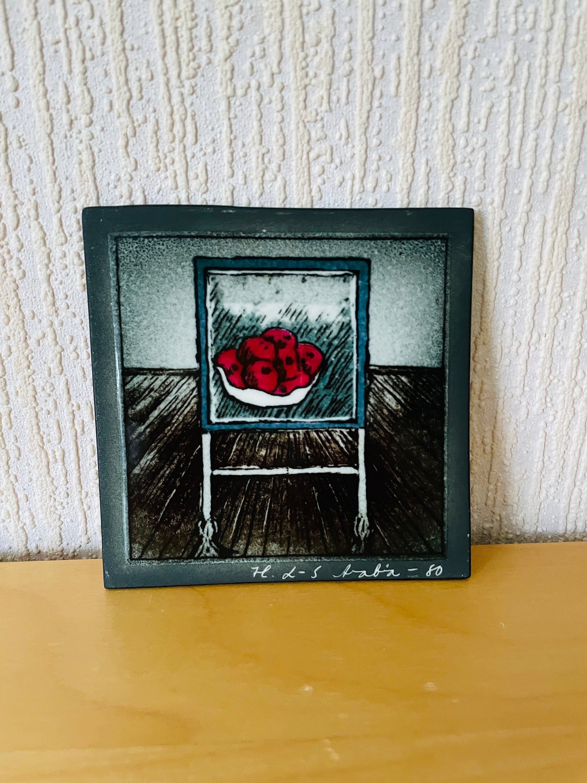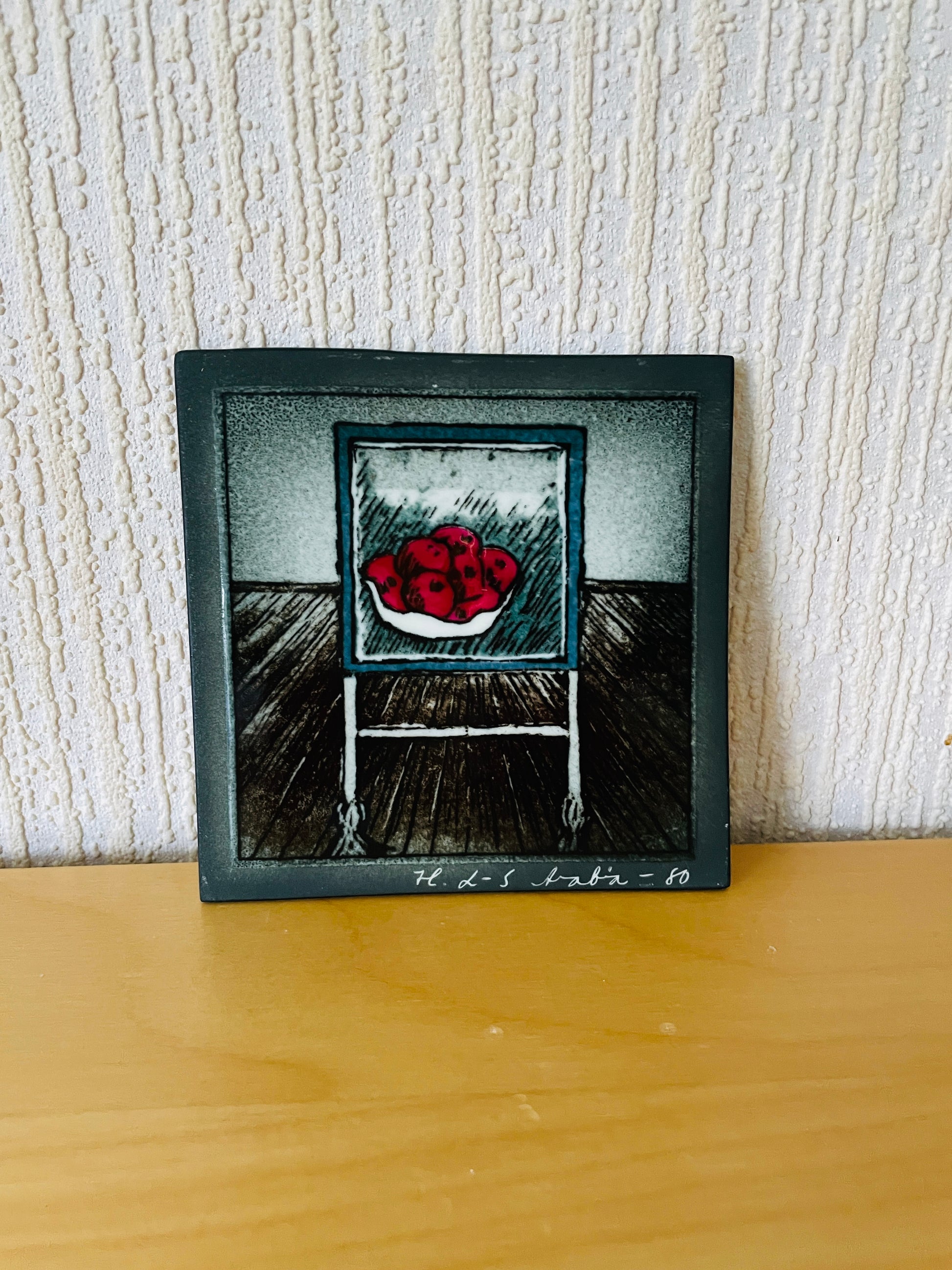 こちらはアトリエでの製作で、リンゴの赤い色がパッと目に写ってよく見ると暗い大地の中上にスーッとその絵が立っている情感のある、色合いも北欧らしい、とても素敵な陶板です。ご自分でご自身のスートーリーを描いてみてくださいね。