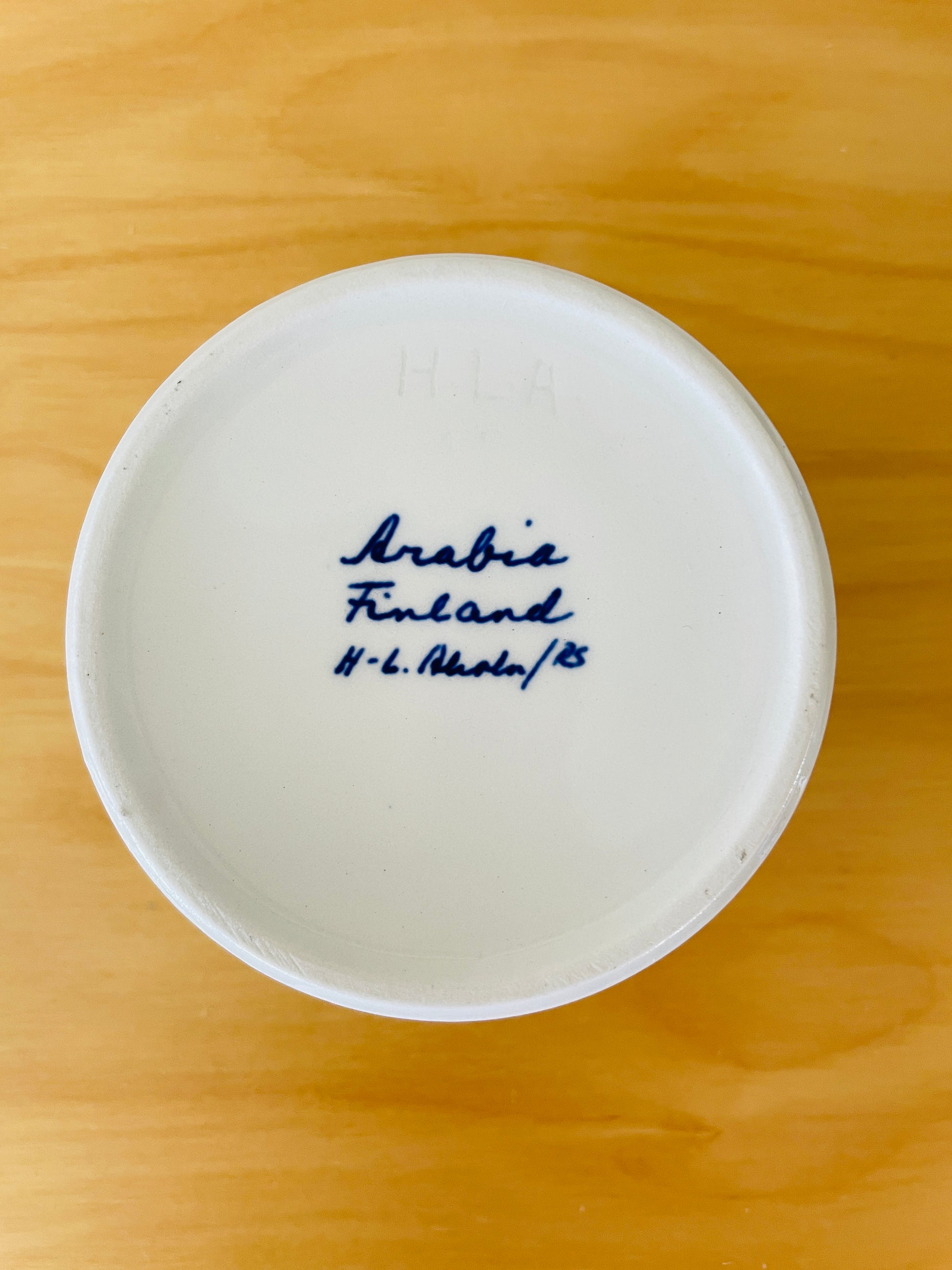 Arabia/アラビアよりHilkka-Lisa Ahola/ヒルッカ-リーサ.アホラがデザインした、とても珍しいハンドペイントの蓋付ポットのご紹介です。