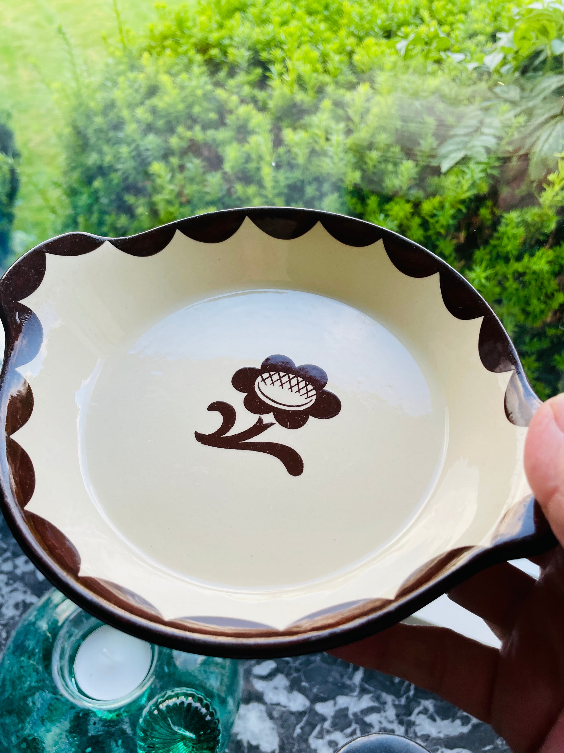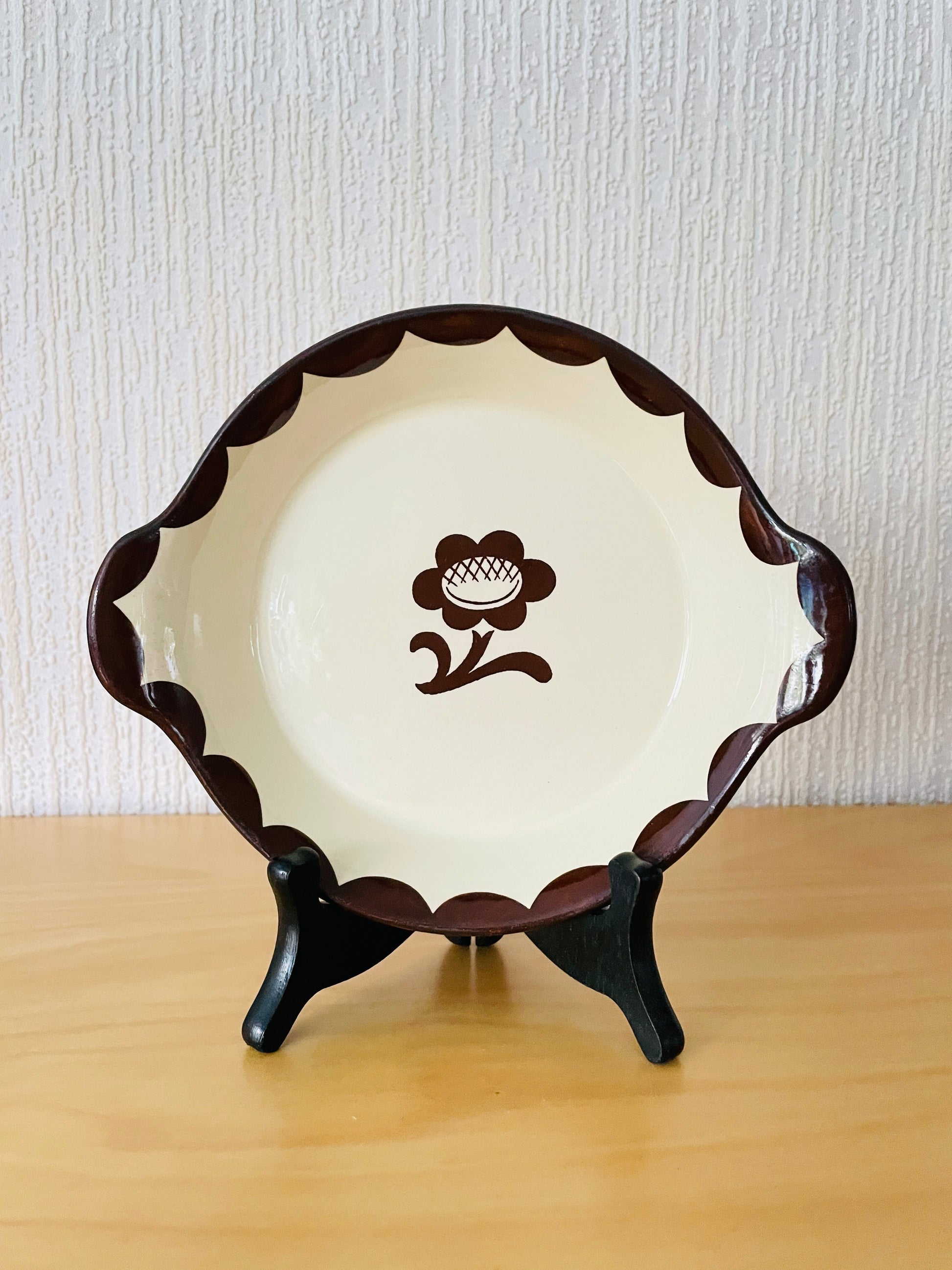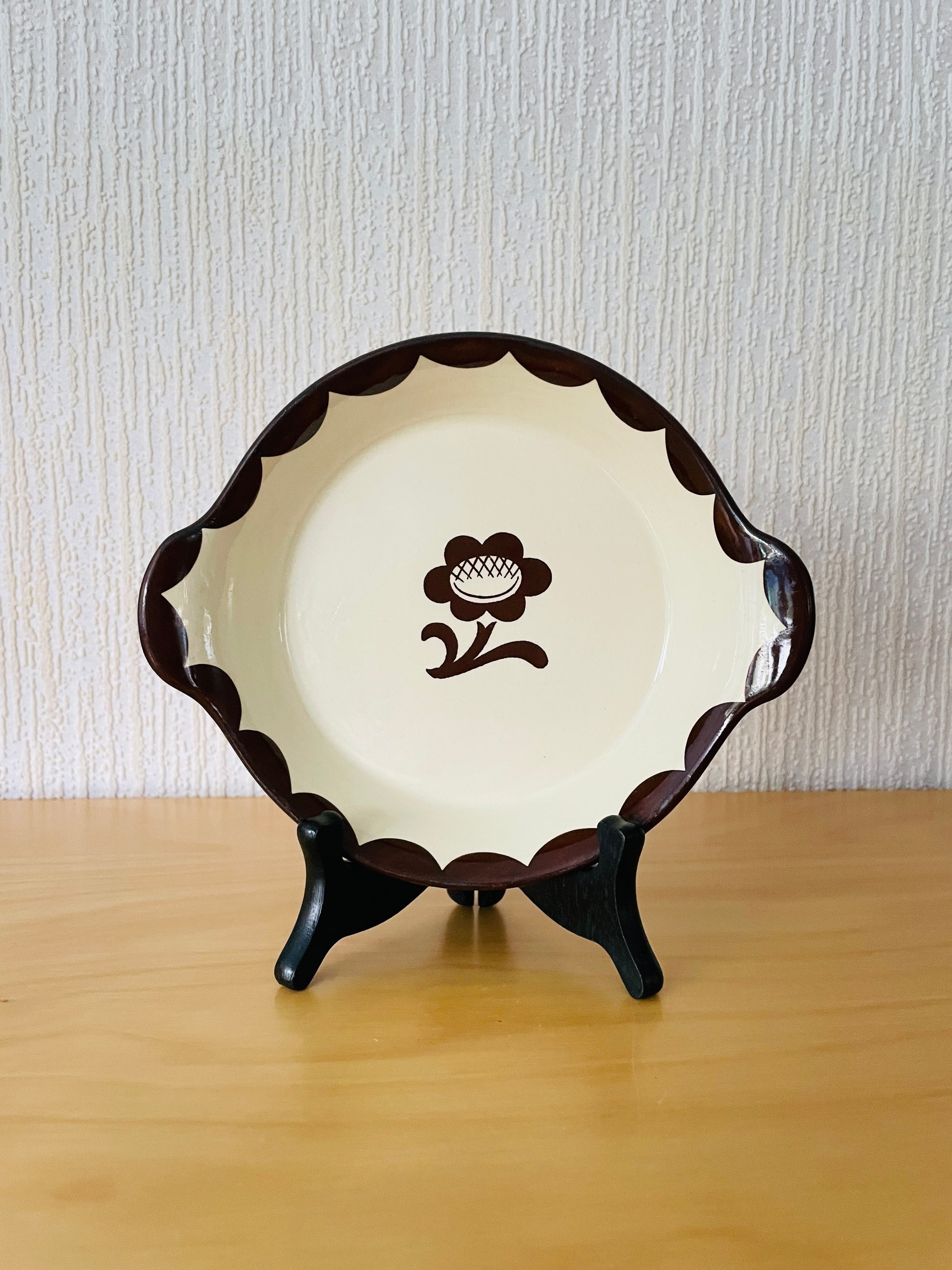 こげ茶色のお花とほかにもグリーン、ブルーの色違いもあります。1930年に、ピューロはその頃では画期的なオーブンデイッシュを売り出しました。