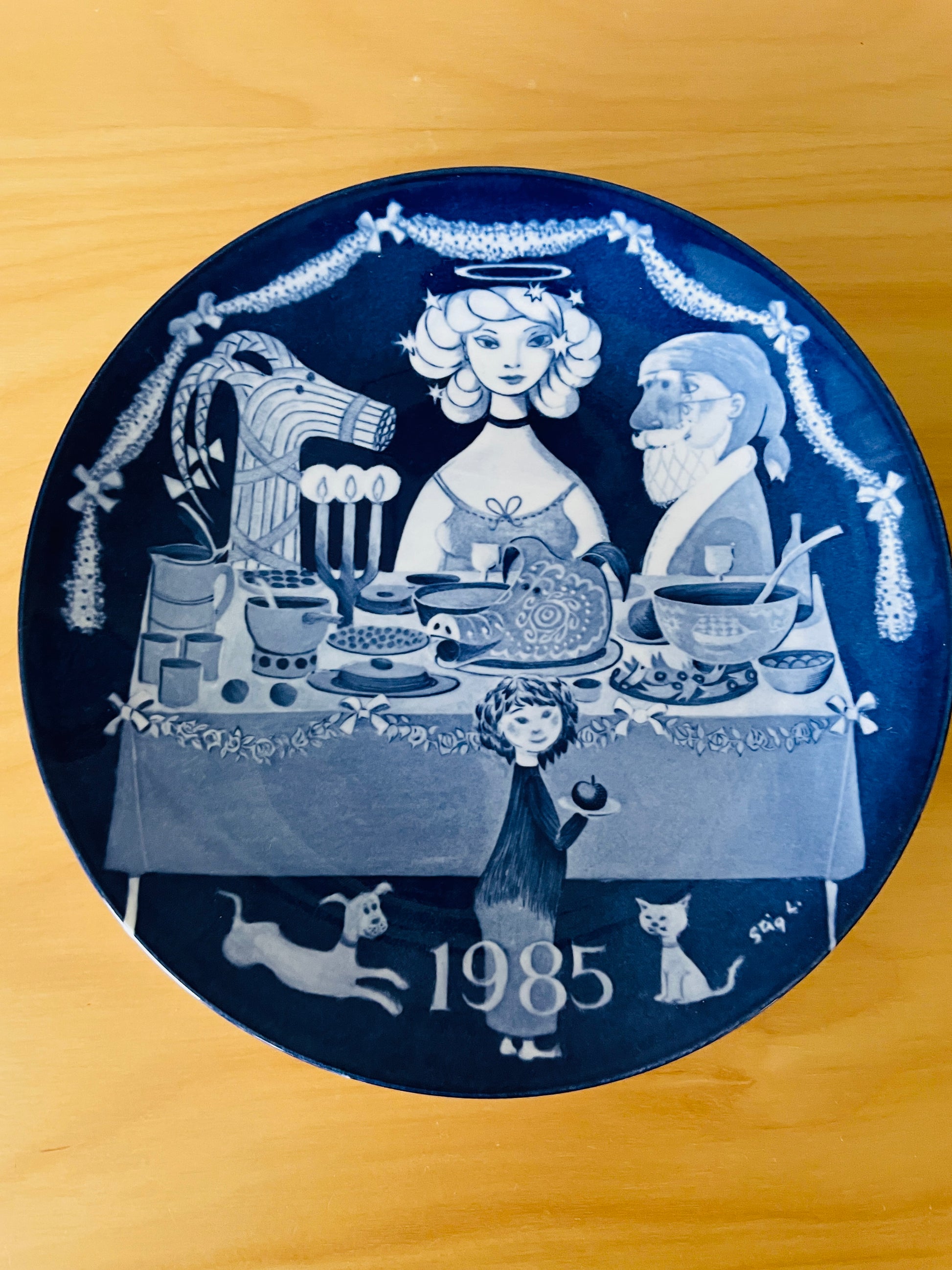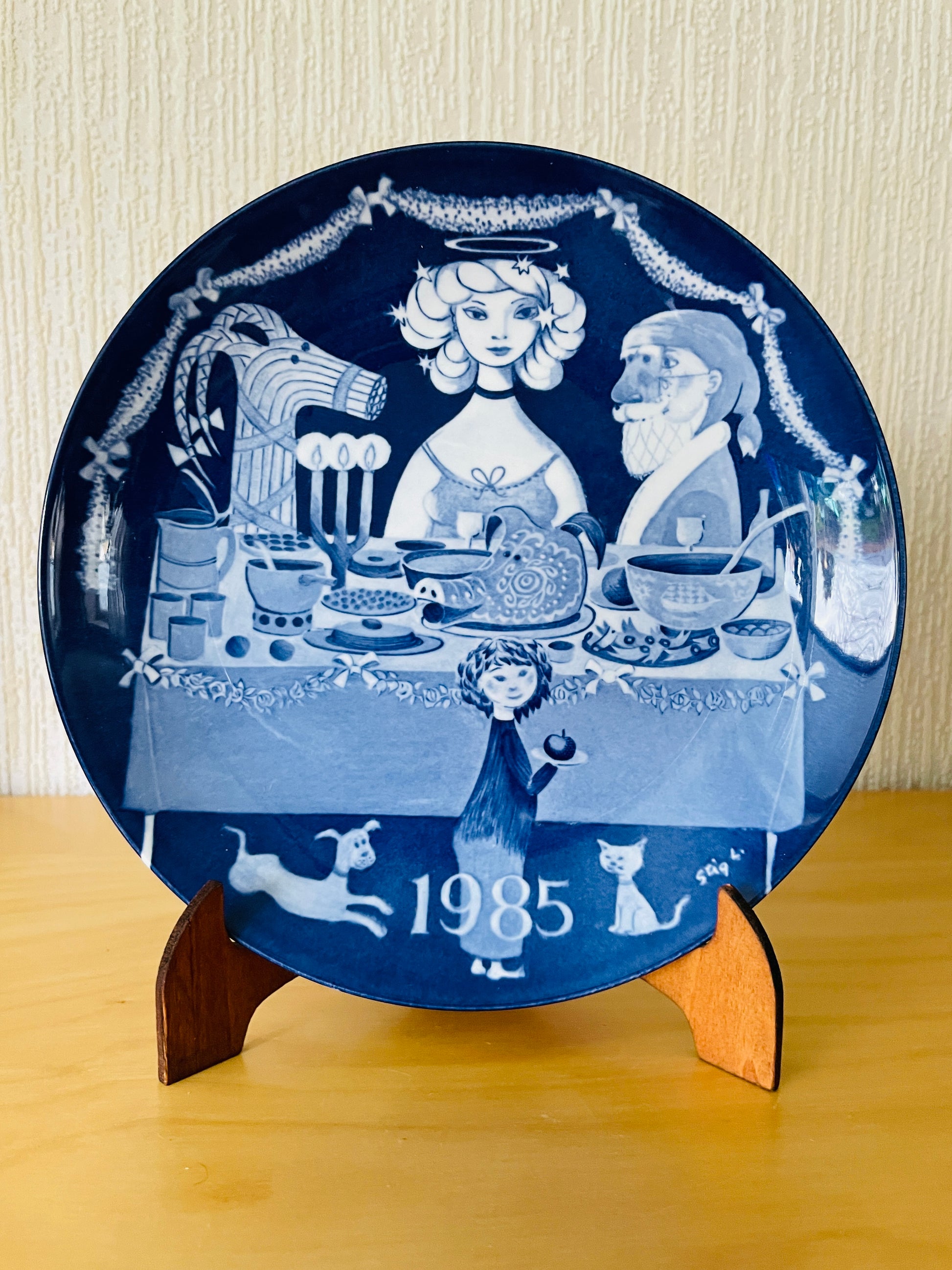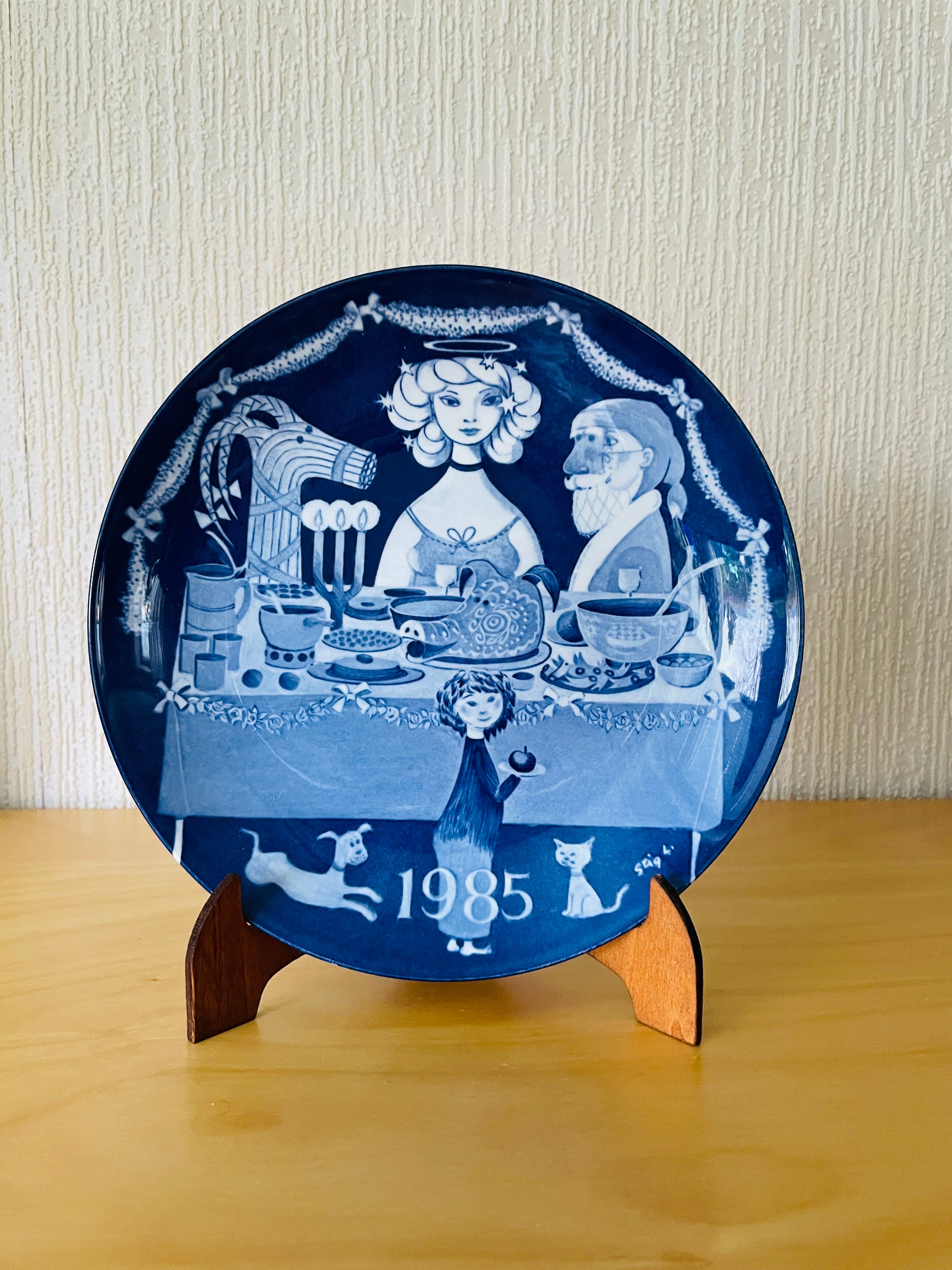 Gustavsberg/グスタフスベリStig Lindberg/ステイグリンドベリがデザインした1985年度のクリスマスプレートです。 1981年から1985年まで製作されたシリーズになります。クリスマスの食卓を囲みトムテやユールボック、マリア様でしょうか、リンドベリらしい独特な世界観のある、クリスマスプレートです。