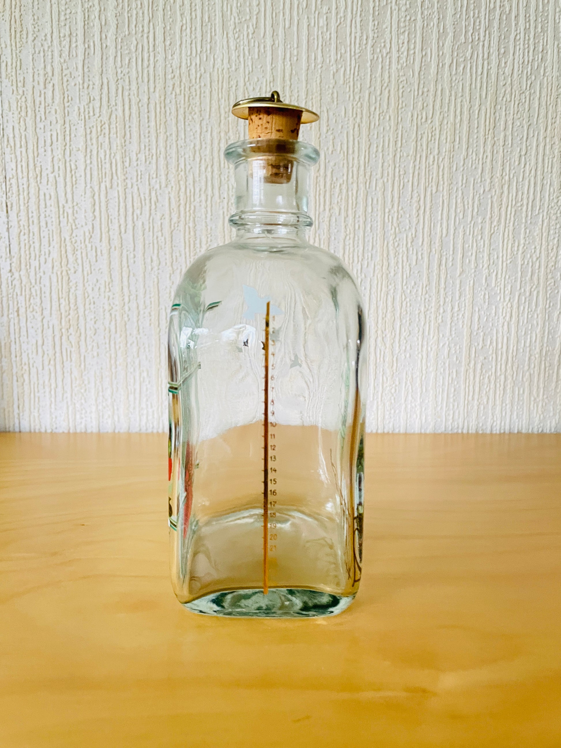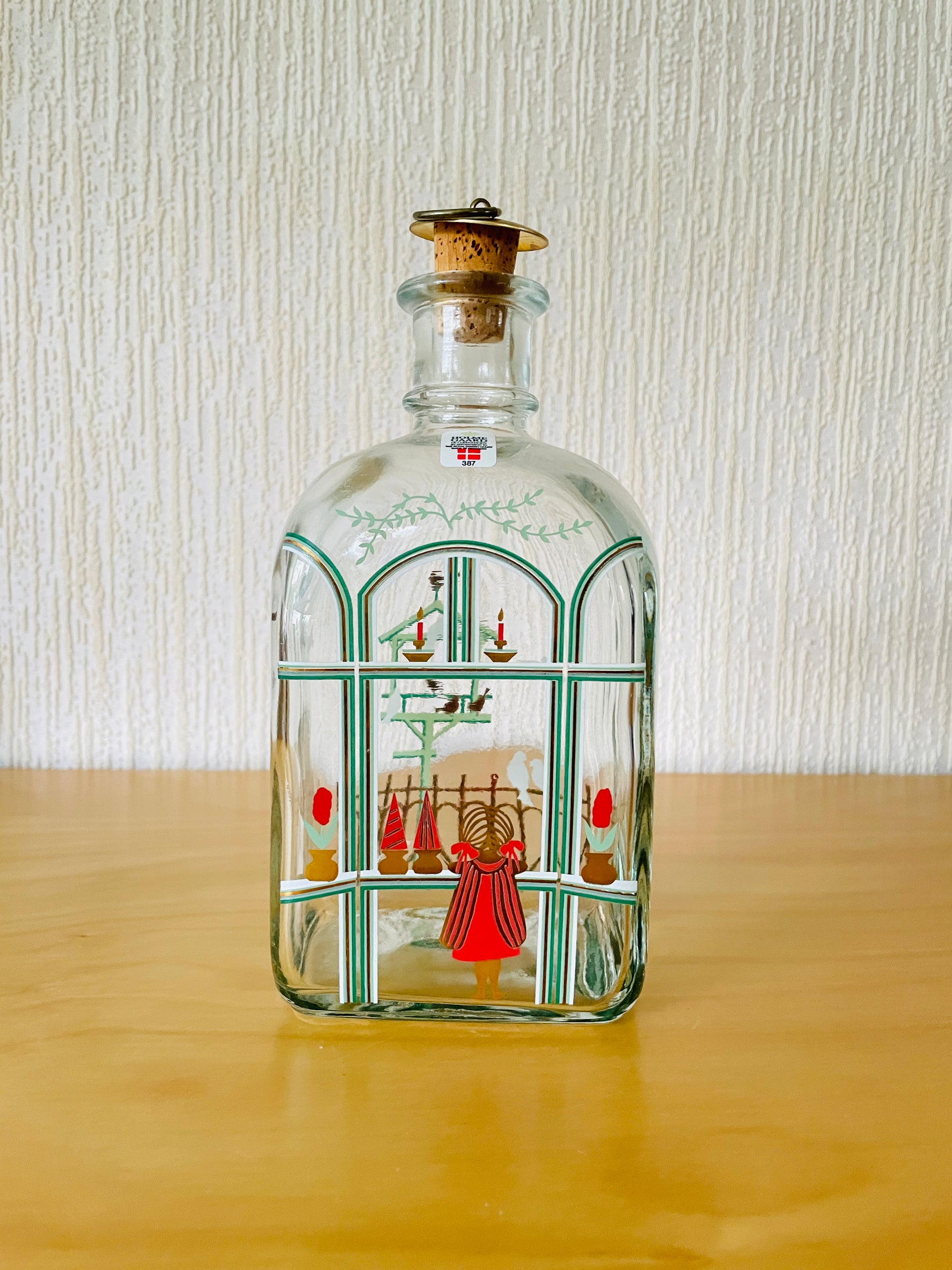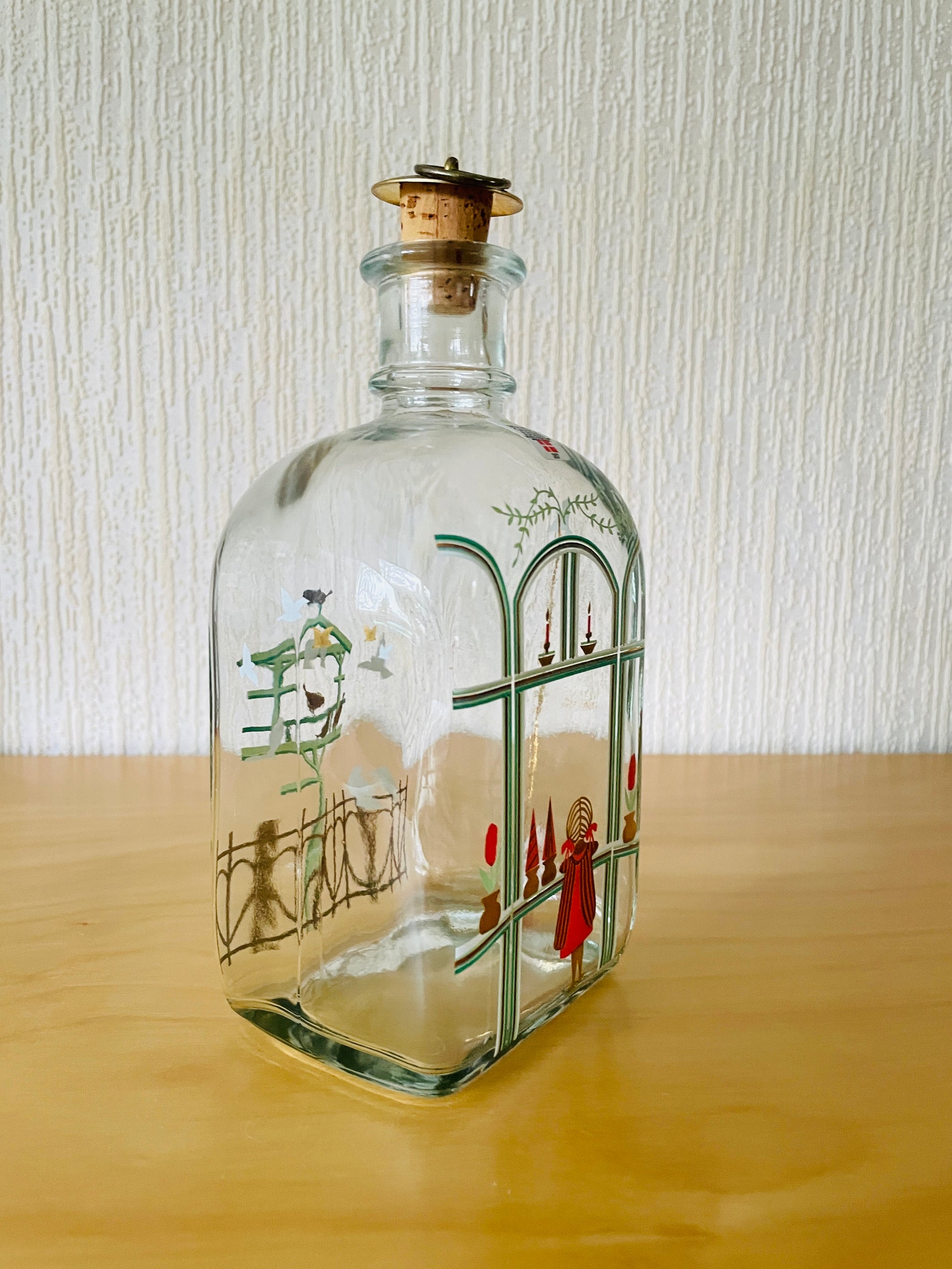 こちらは1987年度のクリスマス限定リキュールボトルになります。可愛い女の子が窓から外に集まって来る小鳥を眺めています。その先には大きくて素敵な窓が遠近法によって立体的に見えます。両サイドにはそれぞれ違う絵柄と目盛りとがデザインされています。1980年代に毎年発売されたコレクターズアイテムです。