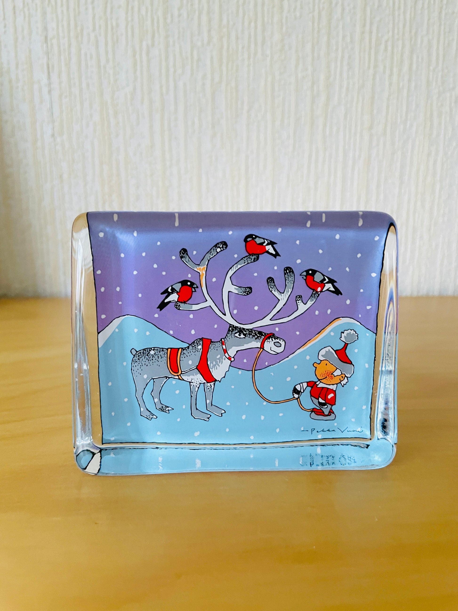 iittala/イッタラ社よりクリスタルガラスに可愛らしいクリスマスのモチーフが描かれているガラスのオブジェです。デザインはペッカヴオーリ、あまり知られていないかもしれませんが、他にも何種類かのクリスマスモチーフをデザインしています。マンガぽいイラストが’可愛らしいです。色合いも素敵です。