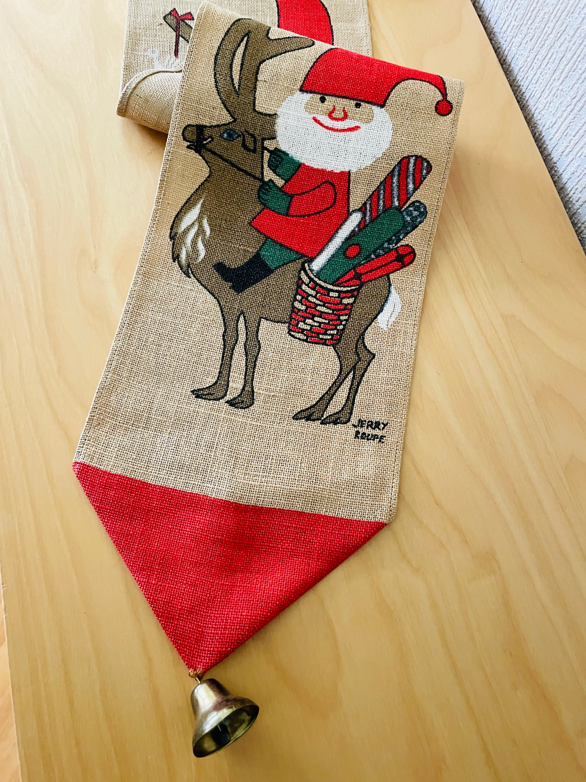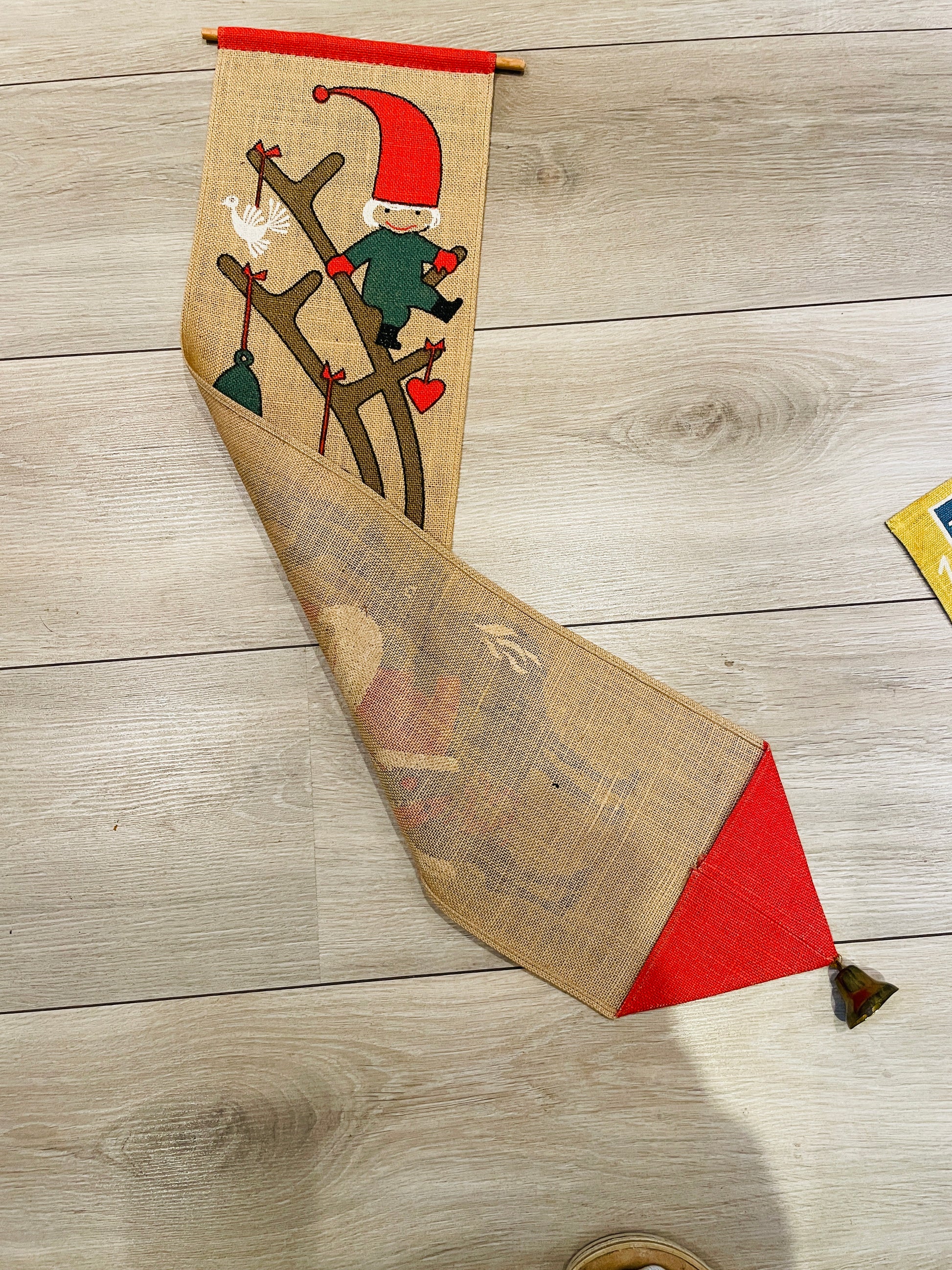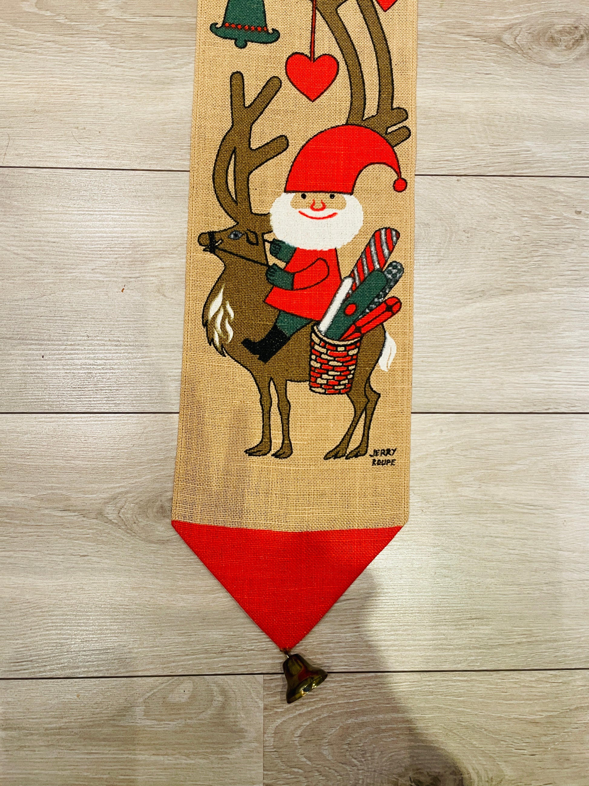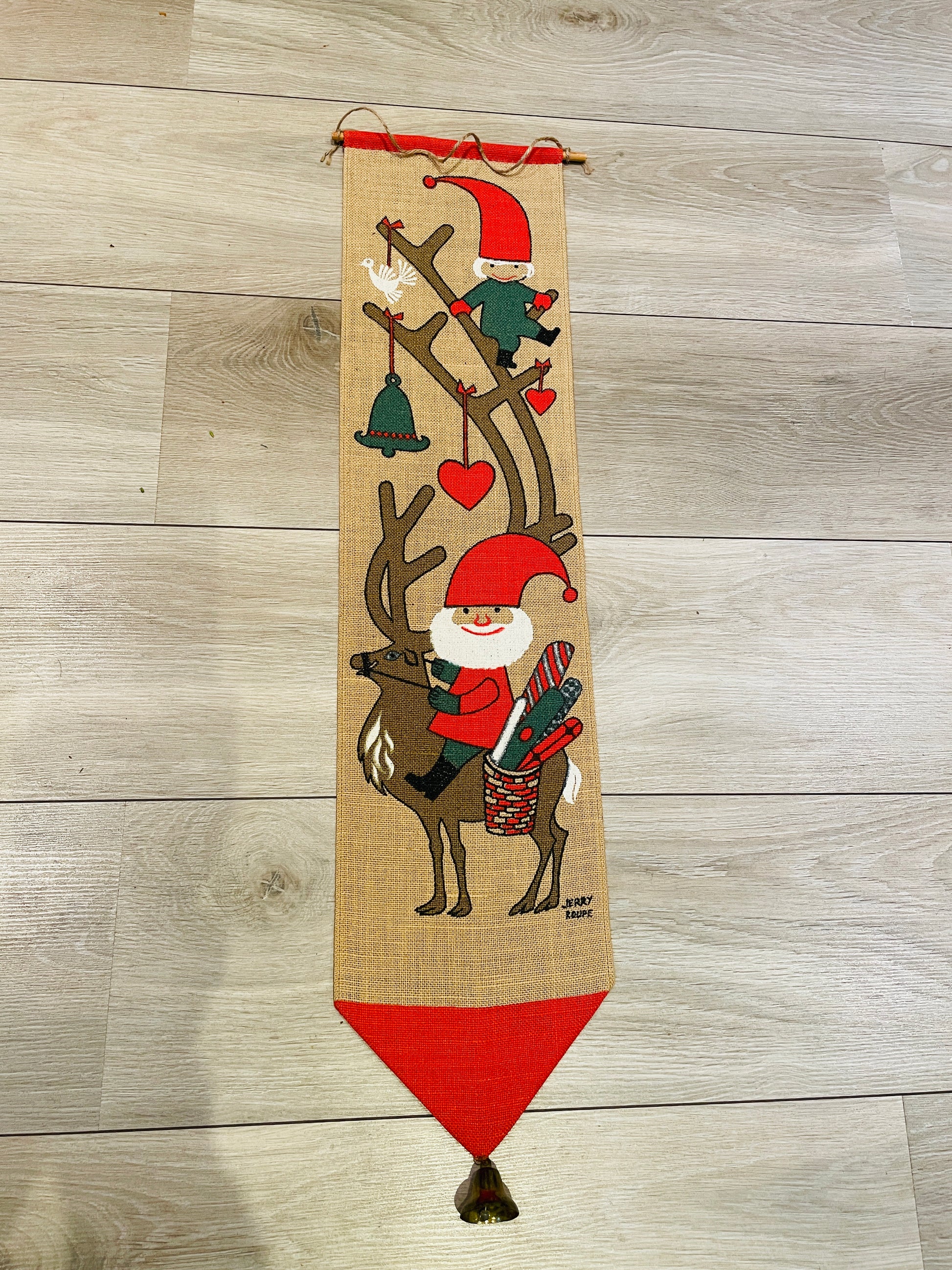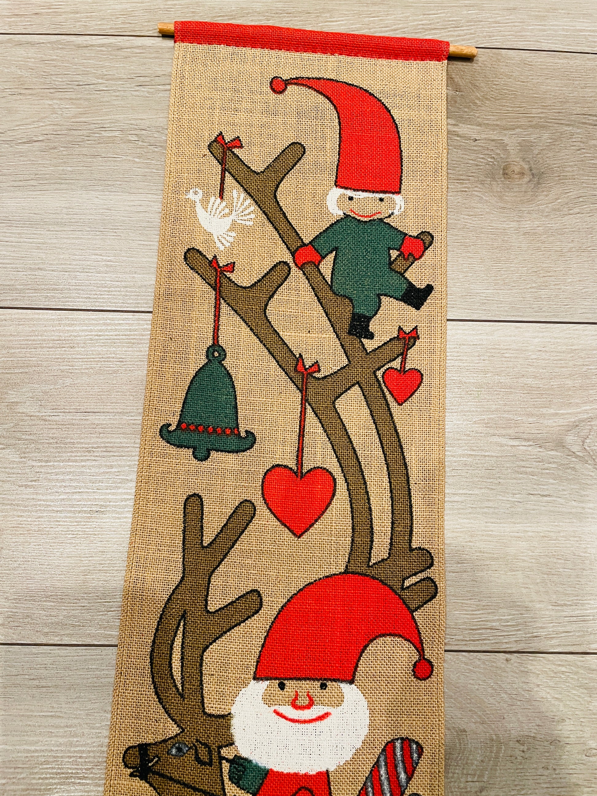 Jerry Roupe/ジェリー.ロウぺデザインによる、縦に長い壁にかけるタペストリーのご紹介です。 こちらでも大変人気があり、クリスマス時期になると高値でオークションに出される希少な作品になります。トムテさんがトナカイに乗り、ニッセが長ーいトナカイさんのツノにクリスマスの飾り付けしている、ユーモアのある作品です。こちらはジュート生地を使いプリントされている物です。ジングルベル付きです。オリジナルのジェリーロウペの作品です。