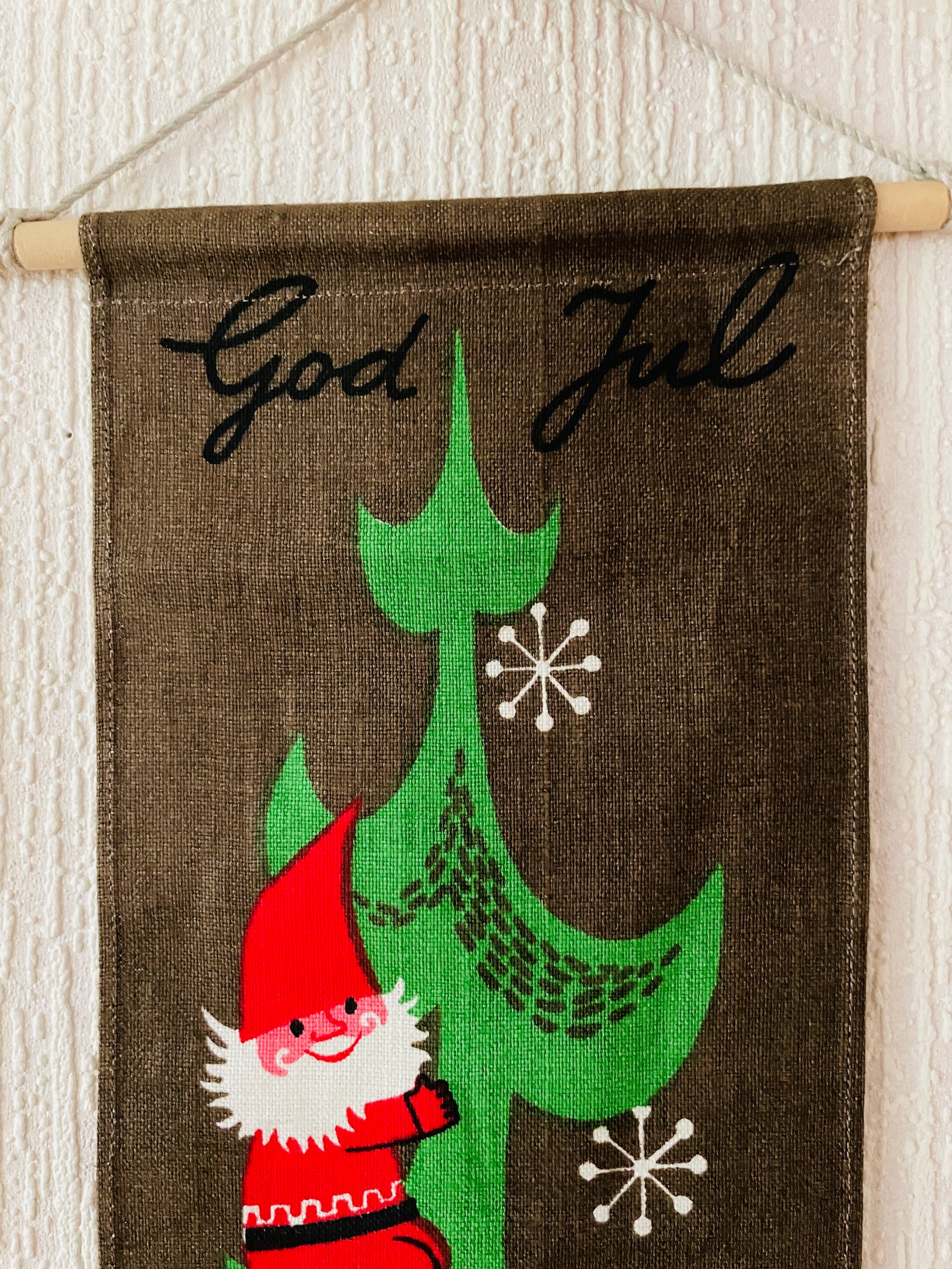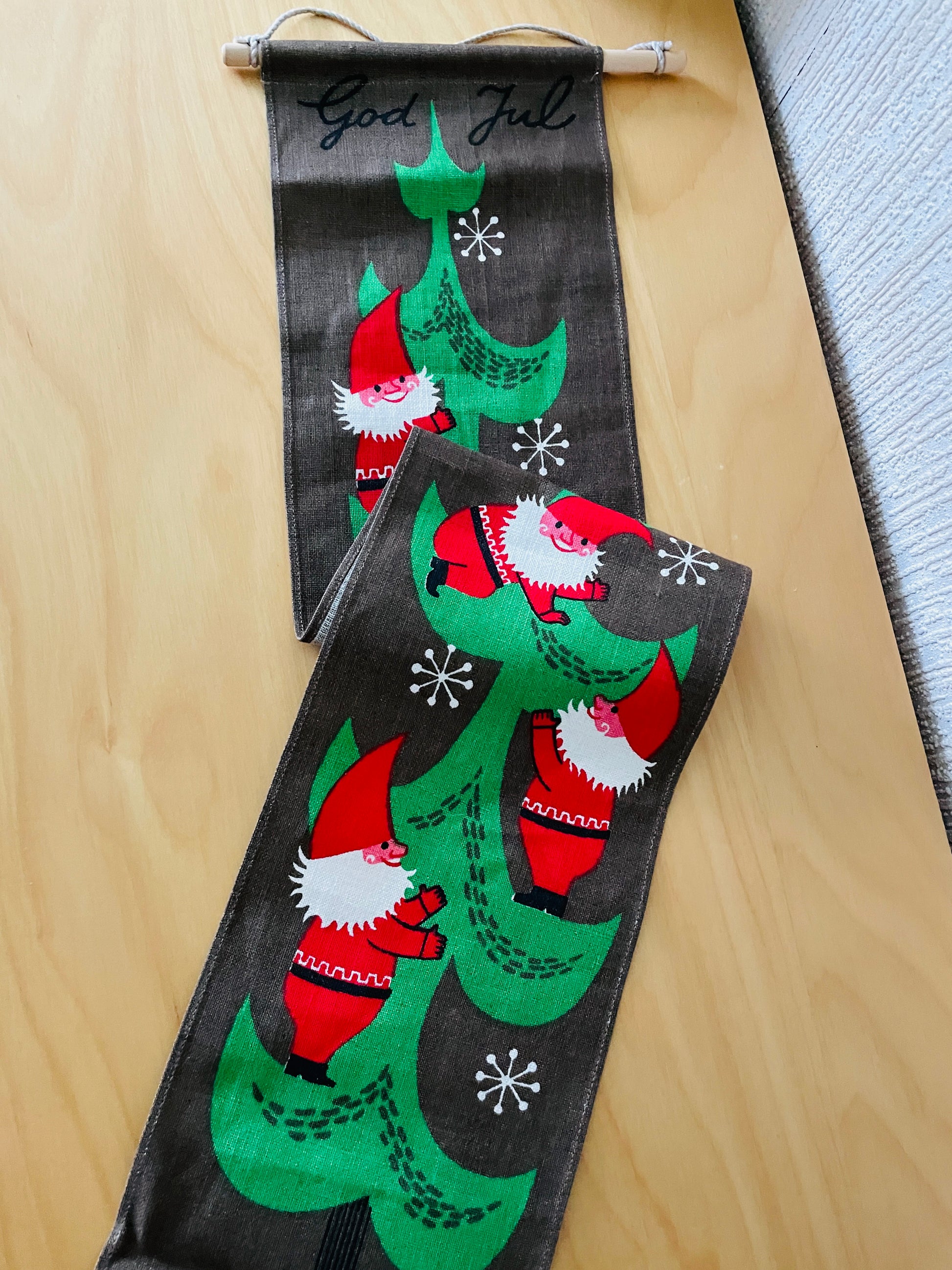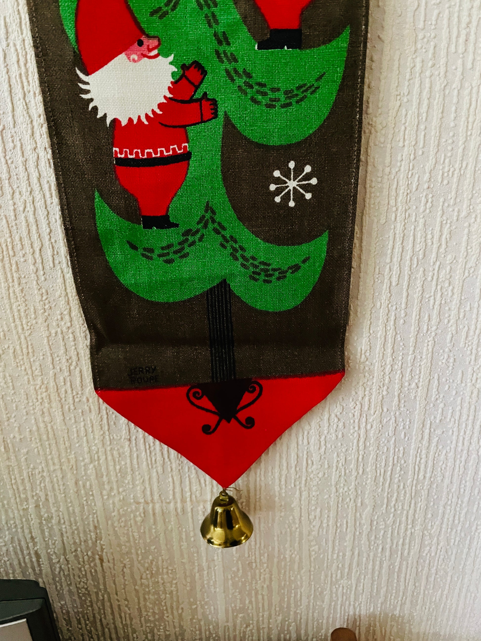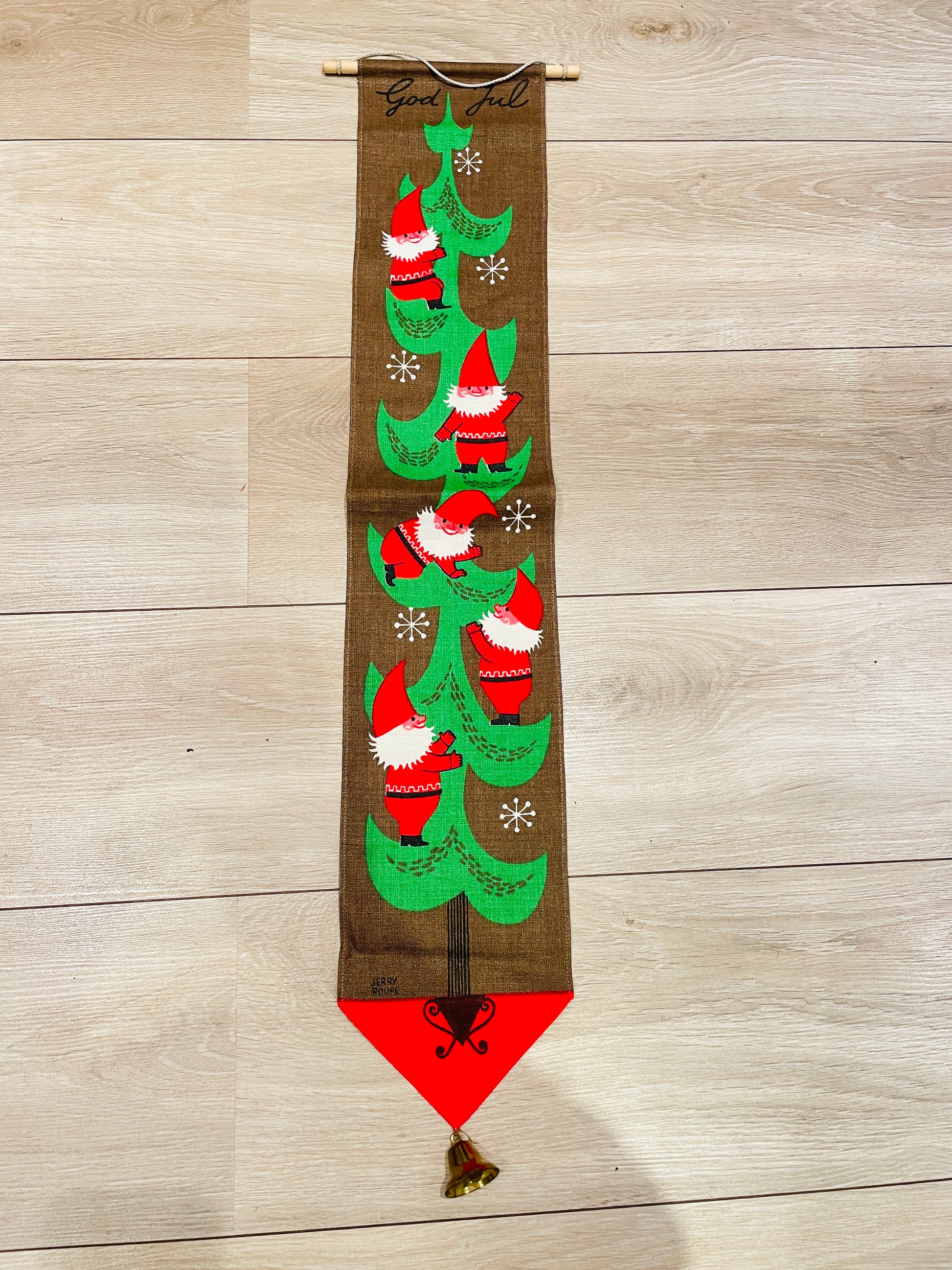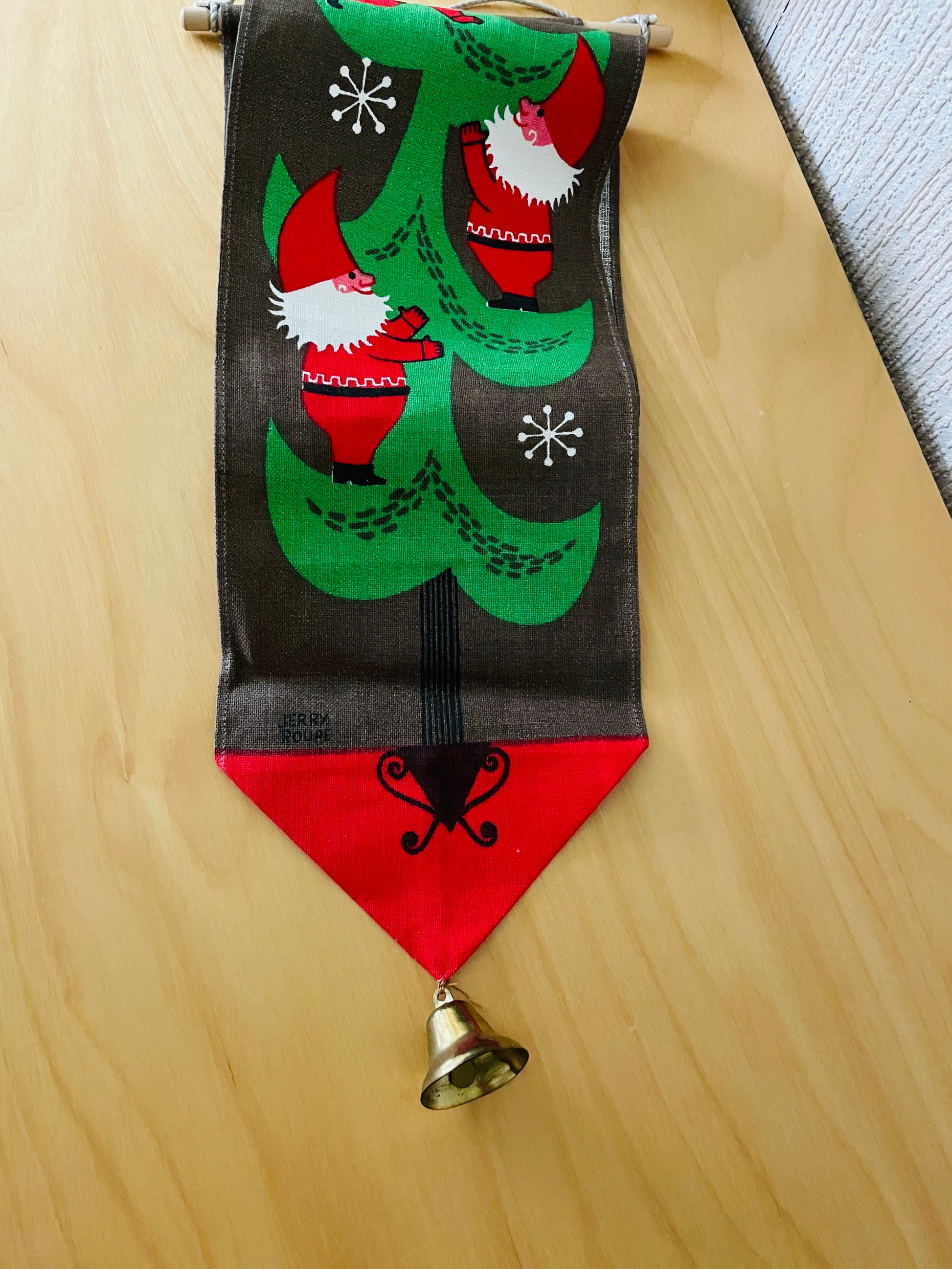 Jerry Roupe/ジェリー.ロウぺデザインによる、縦に長い壁にかけるタペストリーのご紹介です。 こちらでも大変人気があり、クリスマス時期になると高値でオークションに出される希少な作品になります。 可愛いトムテさんたちがクリスマスツリーを登っています。とても可愛らしくて、ユーモア溢れている作品です。ジングルベル付きです。オリジナルのジェリーロウペの作品です。