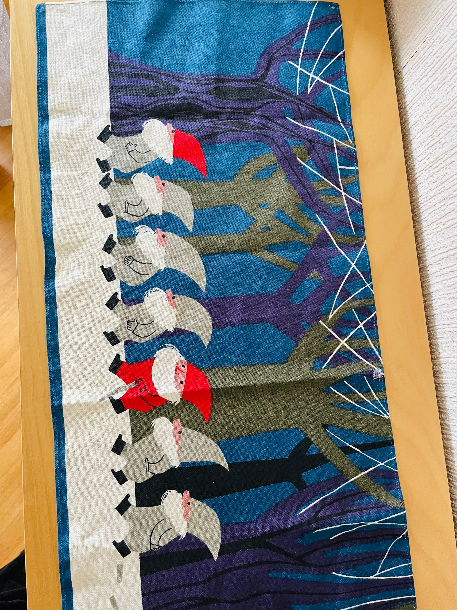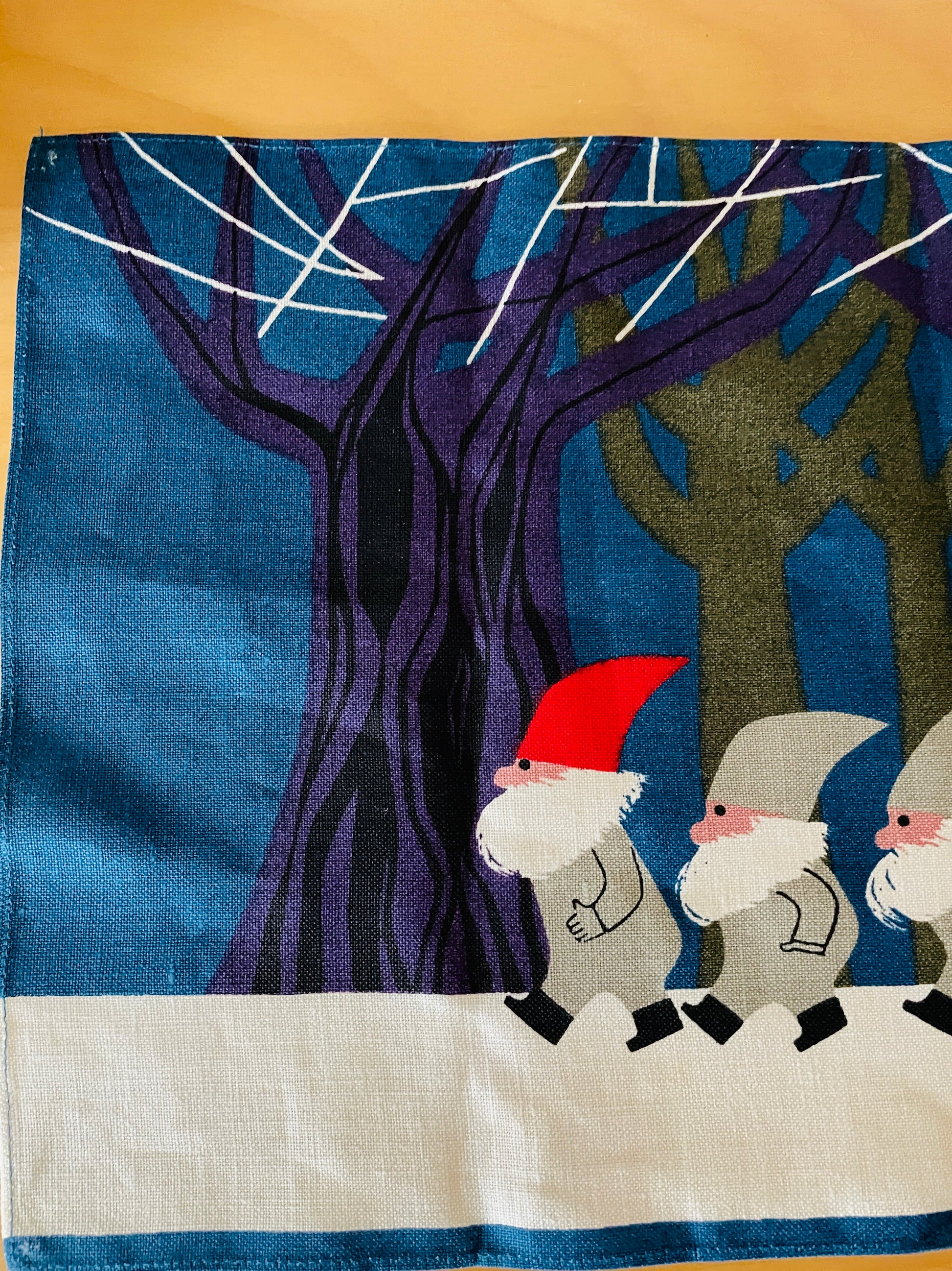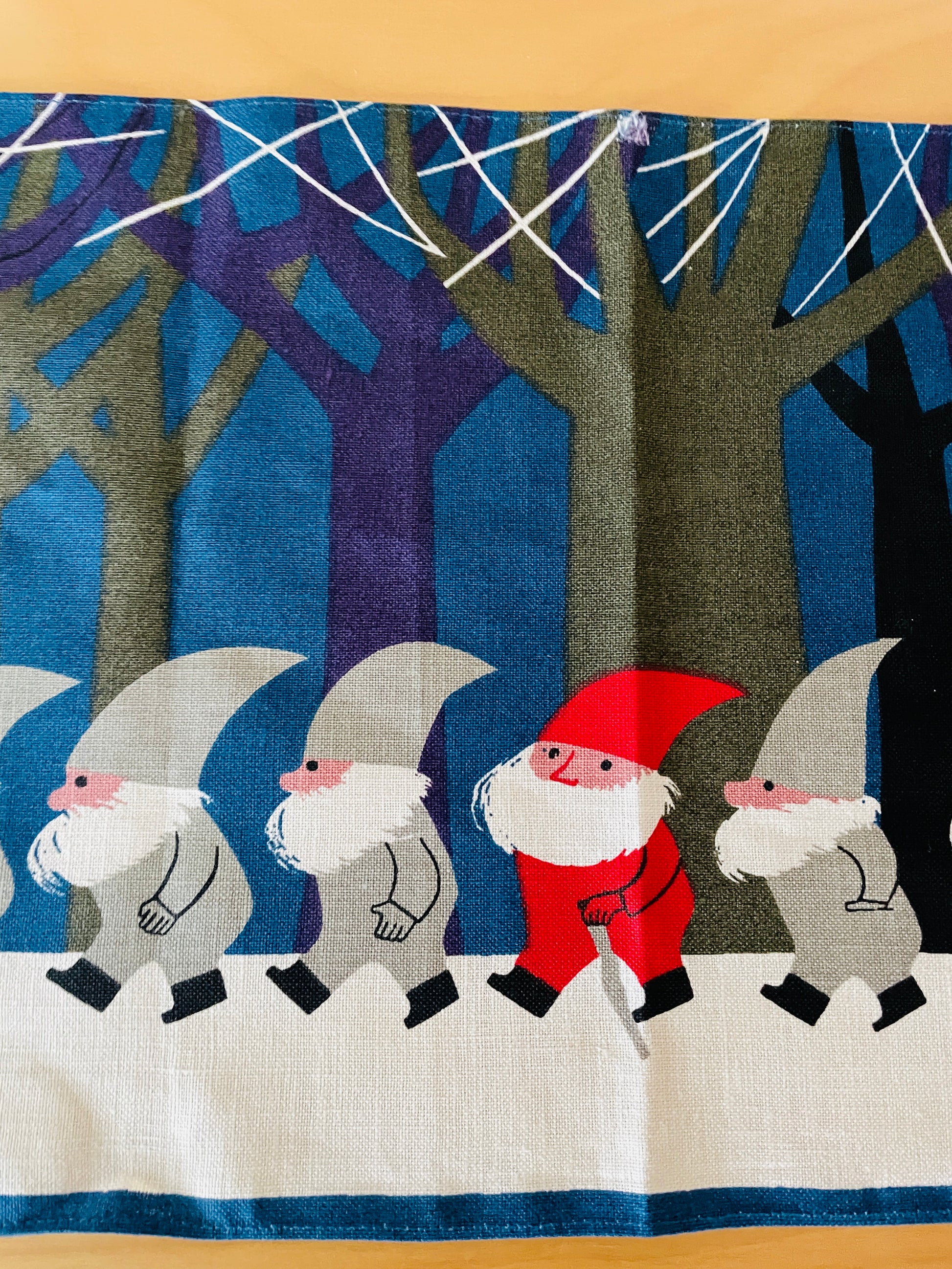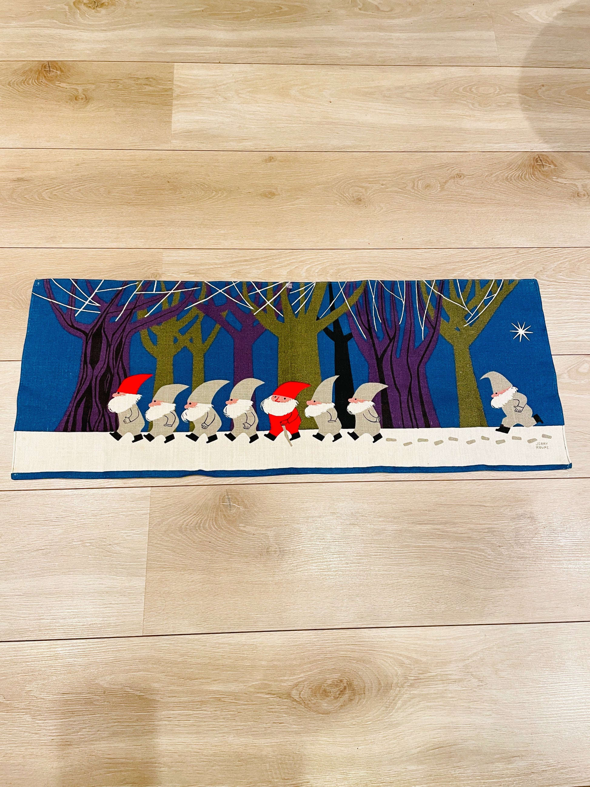 Jerry Roupe/ジェリー.ロウぺデザインによる、横に長いタペストリーのご紹介です。 こちらでも大変人気があり、クリスマス時期になると高値でオークションに出される希少な作品になります。 トムテさんたちが寒い星が輝く夜の森の中を一列に並んで歩いている、とても可愛らしくて、ユーモア溢れている作品です。 オリジナルのジェリーロウペの作品です。