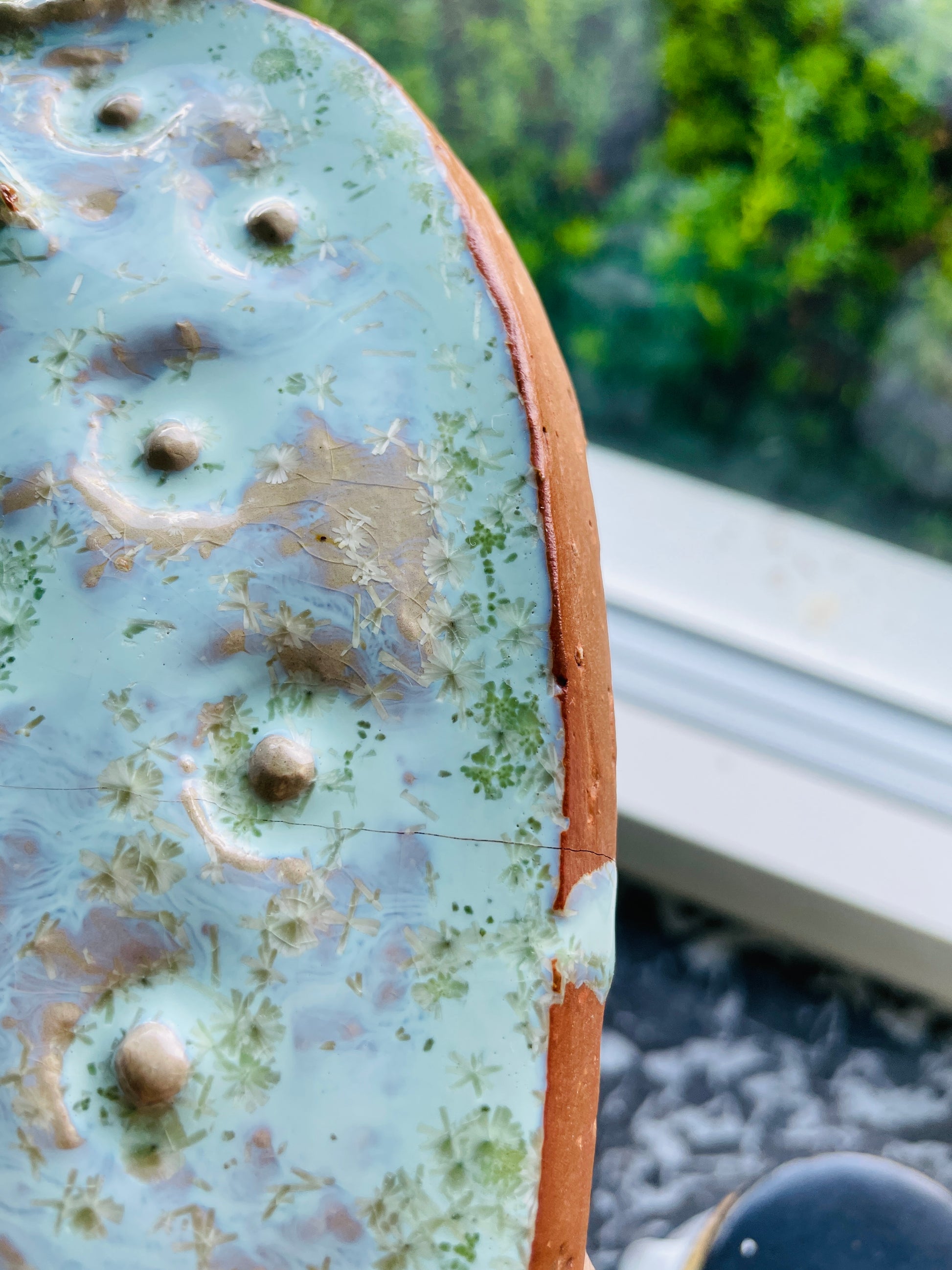 淡いエメラルドグリーンのニュアンスの釉薬がとても綺麗で、上のがくの部分と下のイチゴ自体の色のバランスが彼女自身の感性がある、とても素敵な作品です。