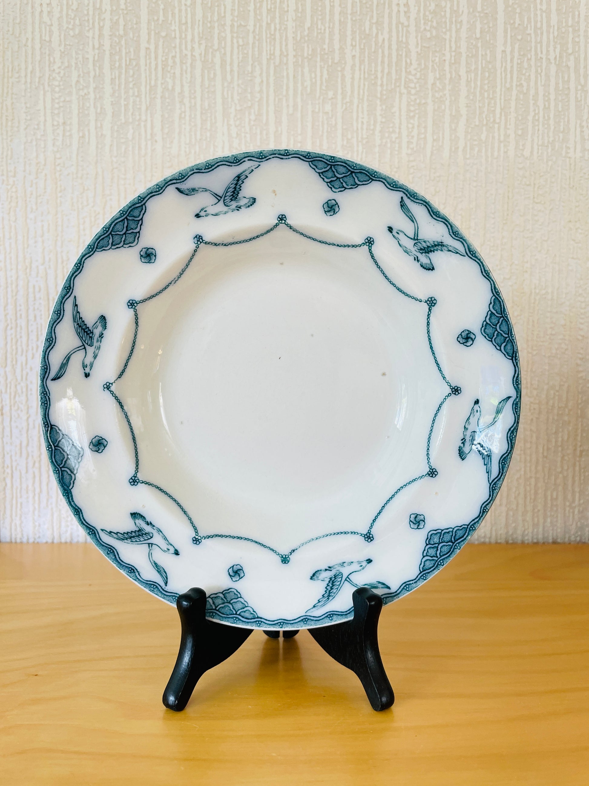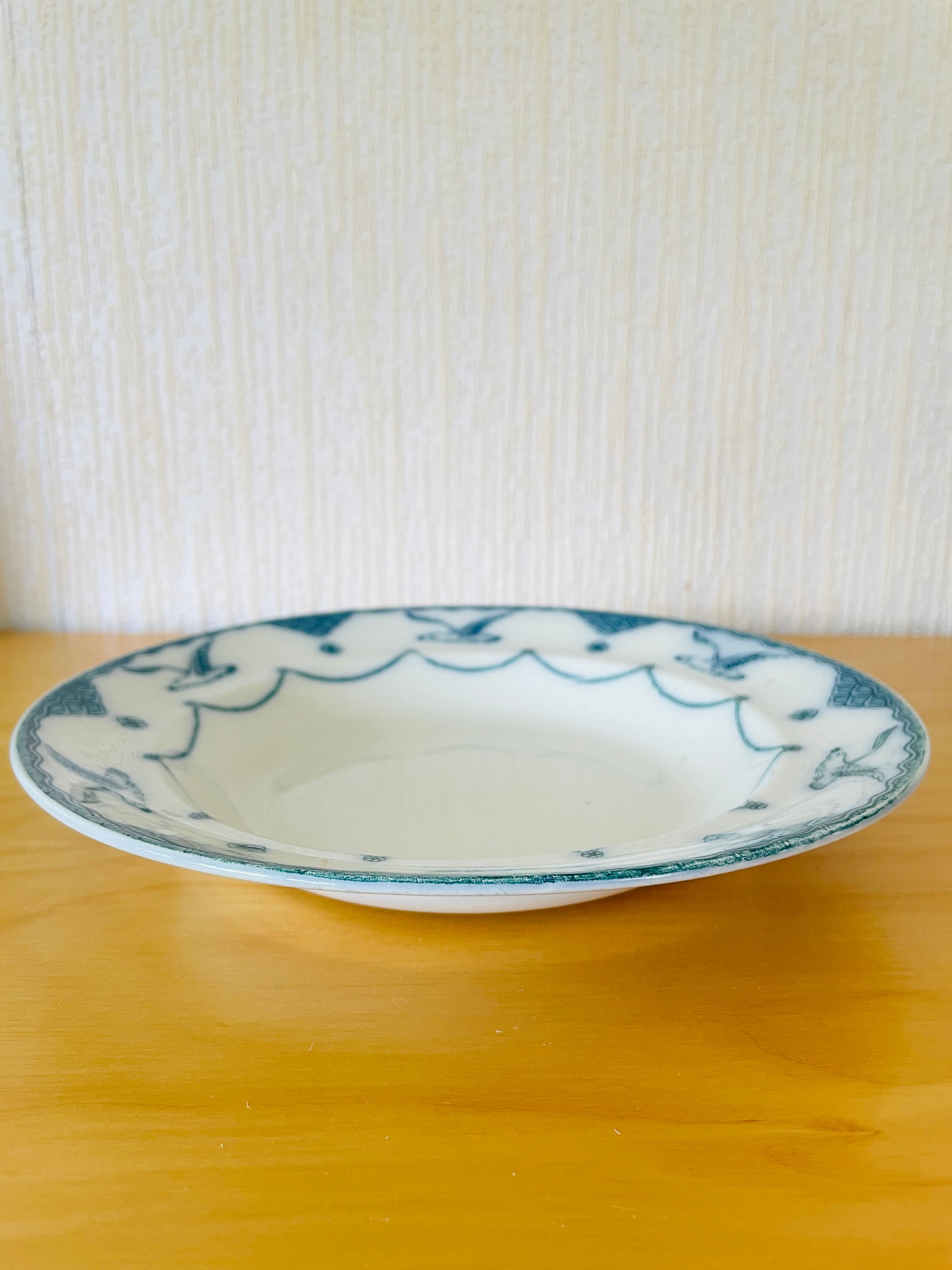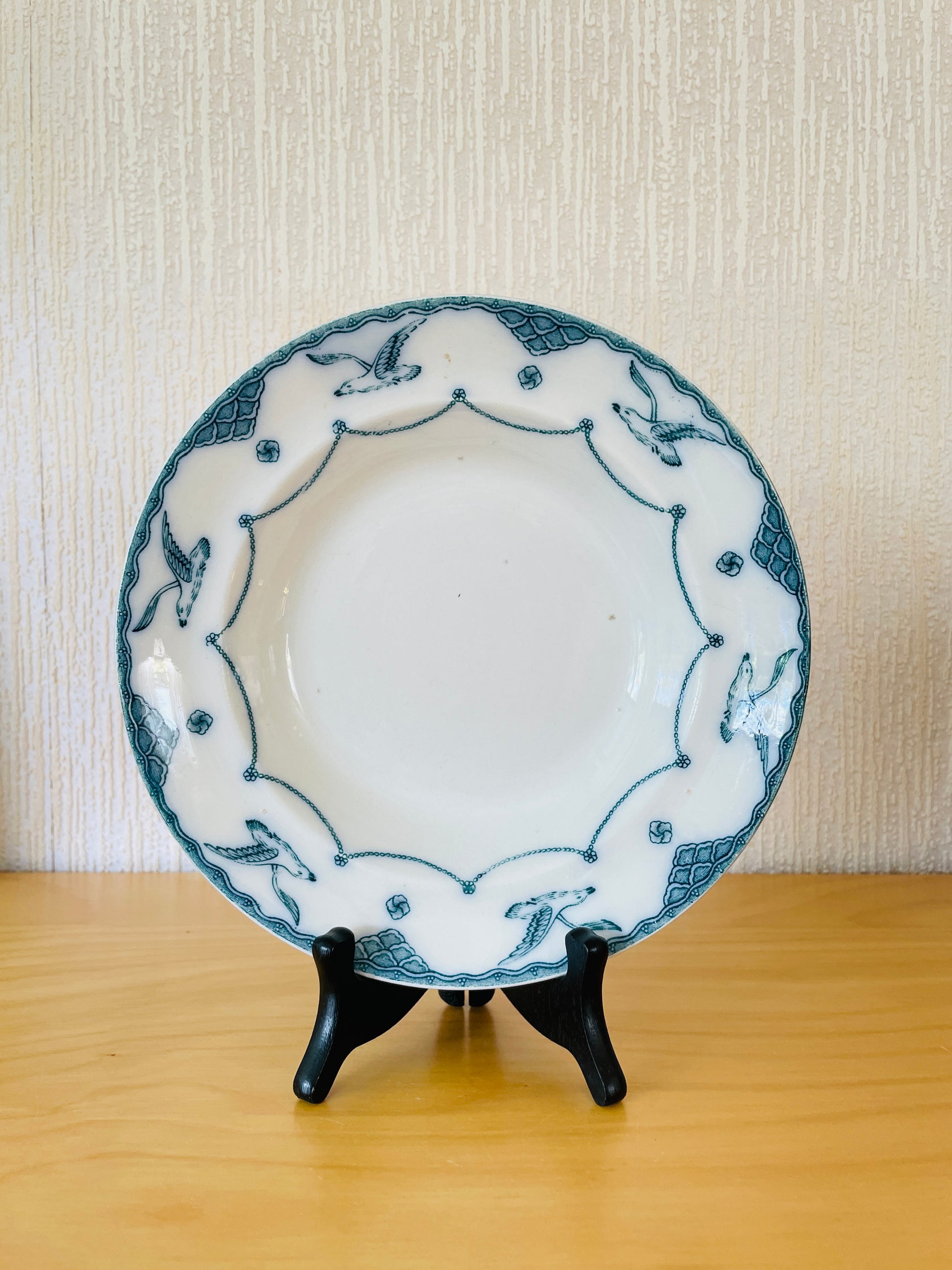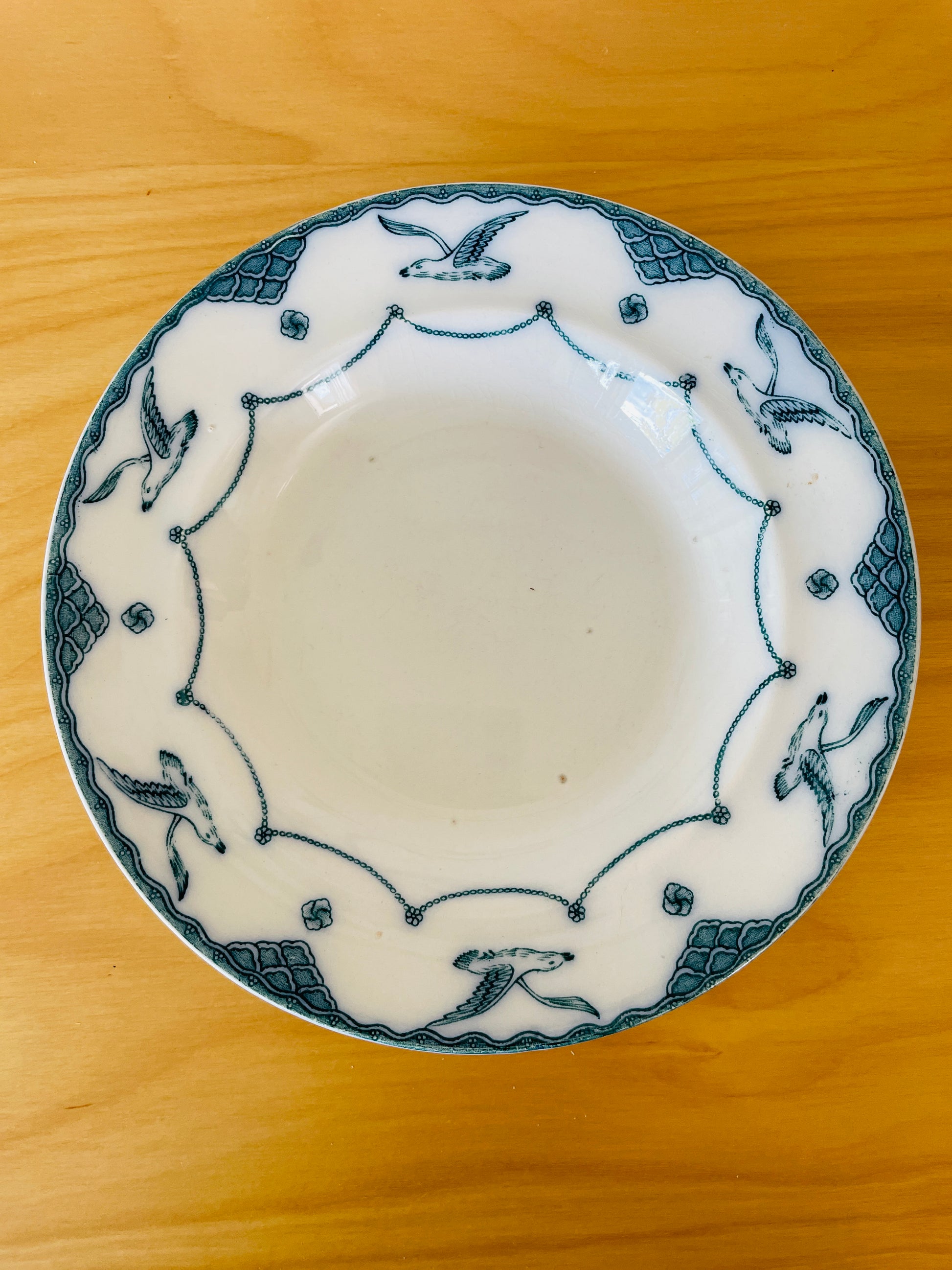 オーレスンドと名前がついたこちらのお皿、カモメがお皿のふちをスイスイと飛んでいます。色使いは紺に近いブルーです。