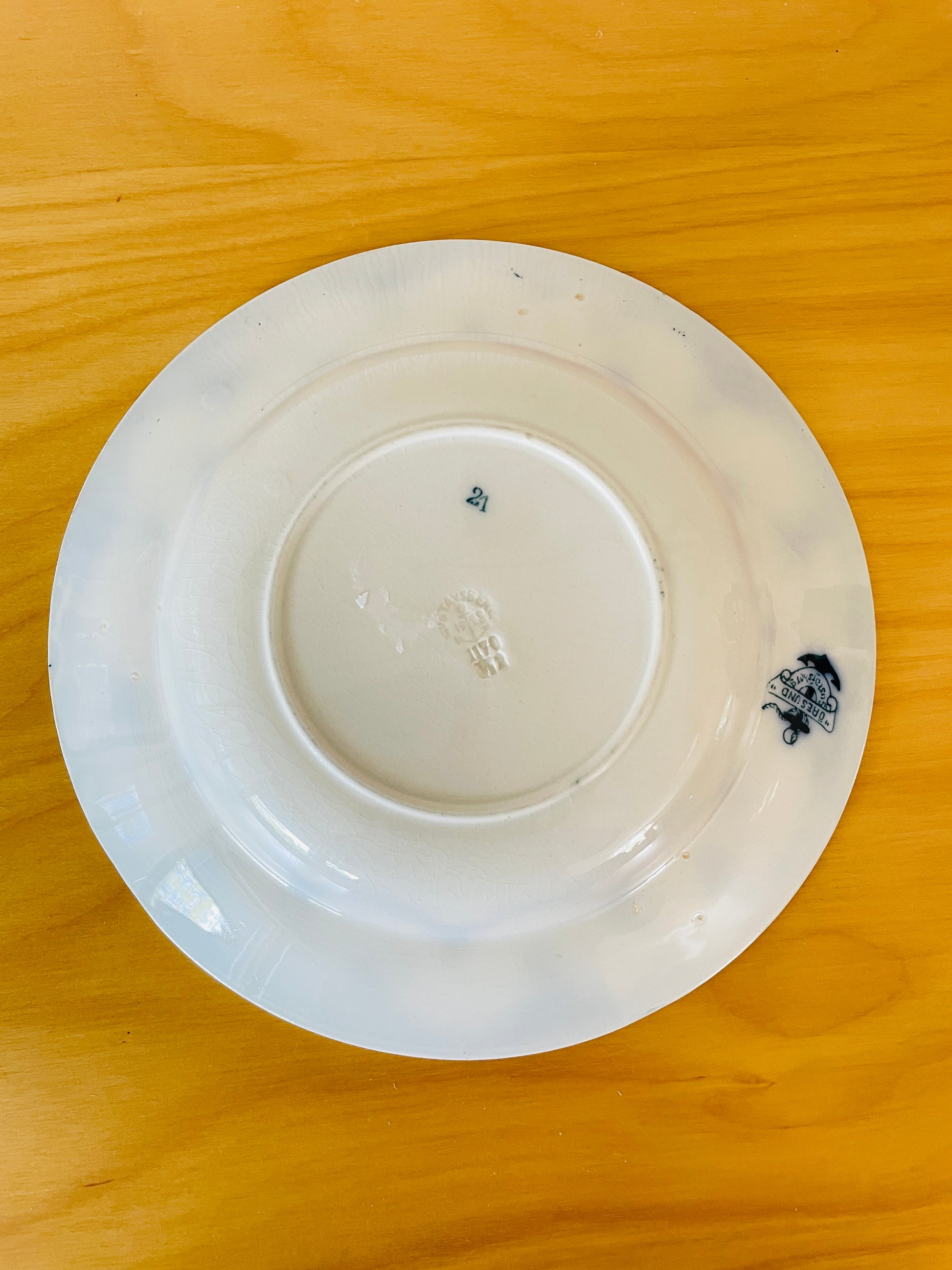 (コンディション) :目立った欠けなどはありませんが、こちらのシリーズはなんとも100年ほど前のプレートなので、プリントのズレ、薄いシミや貫入、カトラリー小傷などほとんどがあります。アンテイークとしては綺麗なコンディションです。