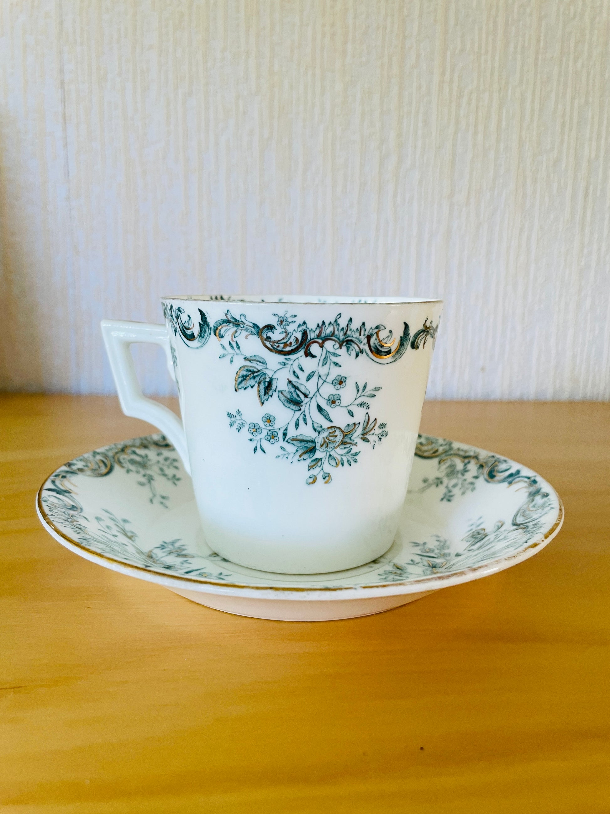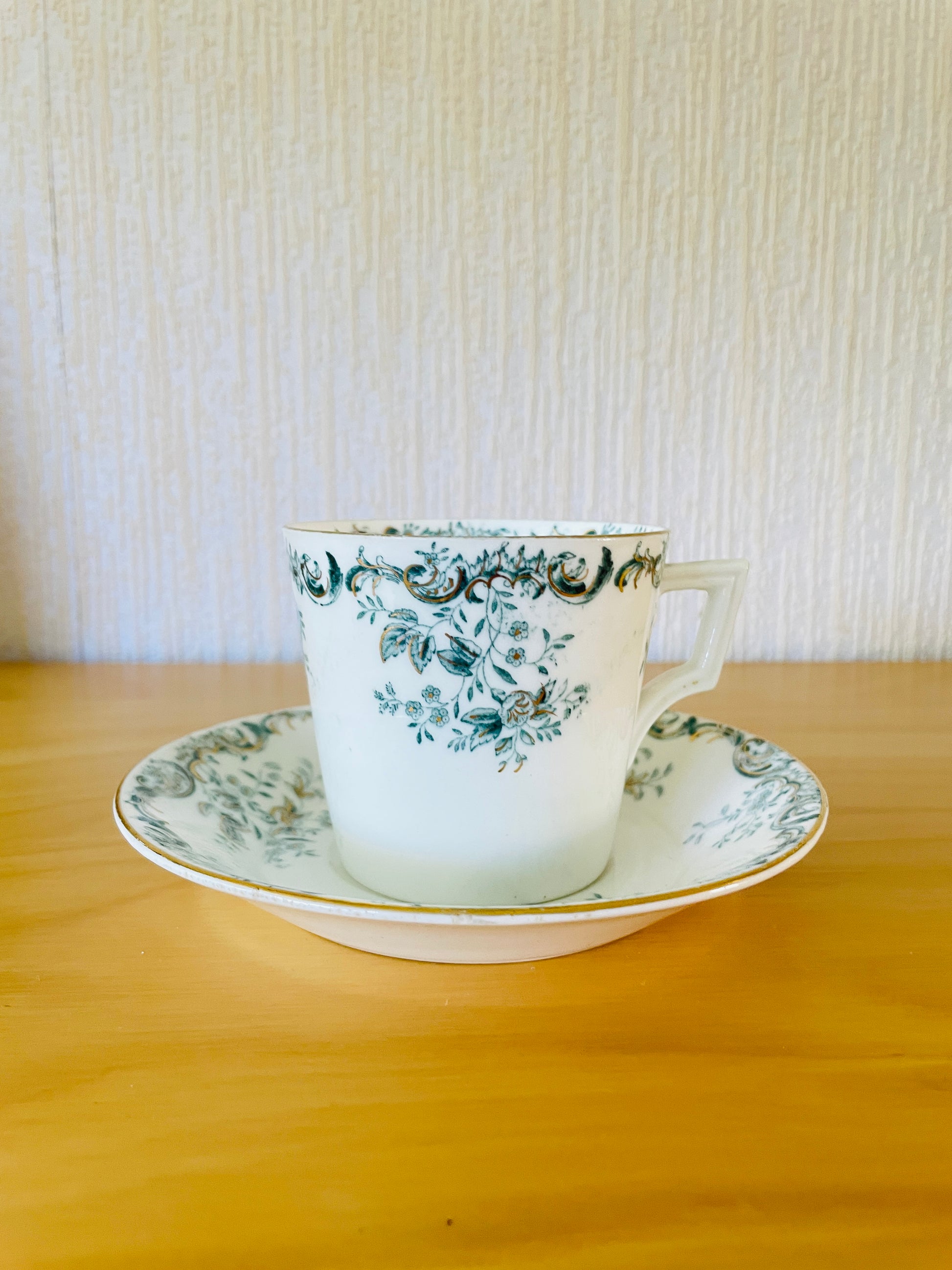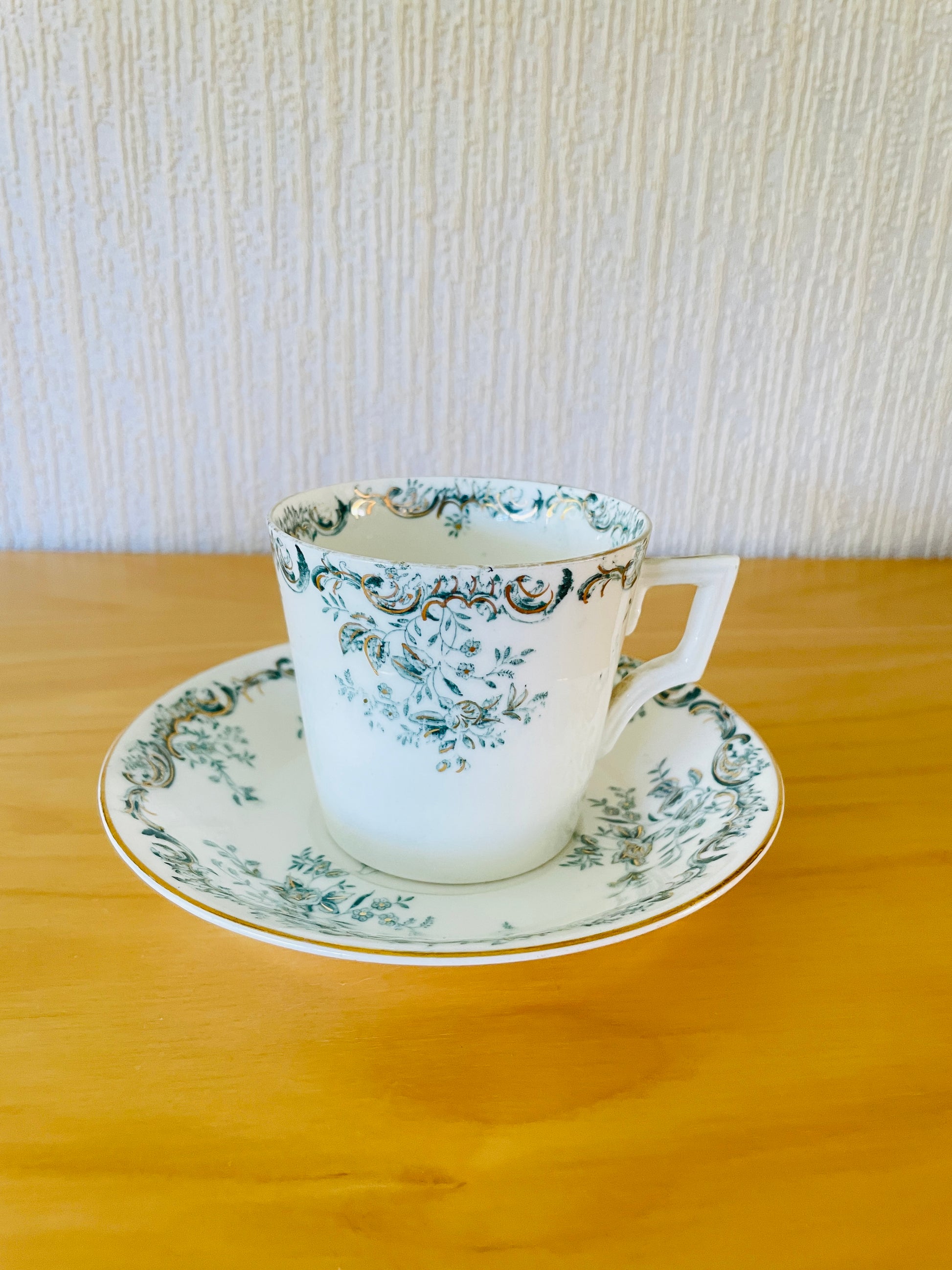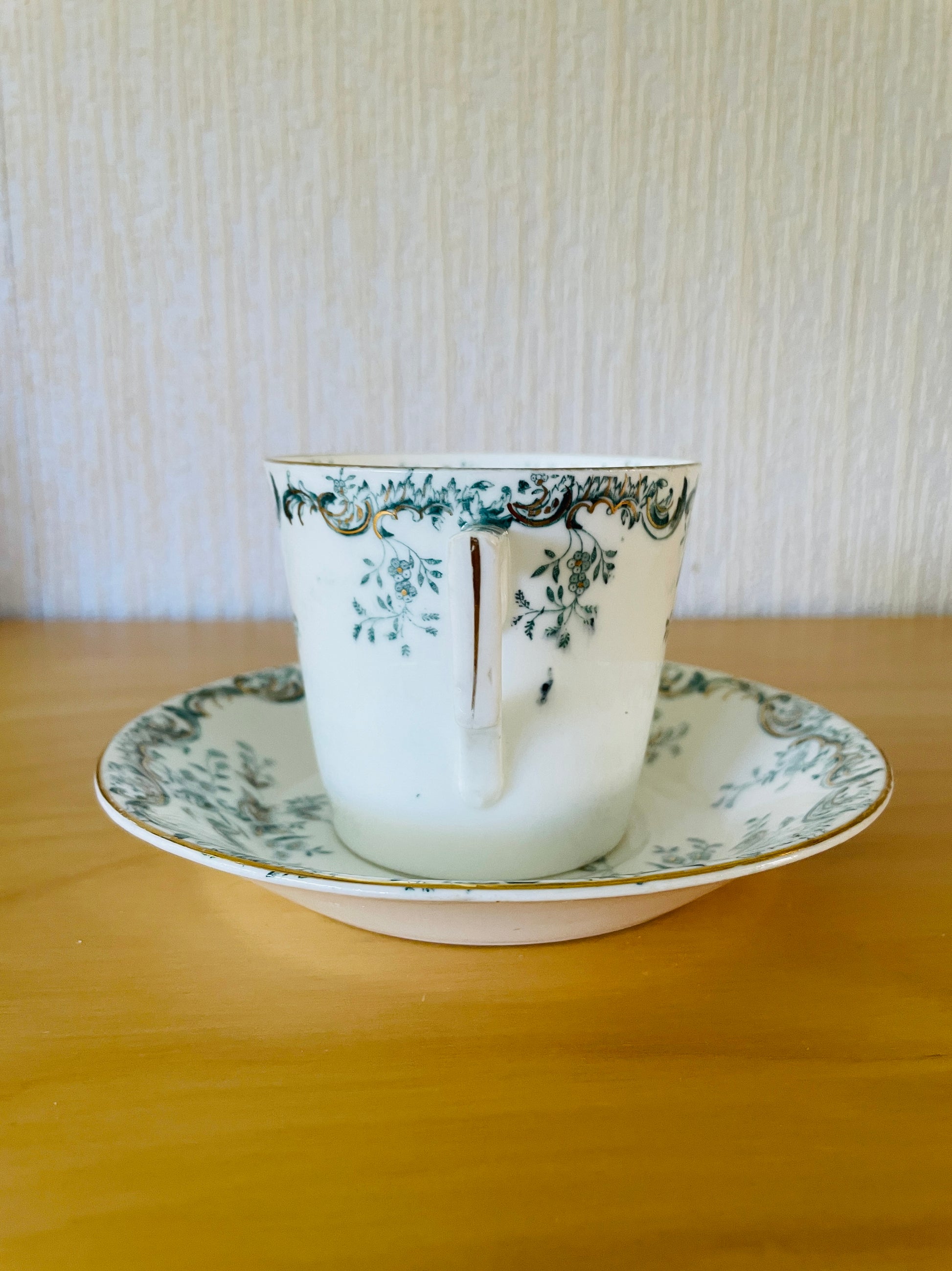 白地に何とも言えないグリーンブルーの様な花柄が素敵です。薄くなったゴールドの相性もばっちりです。以前ご紹介したカップ&ソーサーよりも一回り大きめのサイズになります。100年以上、古いカップ&ソーサーで状態が良く残っている物は現在ではほとんどありません。今回、2セットの在庫があります。