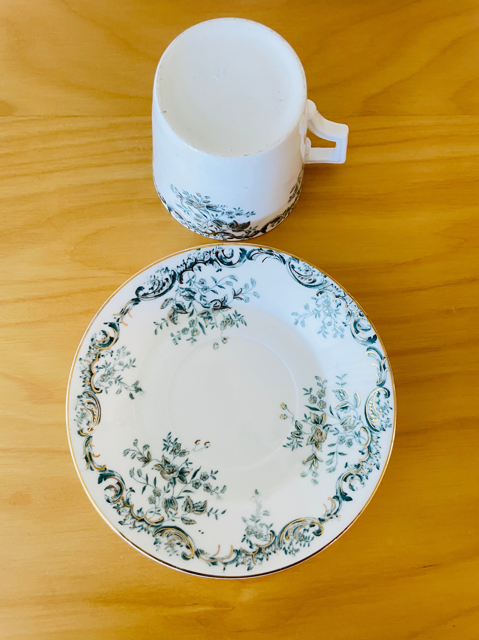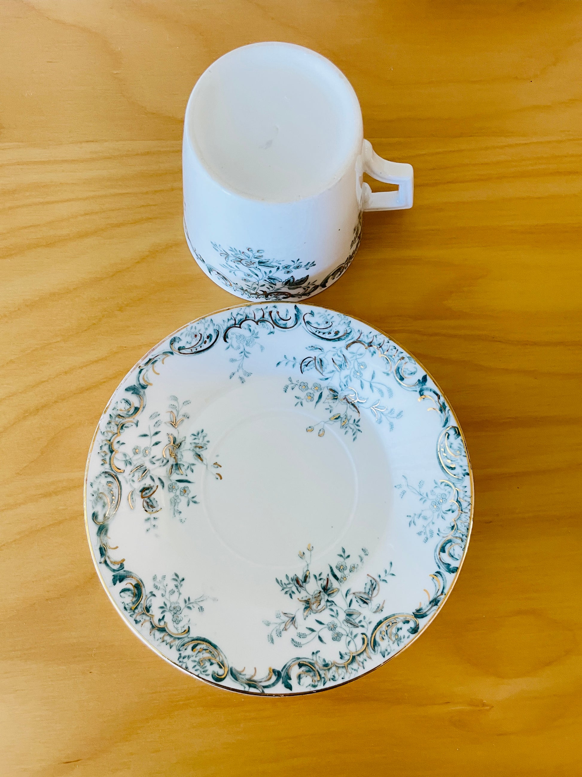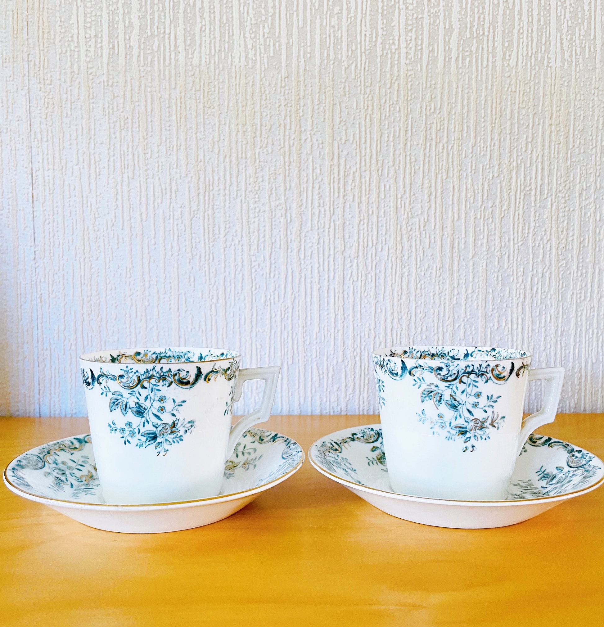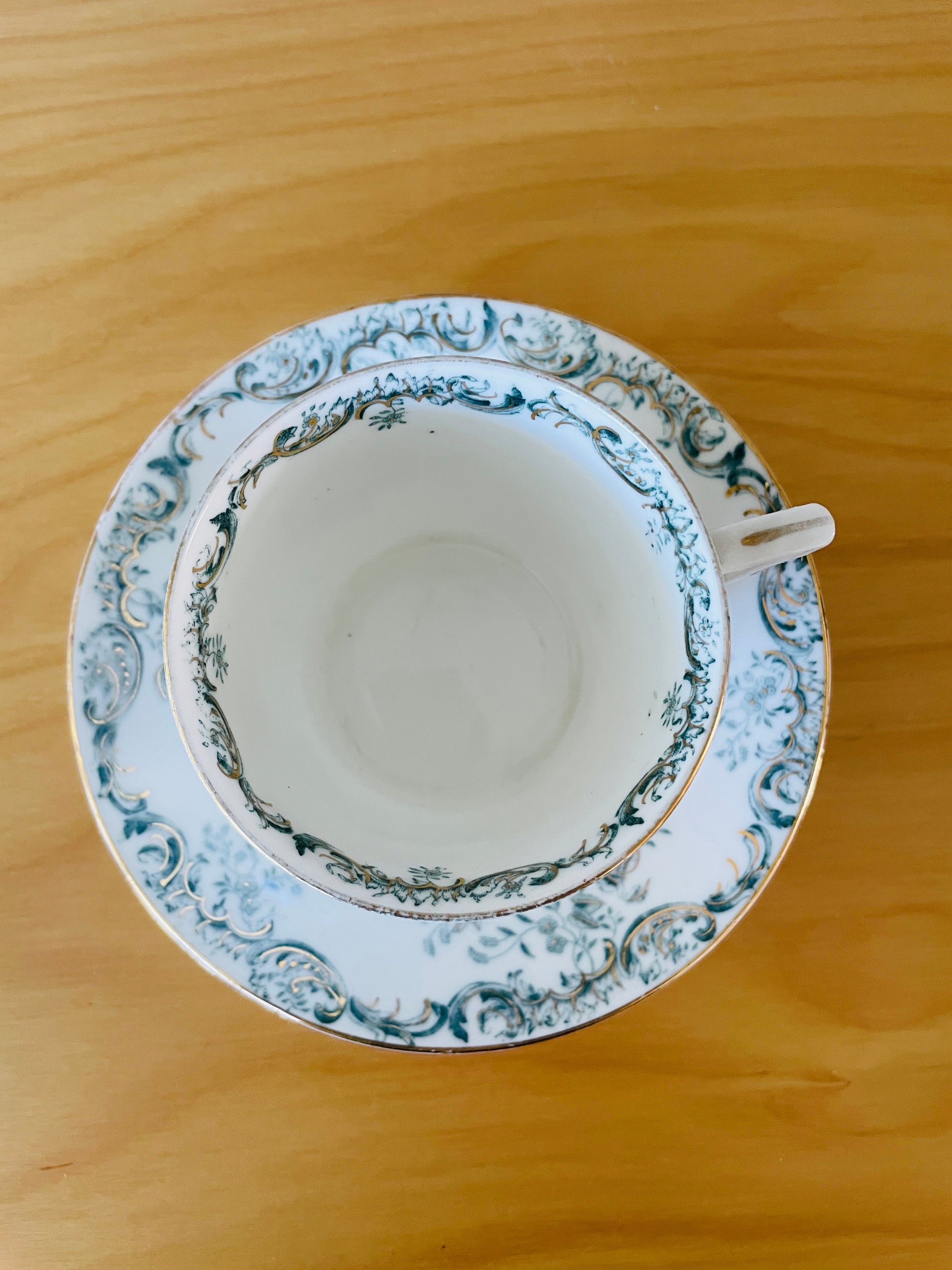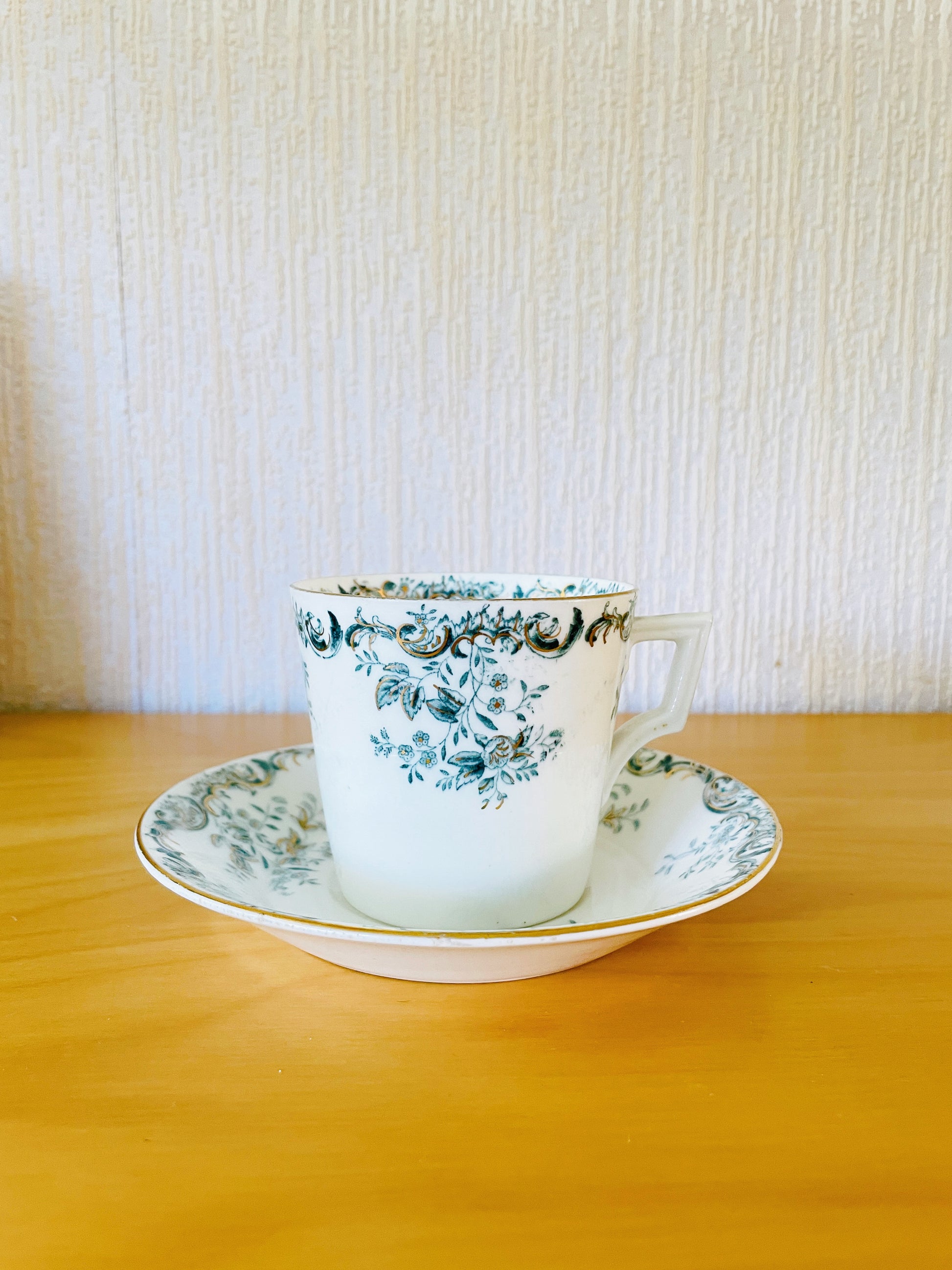 白地に何とも言えないグリーンブルーの様な花柄が素敵です。薄くなったゴールドの相性もばっちりです。以前ご紹介したカップ&ソーサーよりも一回り大きめのサイズになります。100年以上、古いカップ&ソーサーで状態が良く残っている物は現在ではほとんどありません。今回、2セットの在庫があります。