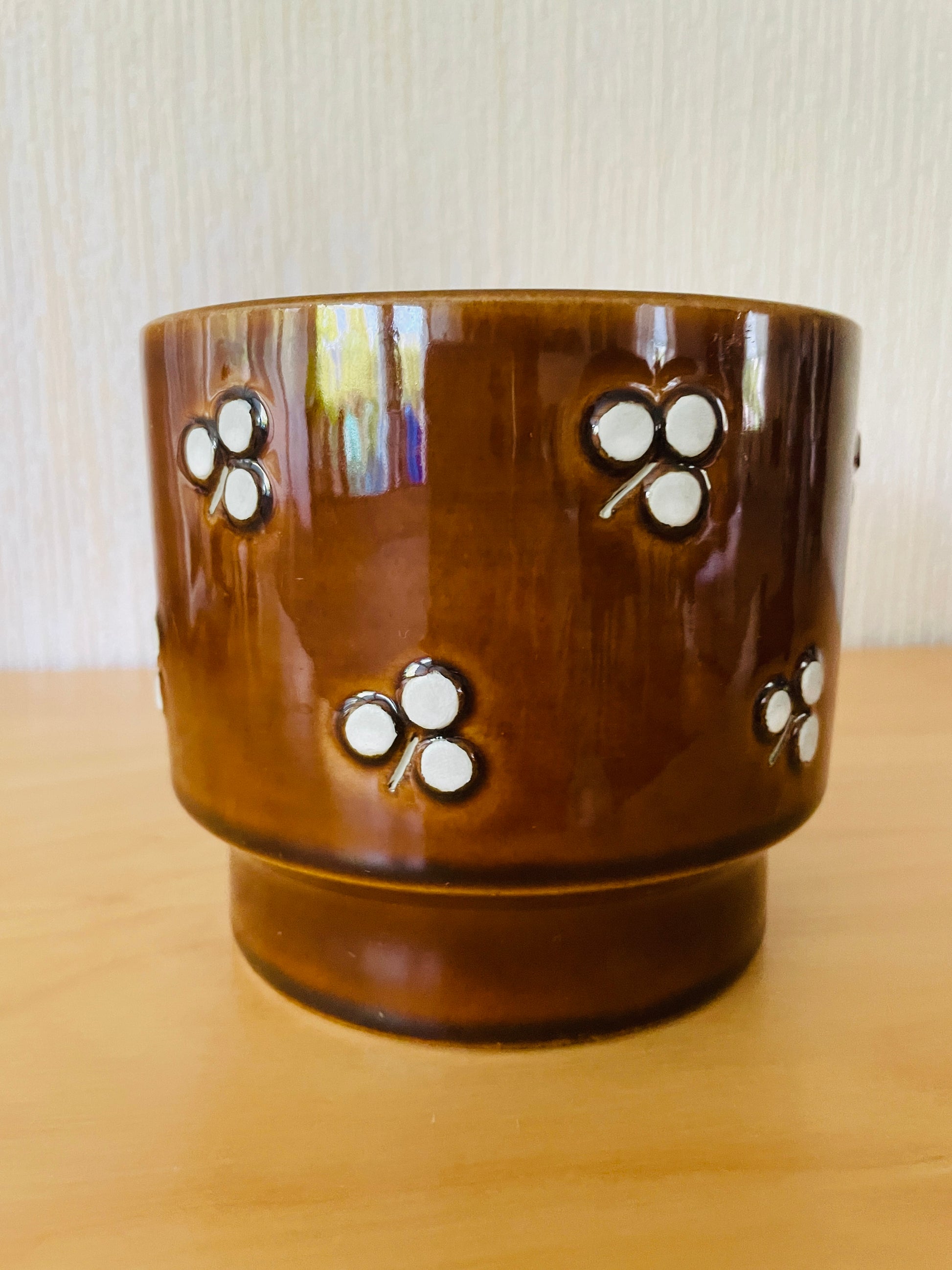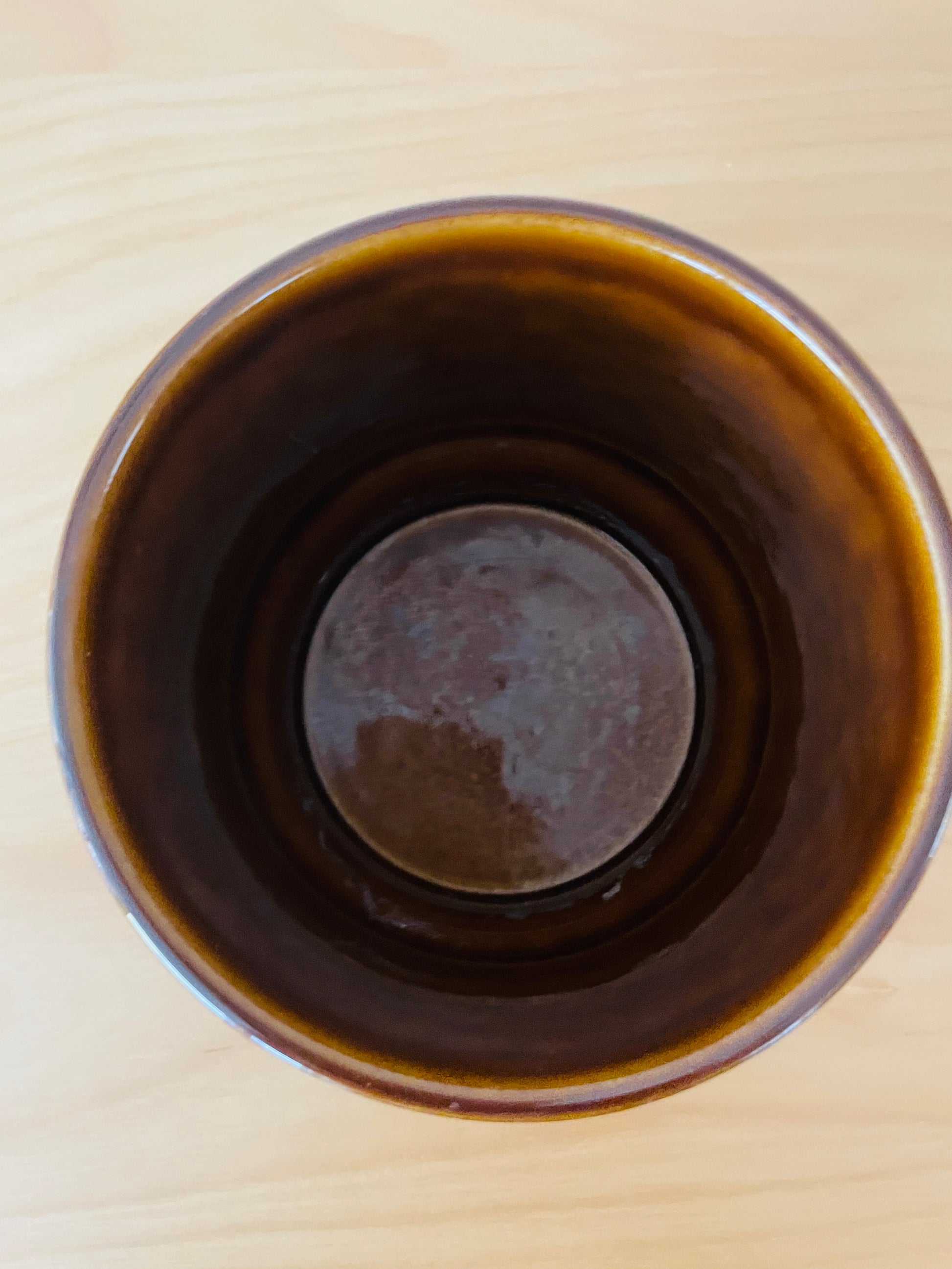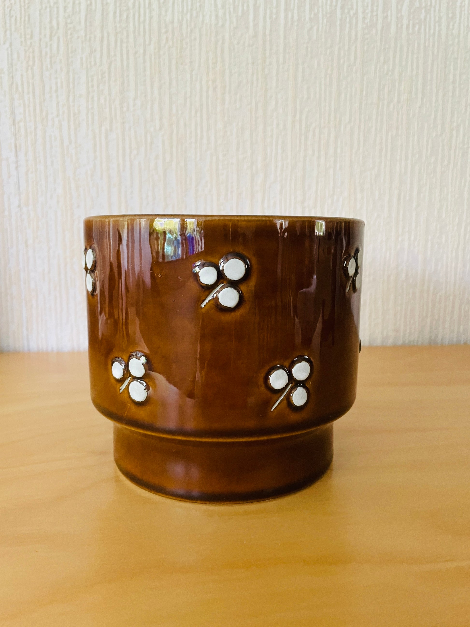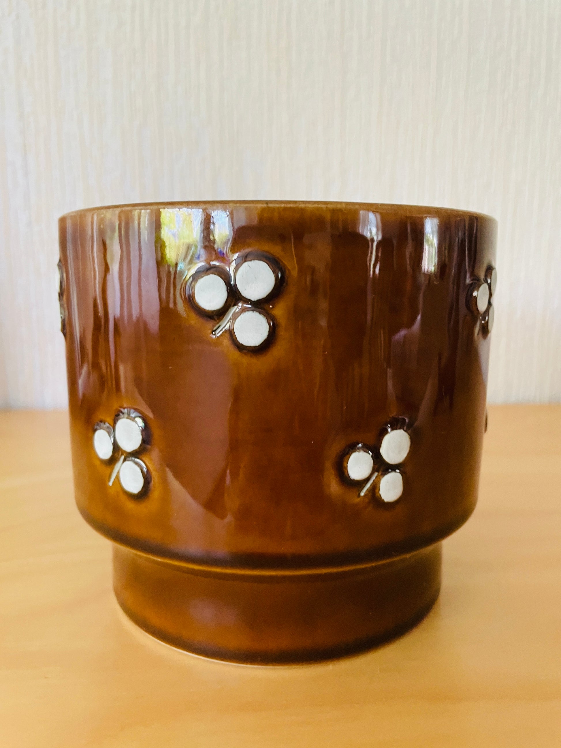 こちらは直径が13cm, 高さが12cmのサイズのフラワーポットになります。艶のある濃いめのブラウンと薄めのブラウン2個の在庫があります。