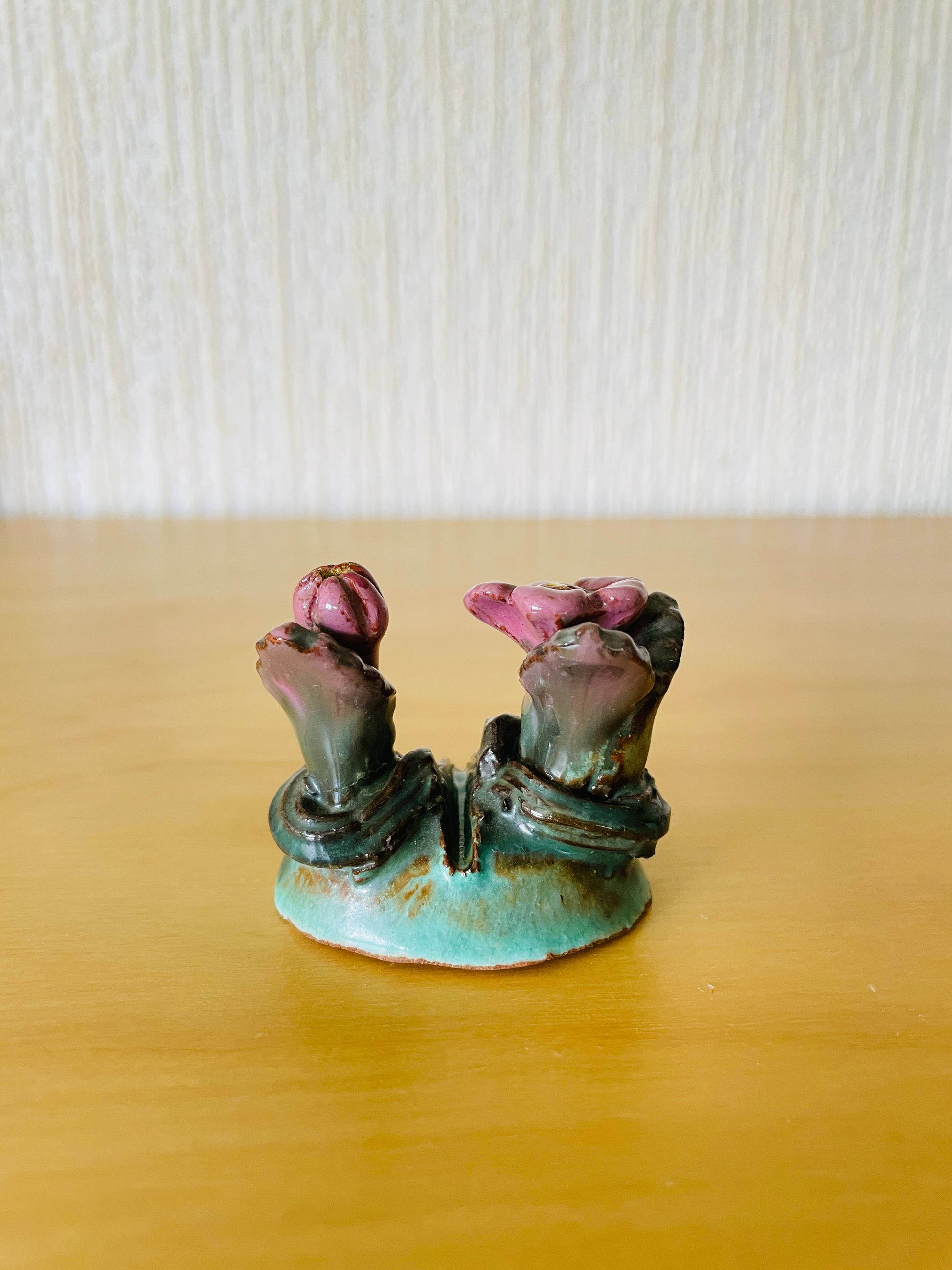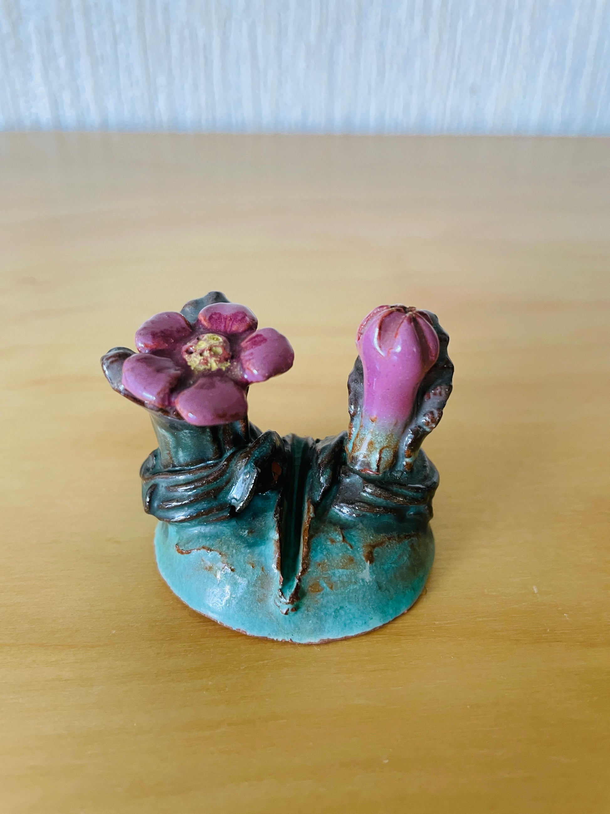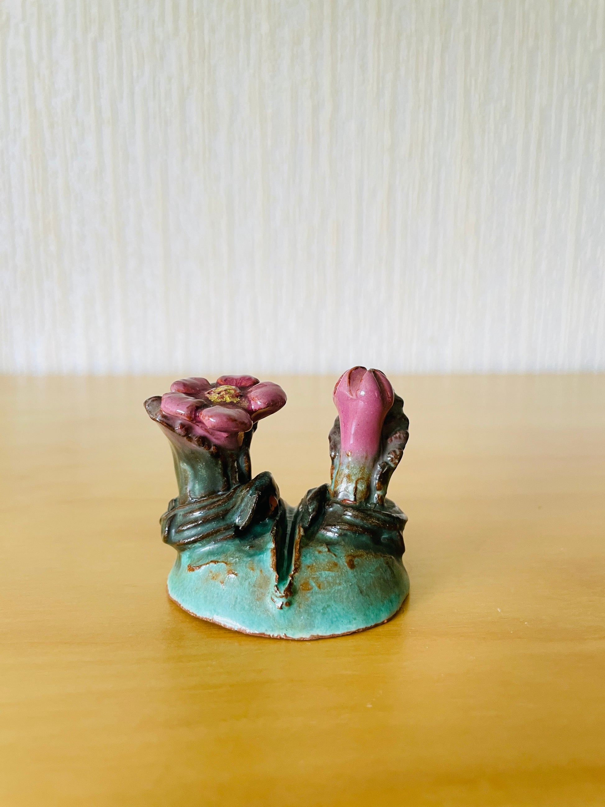 こちらのカトラリーレストは2輪のピンクの可愛らしいお花がまるで野に咲くお花がすくっと立っている、その中にカトラリーを置いてテーブルの上に飾っていただくと、とても優しい気持ちになるような、ハンドメイド感があふれる、そんなカトラリーレストです。2個の在庫があります。