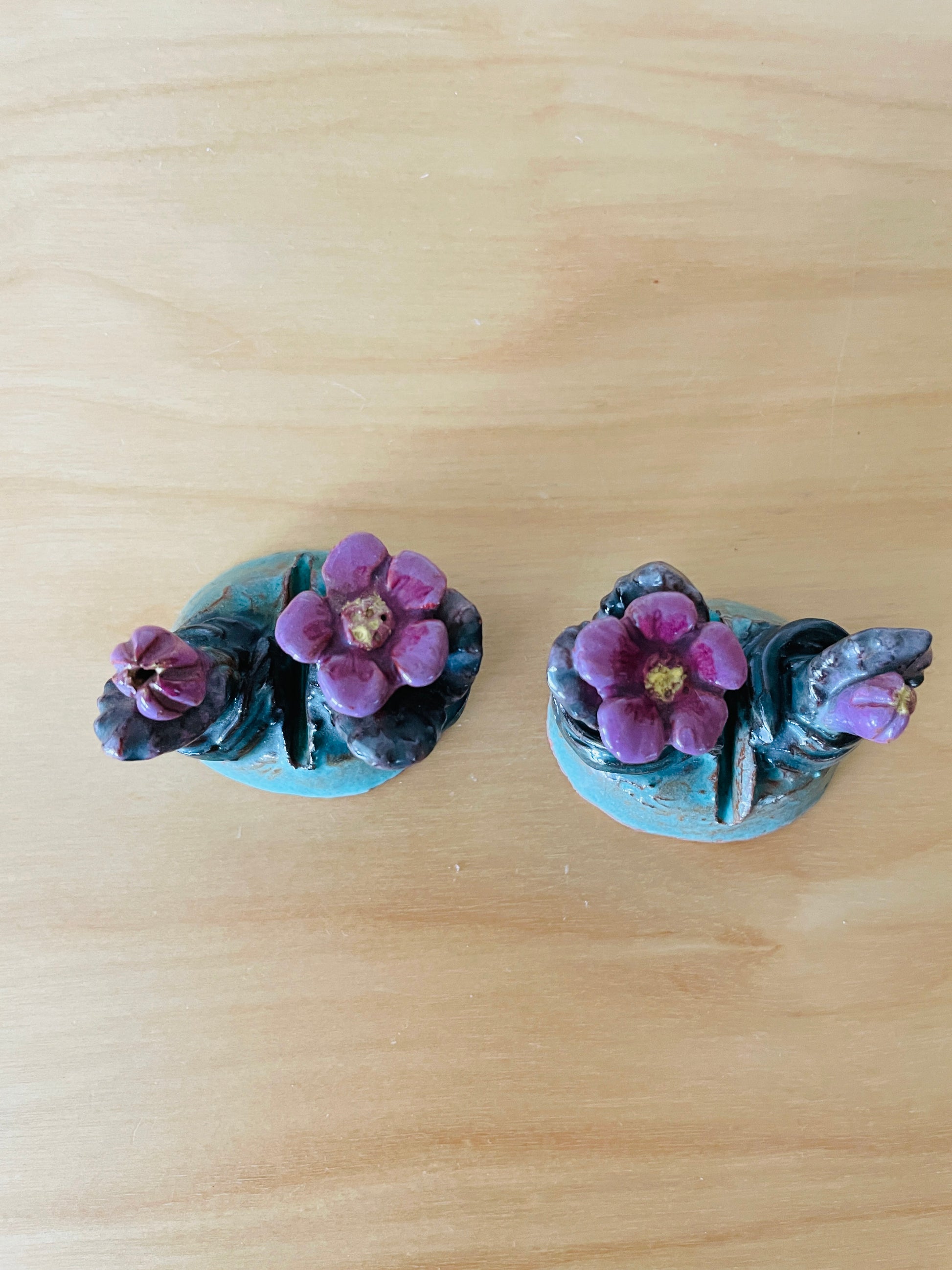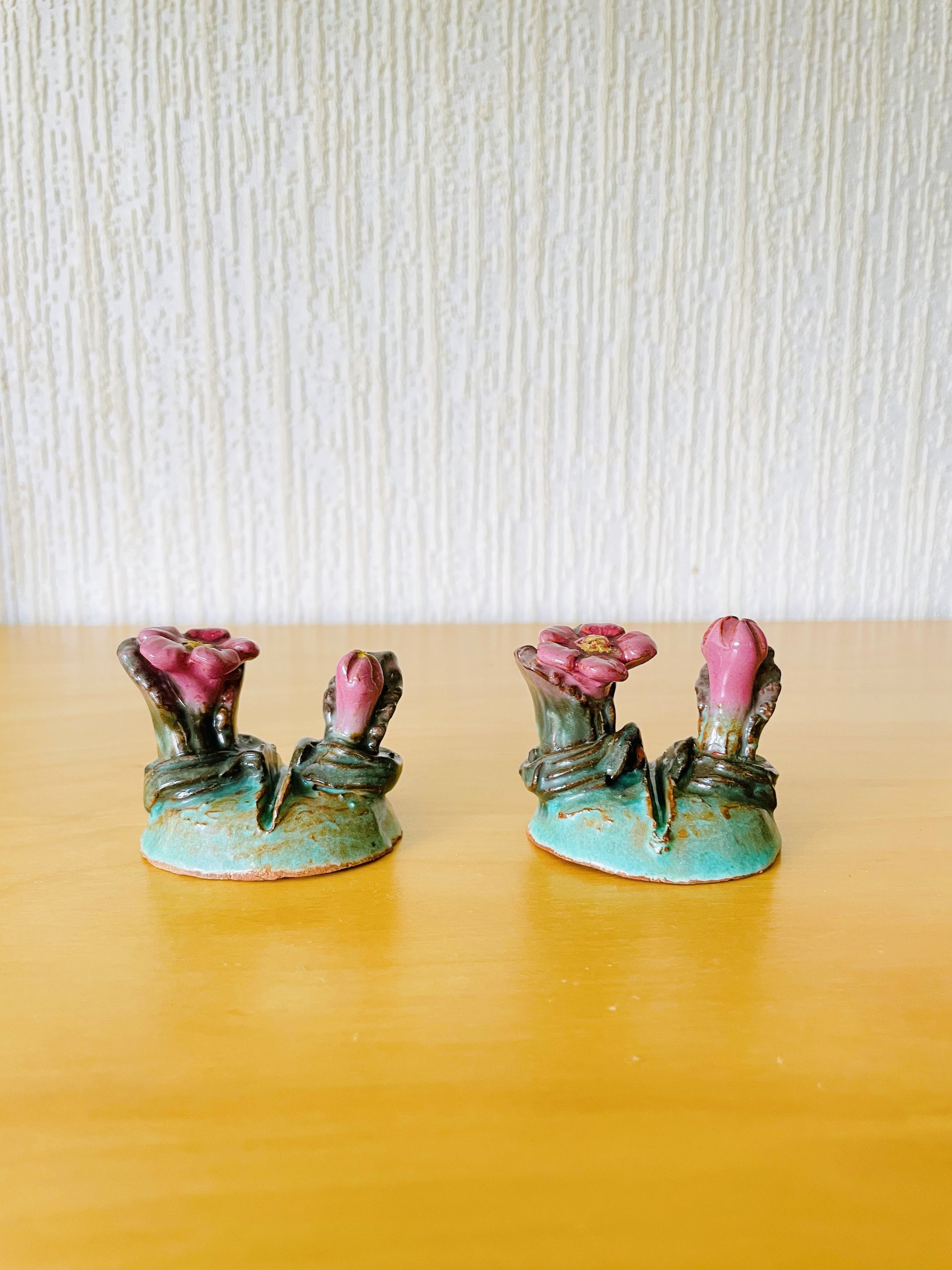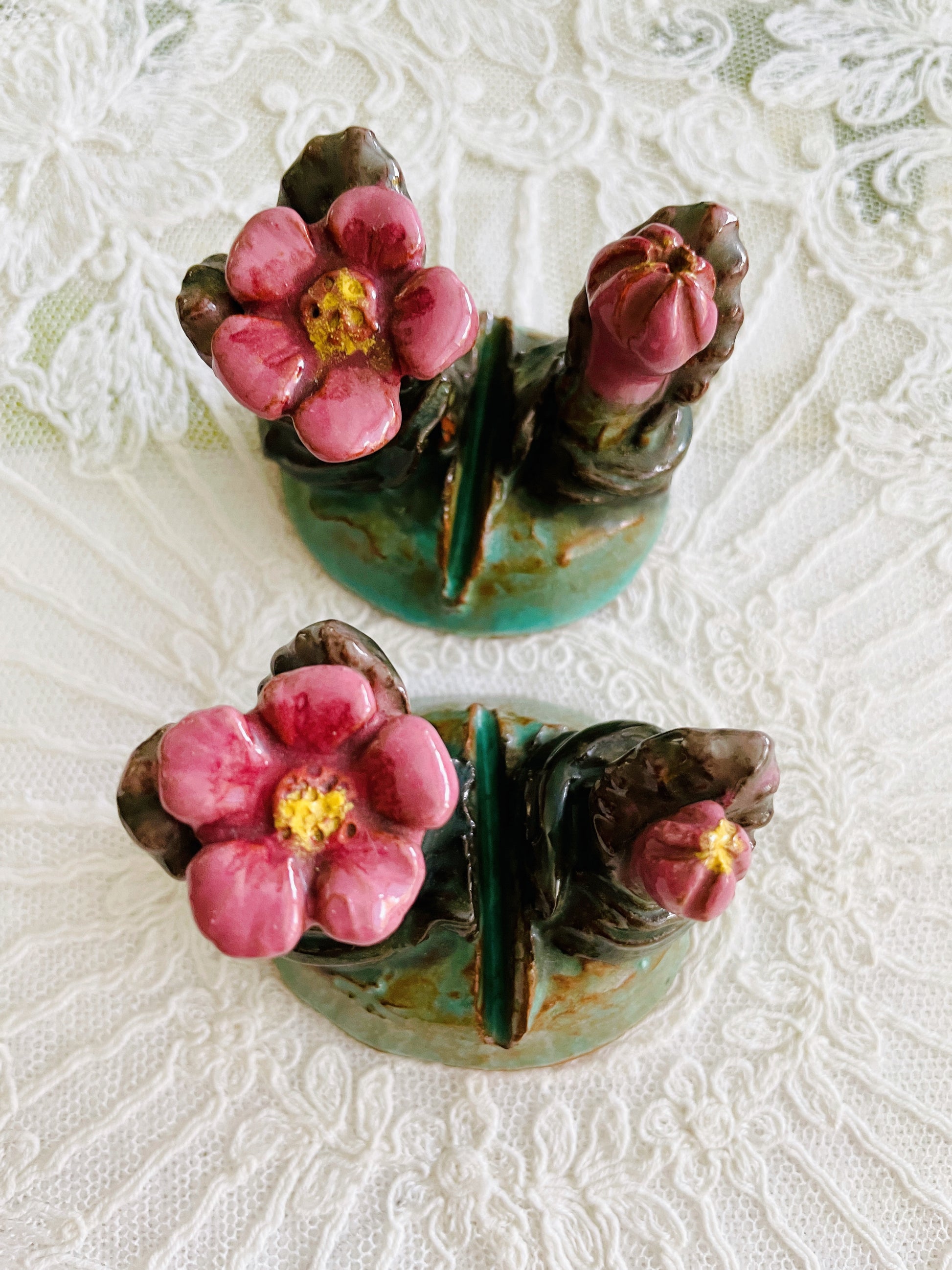 こちらのカトラリーレストは2輪のピンクの可愛らしいお花がまるで野に咲くお花がすくっと立っている、その中にカトラリーを置いてテーブルの上に飾っていただくと、とても優しい気持ちになるような、ハンドメイド感があふれる、そんなカトラリーレストです。2個の在庫があります。